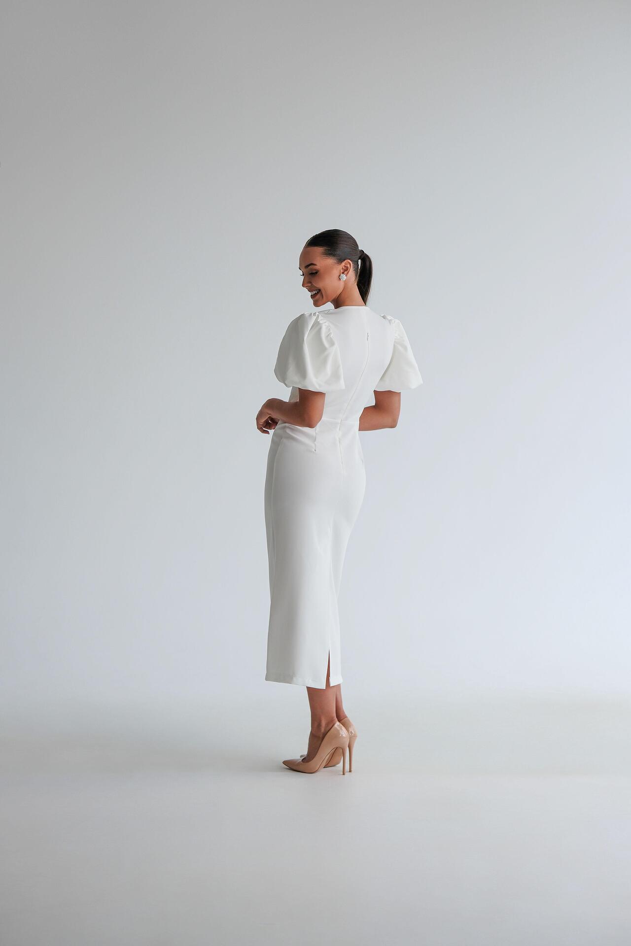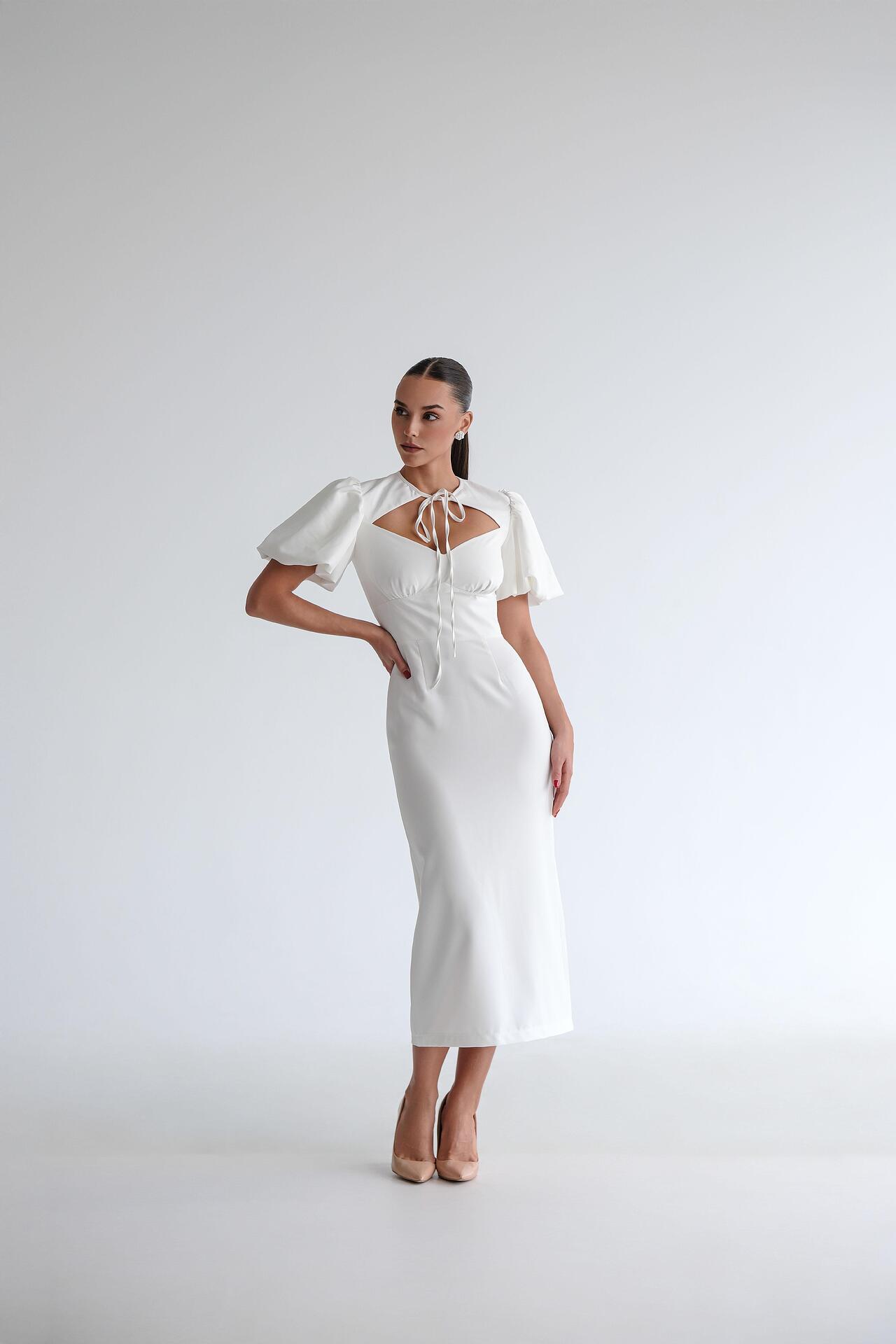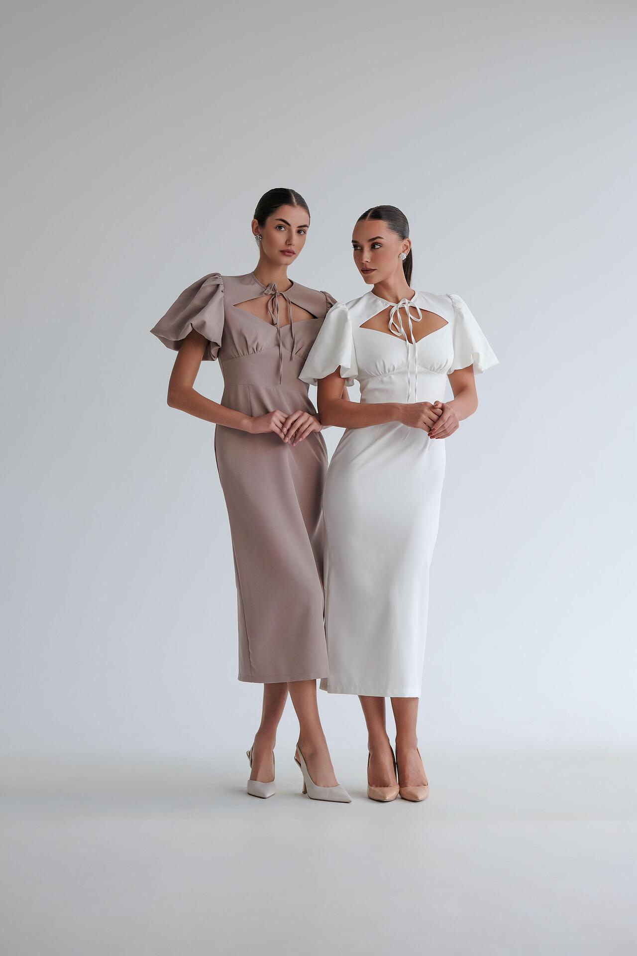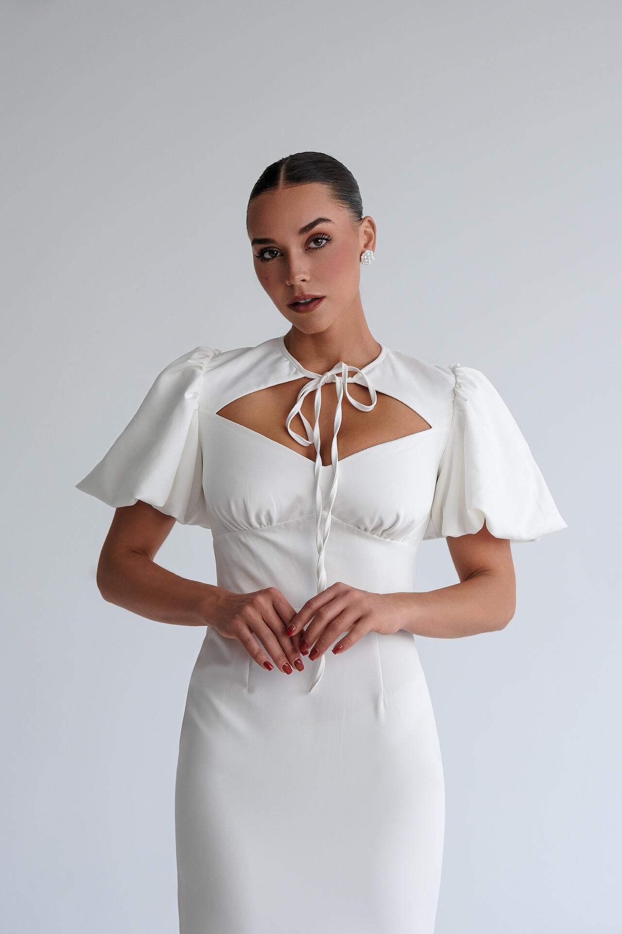 This elegant mid-length dress is made of soft and lightweight high-quality fabric that provides comfort and freedom of movement. The top has an interesting front tie, with short puff sleeves. The model emphasizes the waist very well. It fastens with a zipper at the back. The lower part of the dress creates a sophisticated and elegant silhouette.