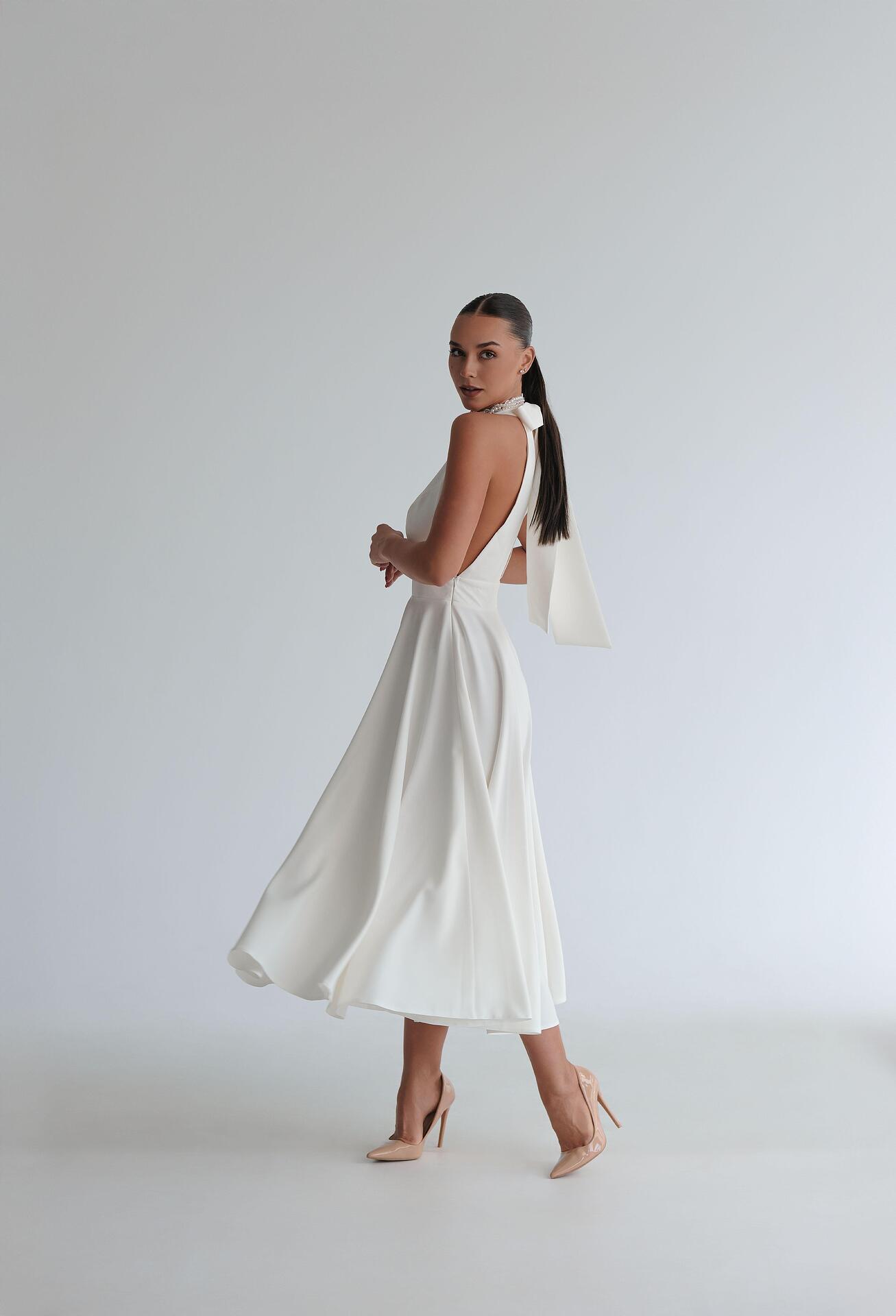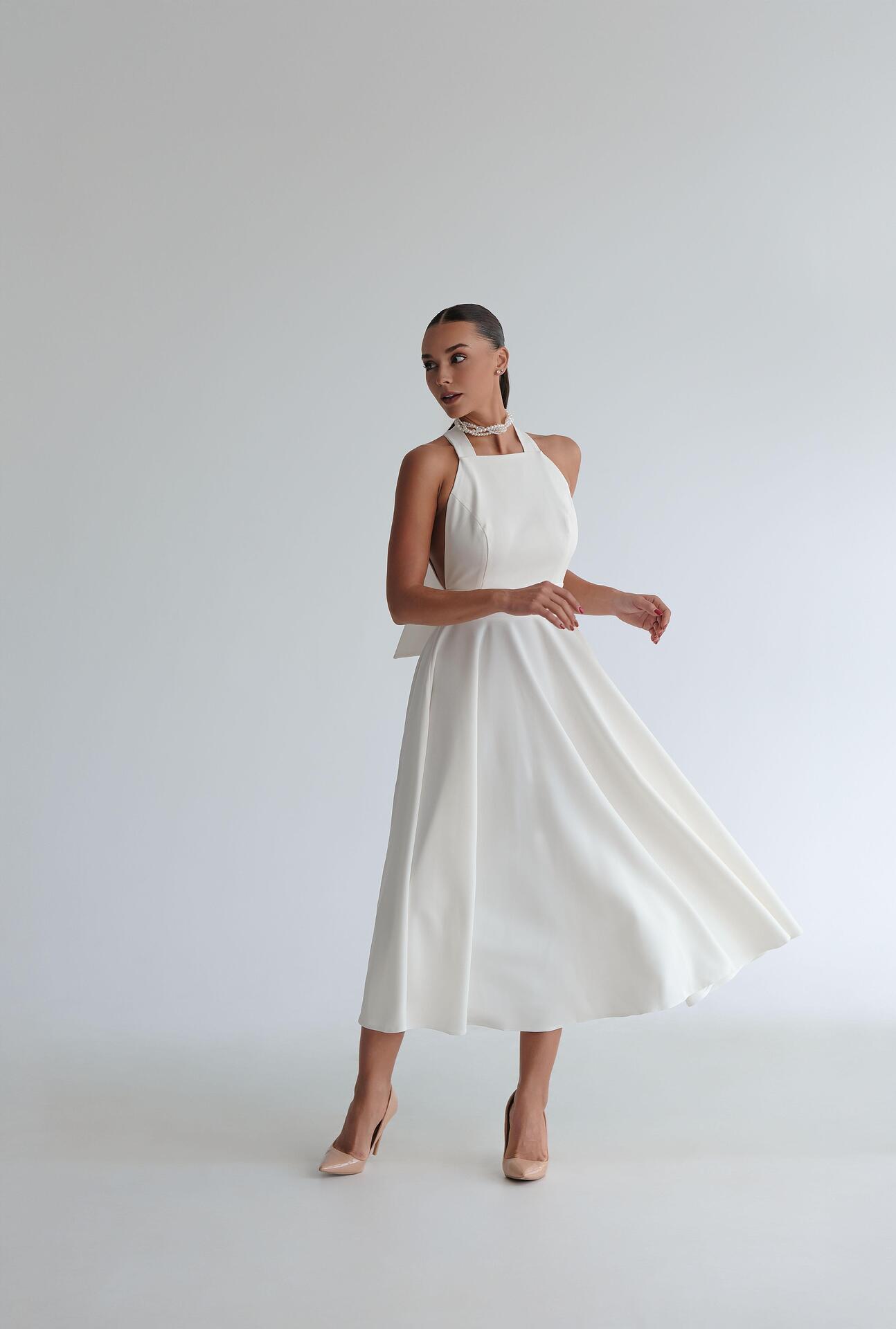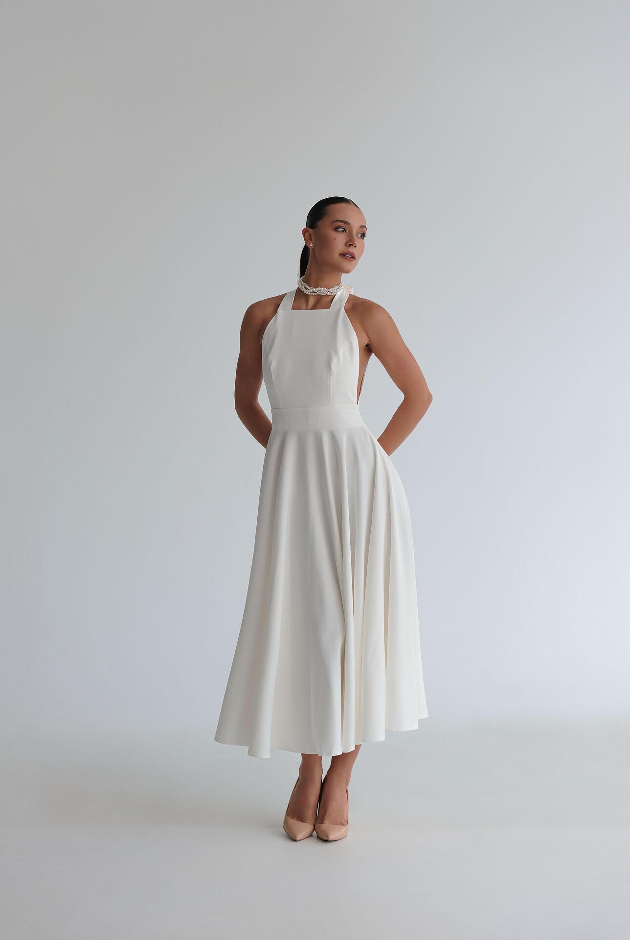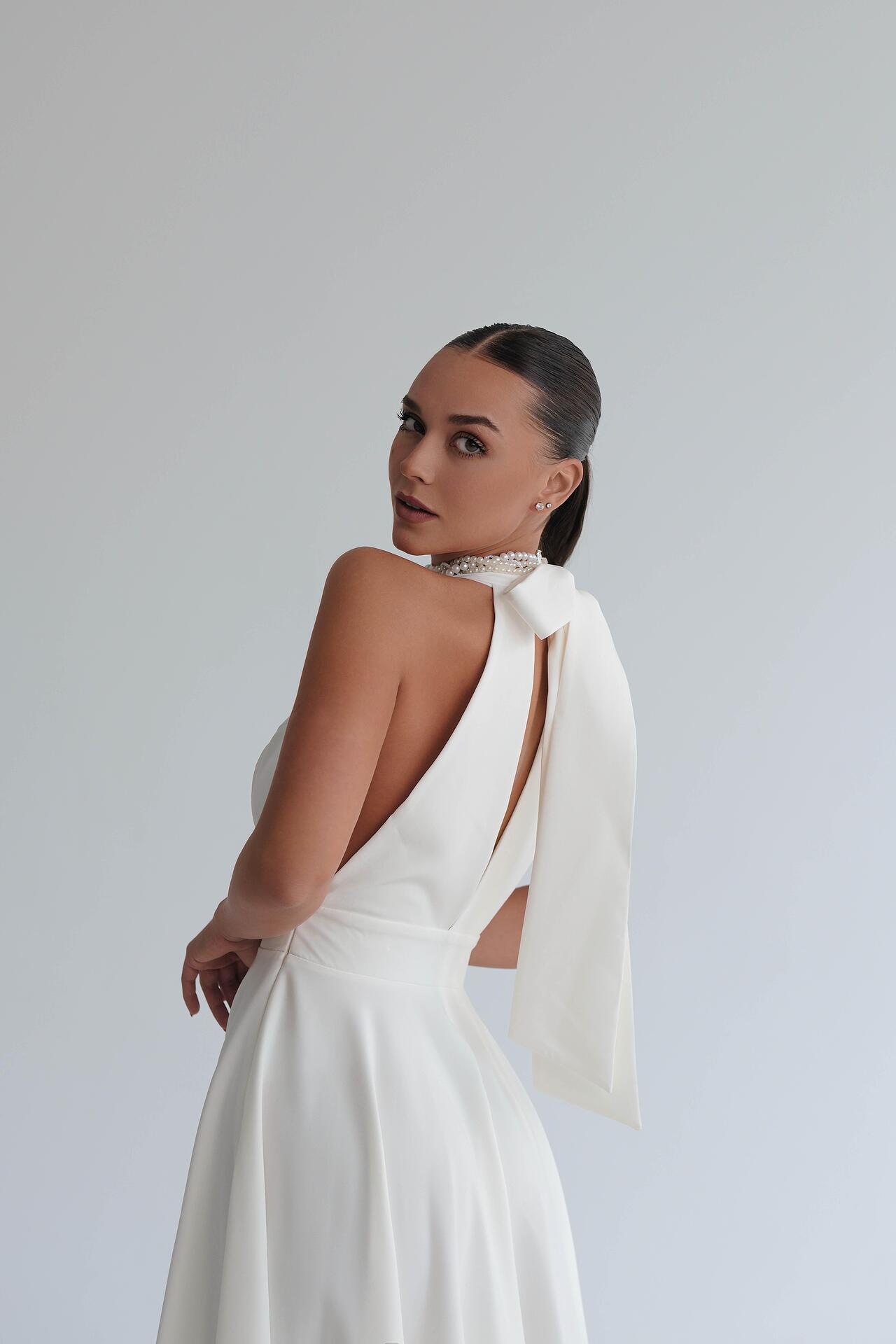 A classic long dress with a minimalist design. It has a captivating back and an elegant neck accent that emphasizes the sophistication of the look. The fitted cut fits the figure perfectly, and the freely falling skirt creates a feeling of lightness and elegance. The design is complemented by a beautiful neck detail that adds finesse and sophistication.