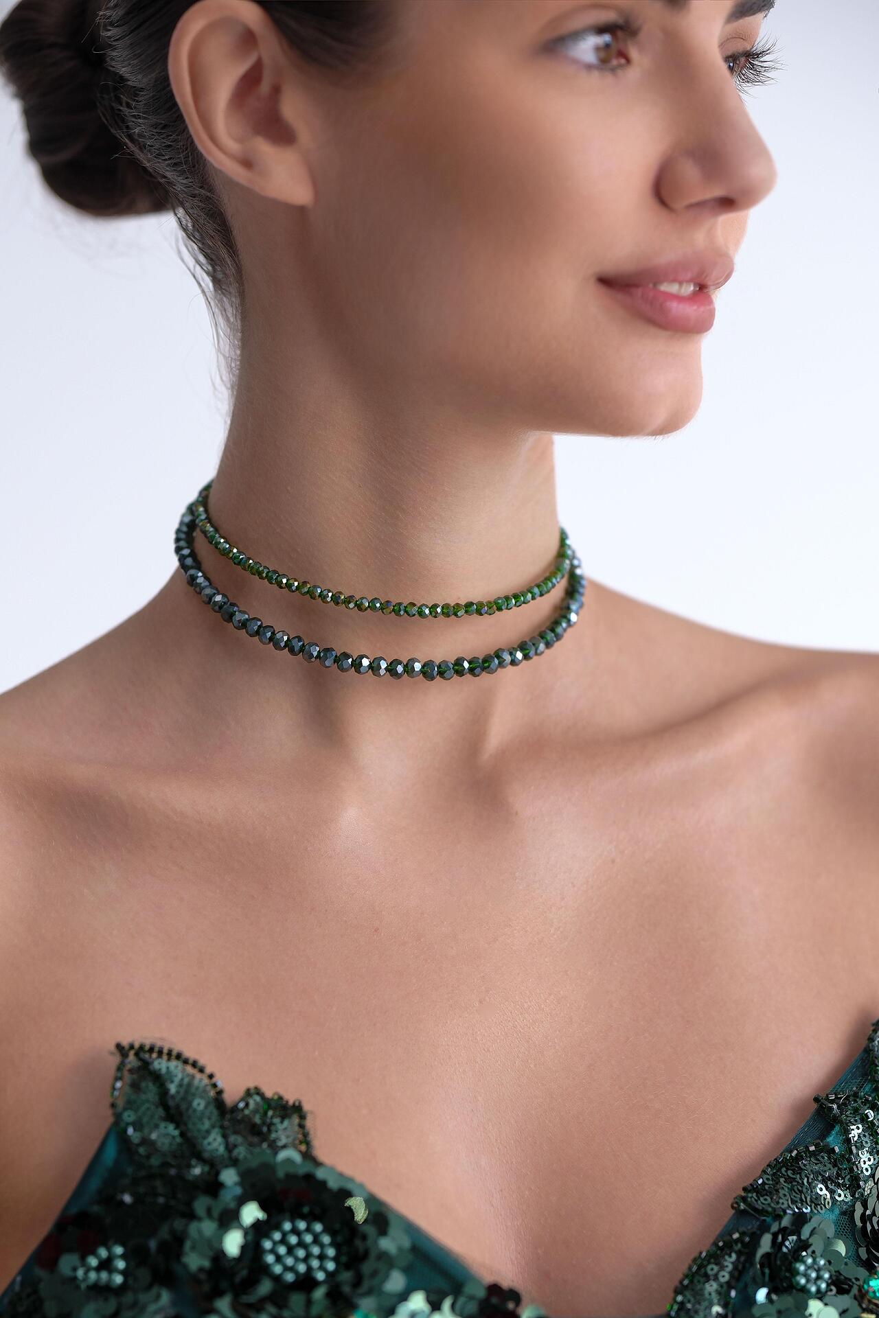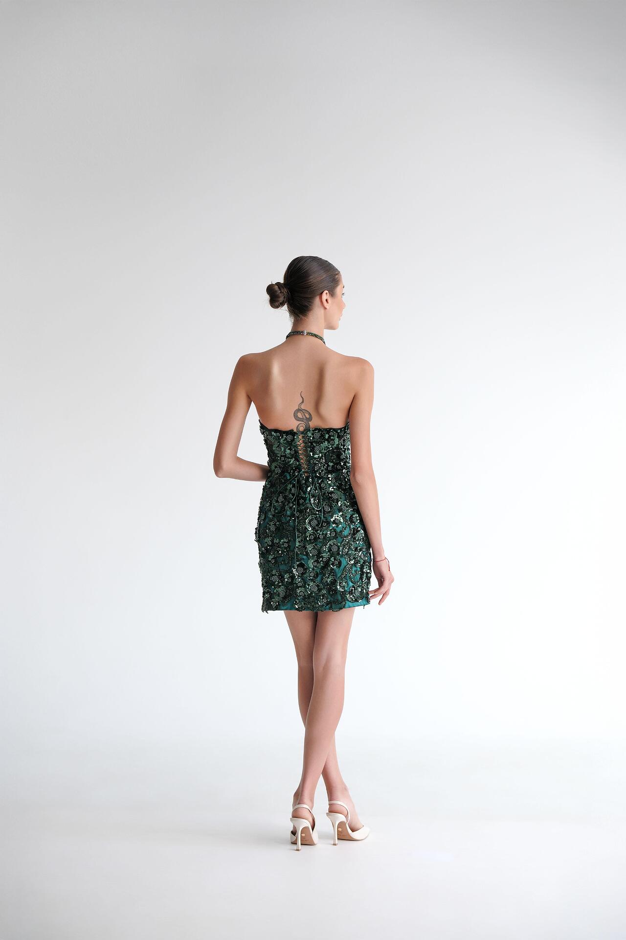 Spectacular corset dress in emerald green. The top has a built-in corset with cups. It has an incredible shiny effect, thanks to the hand-sewn sequin details. The lining is soft and caresses the skin. Strapless.