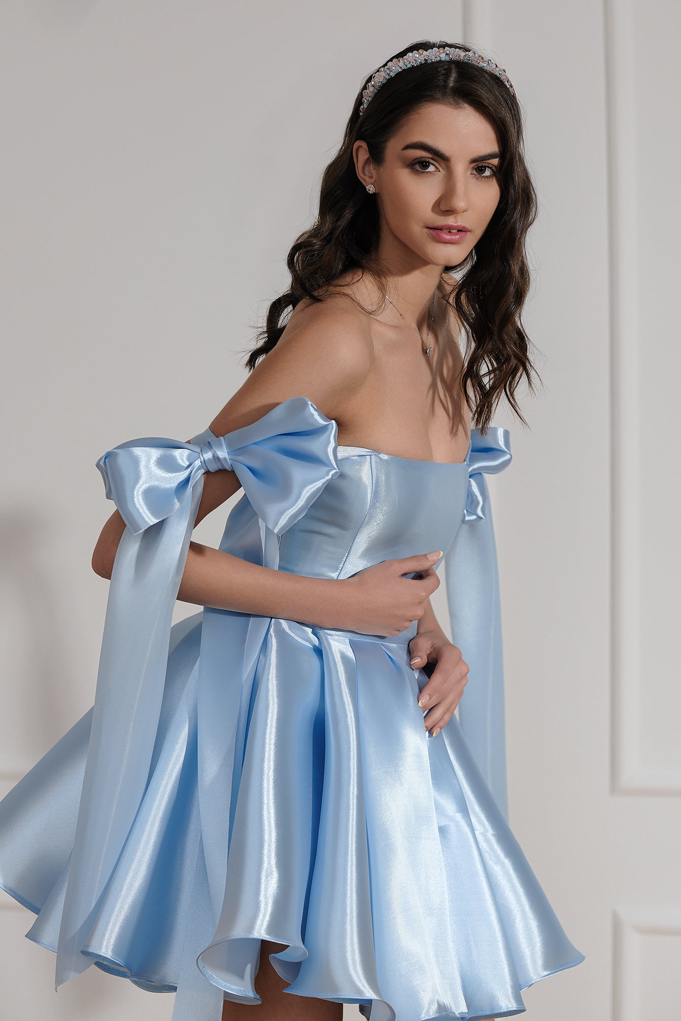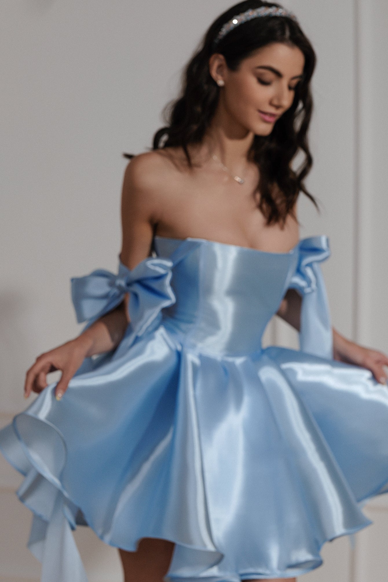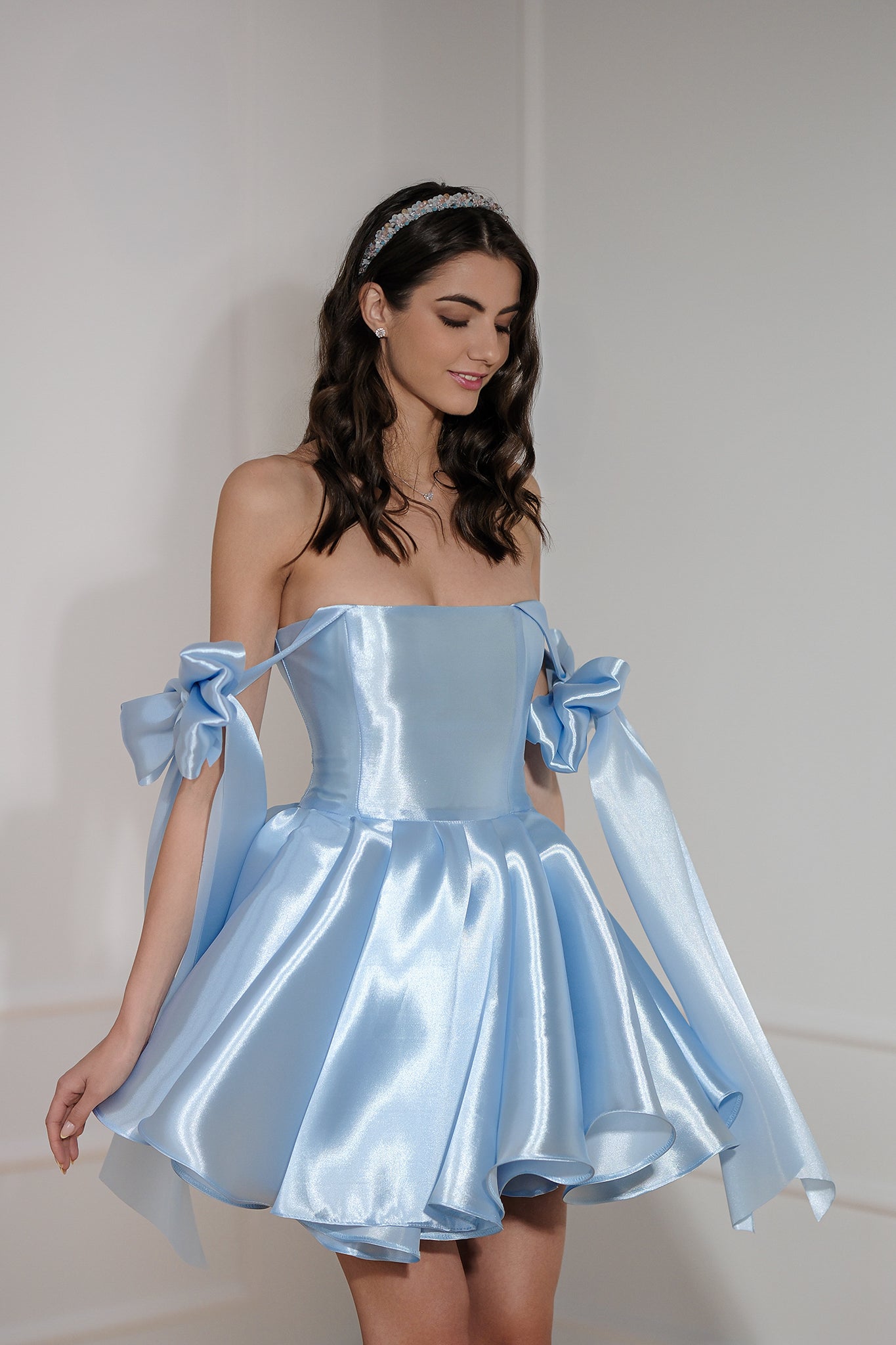 A lovely dress with straps that form ribbons. They can be worn both dropped and standard to hold. The upper part of the dress is corseted, it is cut out at the bottom. It is made of high-quality fabric - organza with a satin sheen. It is worn without a bra, it has built-in cups. It is fastened at the back with laces. The length is to the middle of the thigh. It can be made in another color or according to the individual measurements of the client for an additional payment of 15% of the price.