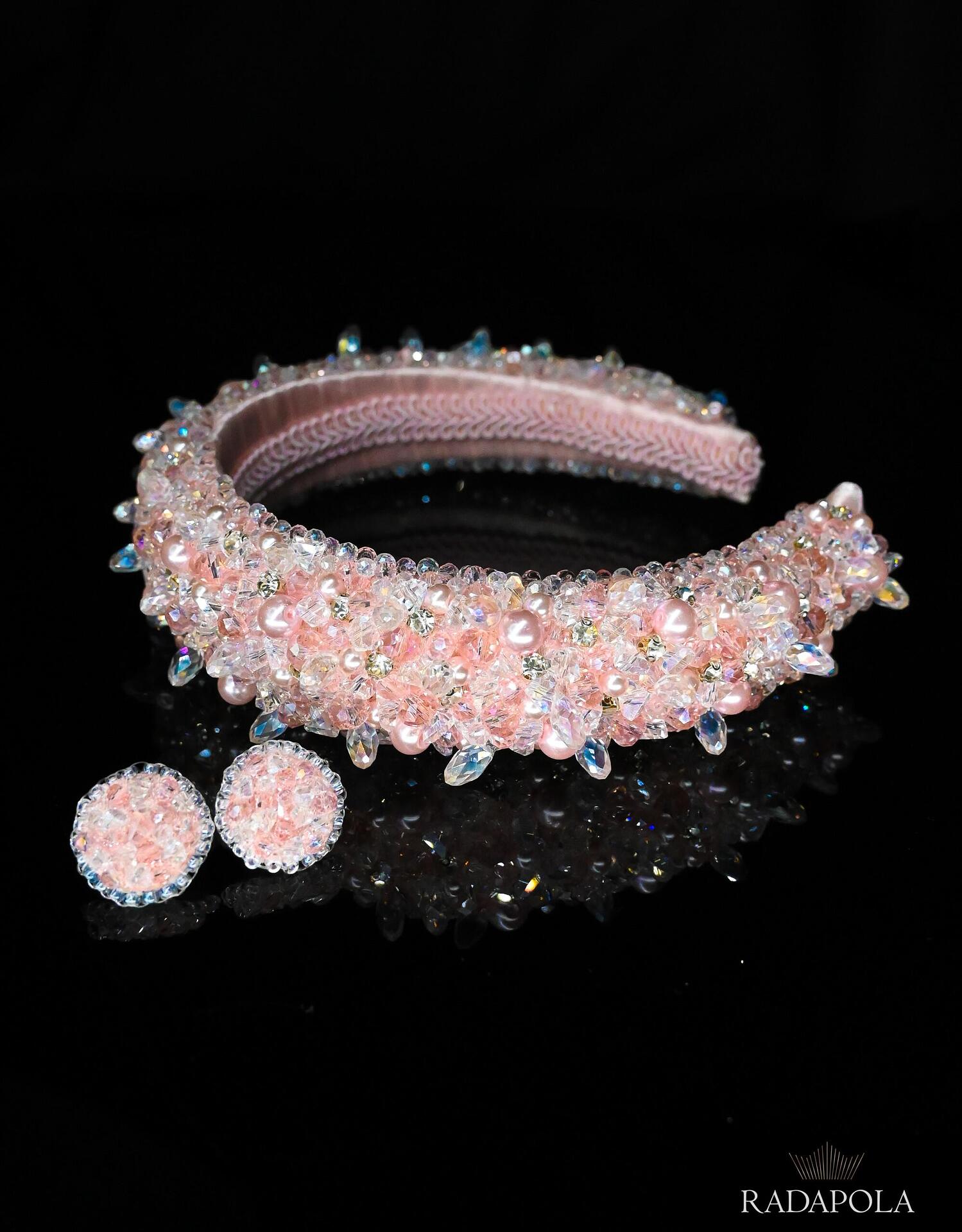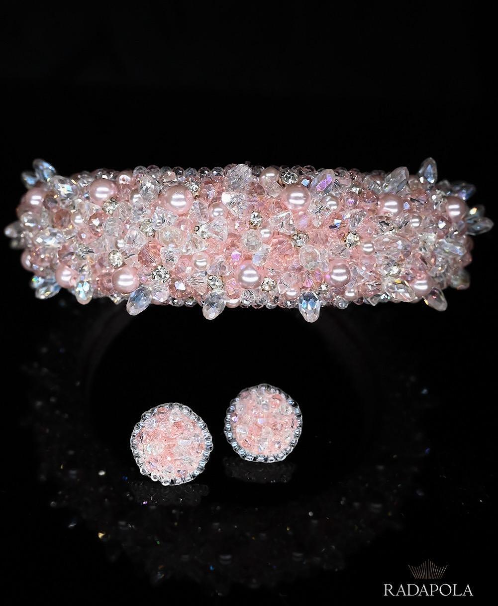 A set of delicate tiara and earrings. Handmade from high-quality materials. The size of the tiara is universal to be comfortable for everyone, and the earrings are fastened with a screw.