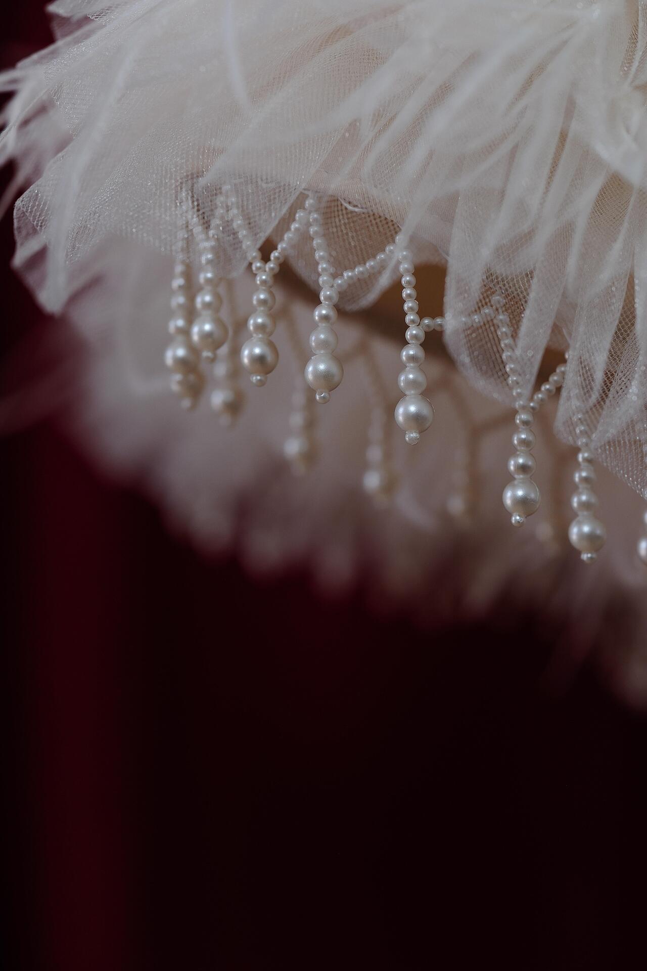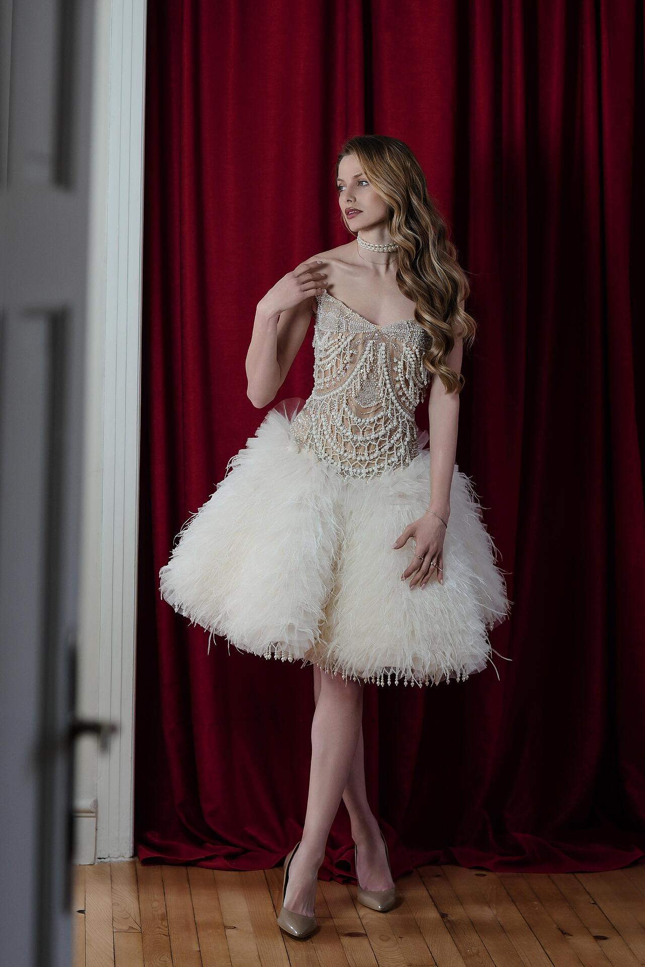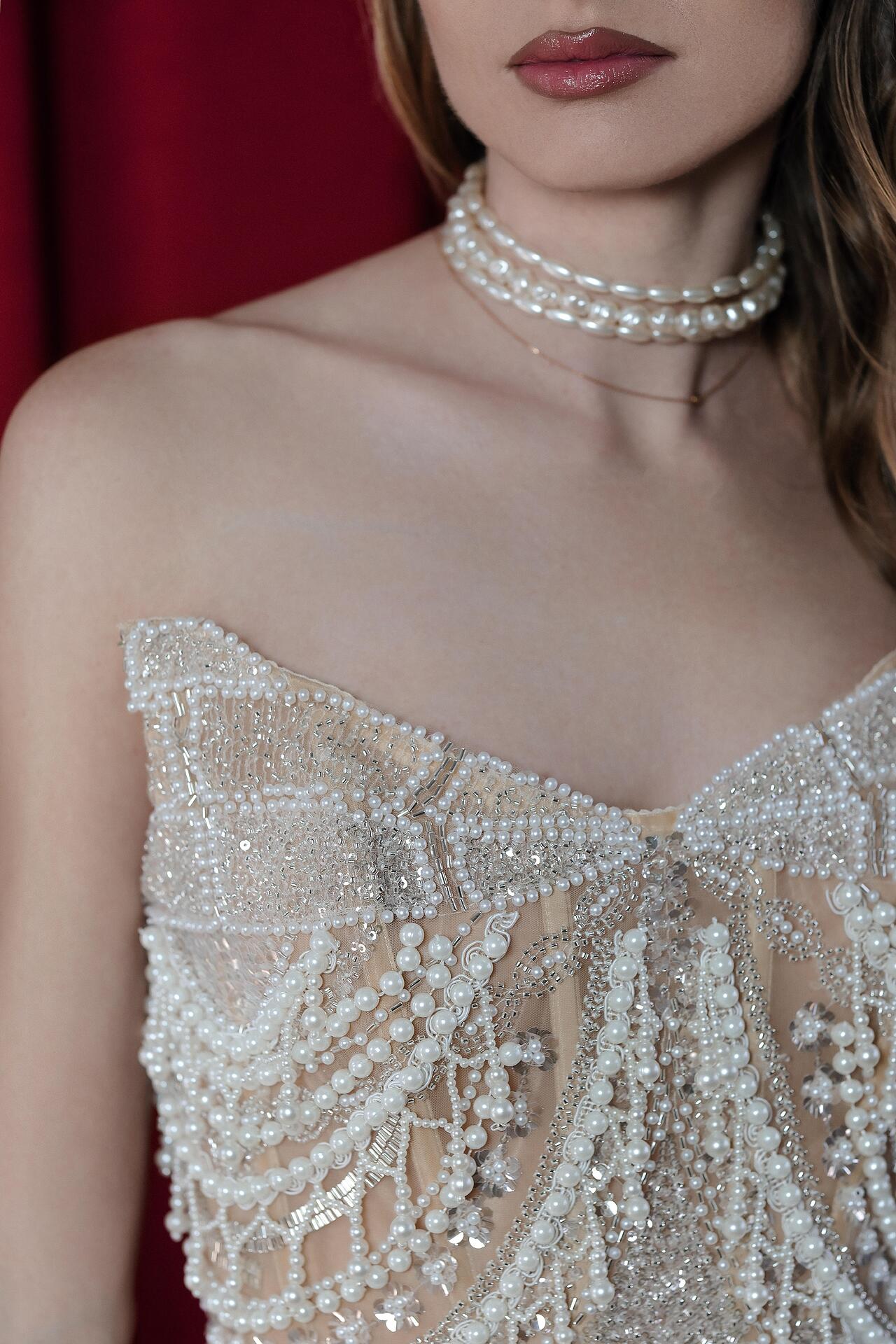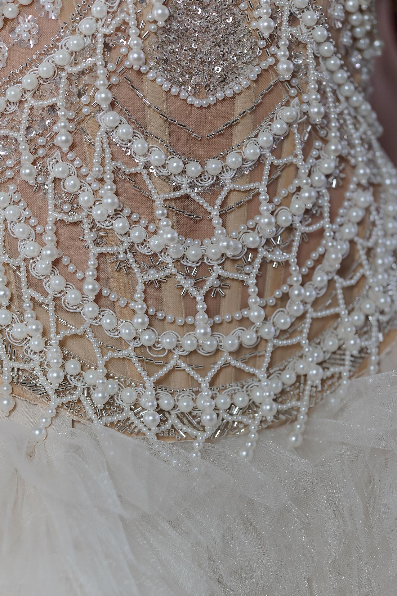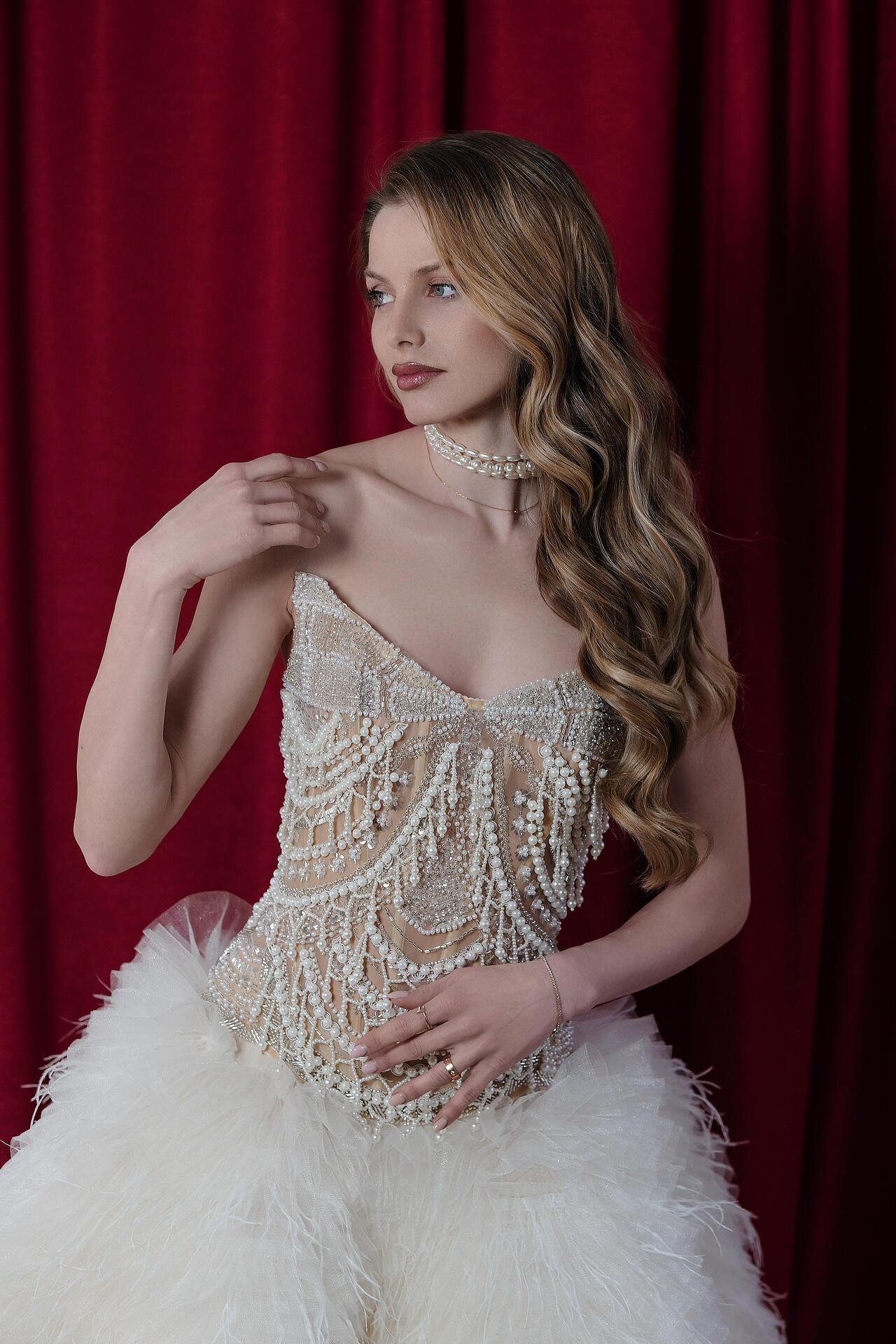 The corset is made of a transparent base, creating a second skin effect, and is hand-decorated with strands of pearls and crystals. The finely shaped cups provide good bust support, and the corset lacing at the back guarantees a perfect fit to the body. The lush skirt is made of multi-layered tulle, finished with natural feathers, which add lightness and grace to every movement. There are delicate pearls hanging along the lower edge of the skirt. The combination of corset and voluminous skirt creates a balanced silhouette, emphasizing the waist.