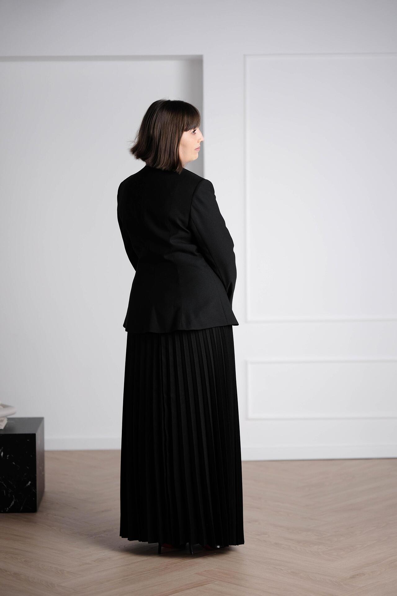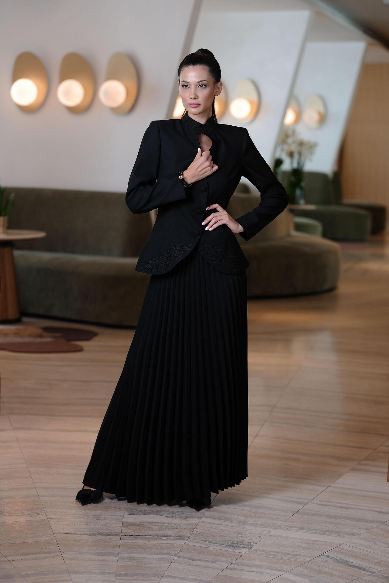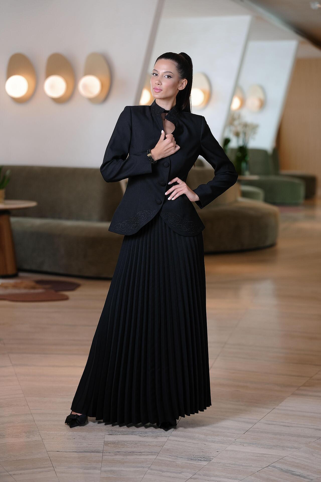 Elegant suit consisting of a jacket and a long skirt. The jacket has a clean silhouette and a high collar with embossed details on it. The long pleated skirt is comfortable to wear and gives a sophisticated look. A perfect choice for formal events, business meetings or special occasions where style and comfort are important.