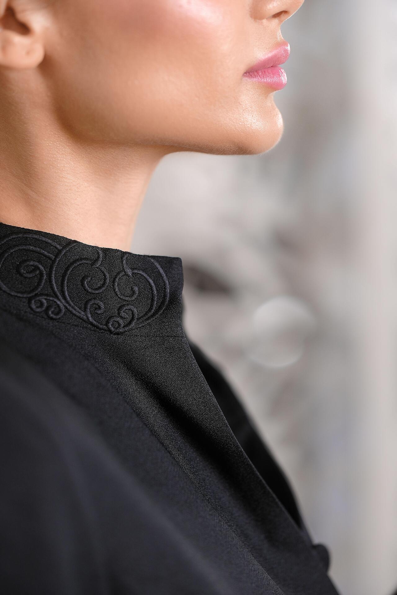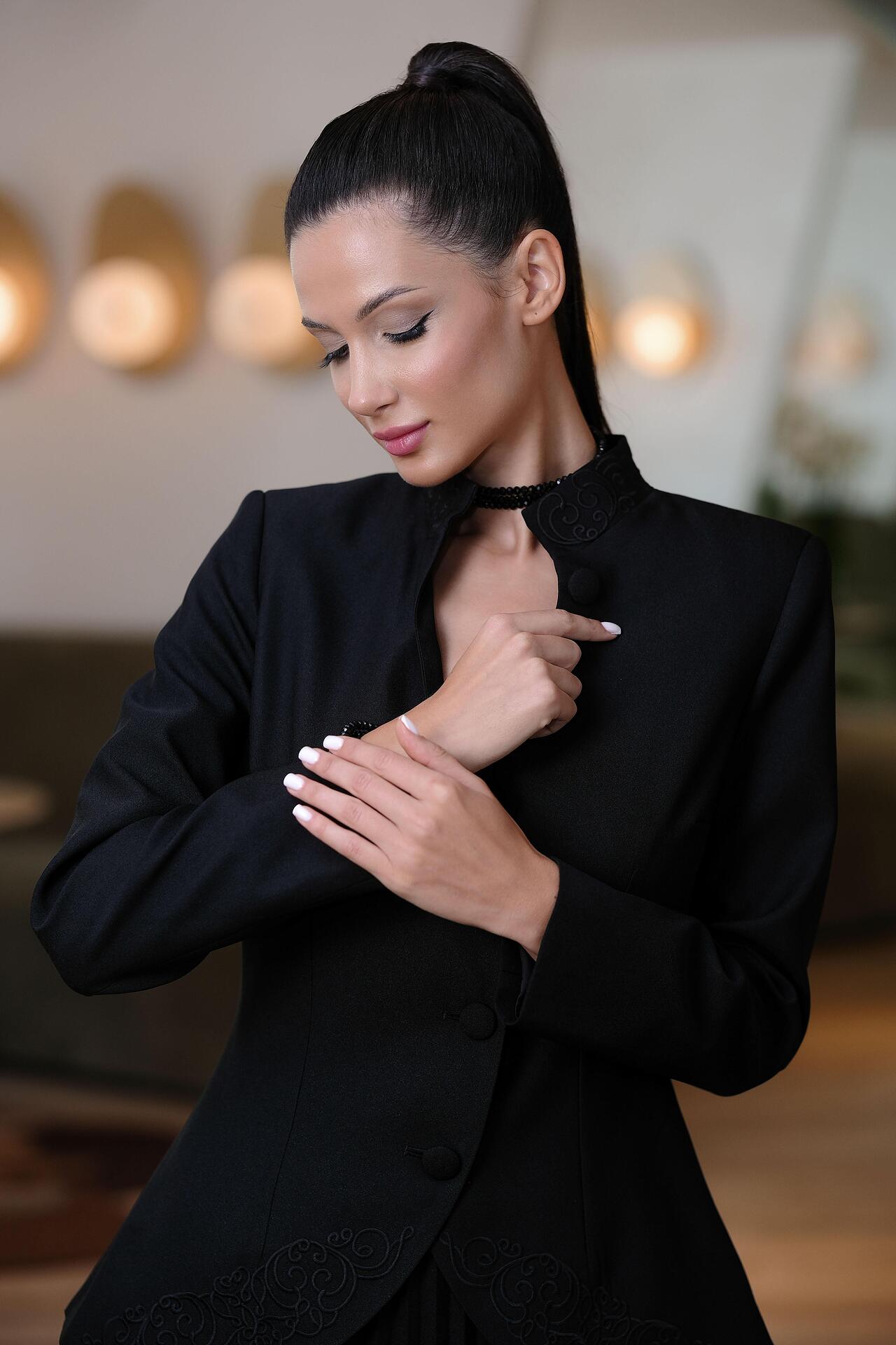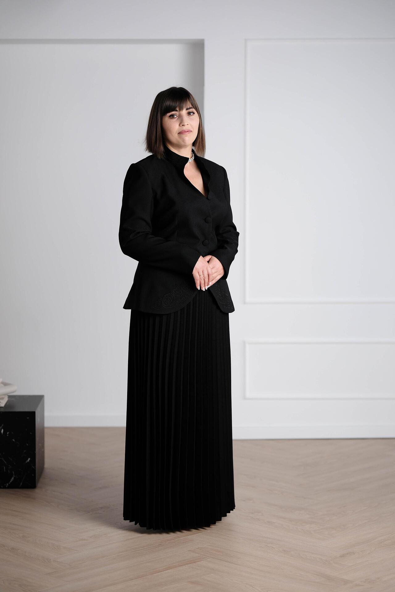 Elegant suit consisting of a jacket and a long skirt. The jacket has a clean silhouette and a high collar with embossed details on it. The long pleated skirt is comfortable to wear and gives a sophisticated look. A perfect choice for formal events, business meetings or special occasions where style and comfort are important.