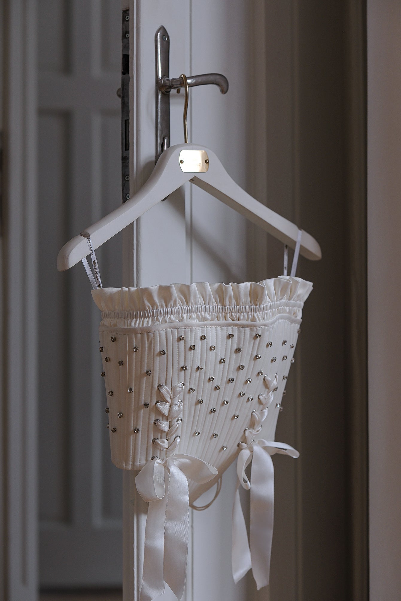 Luxurious corset, made with light lining and fine vertical wadding for a shaping effect. It is decorated with small shiny stones, evenly spaced across the entire front. The upper edge is finished with a soft, gathered ribbon for an additional romantic accent. On the sides, the corset is fastened with wide satin ties, forming elegant ribbons. The back is also adjustable with ties, allowing for a precise fit to the body. The corset is suitable for both formal occasions and special photo shoots or evening outings. Limited model, completely handmade.