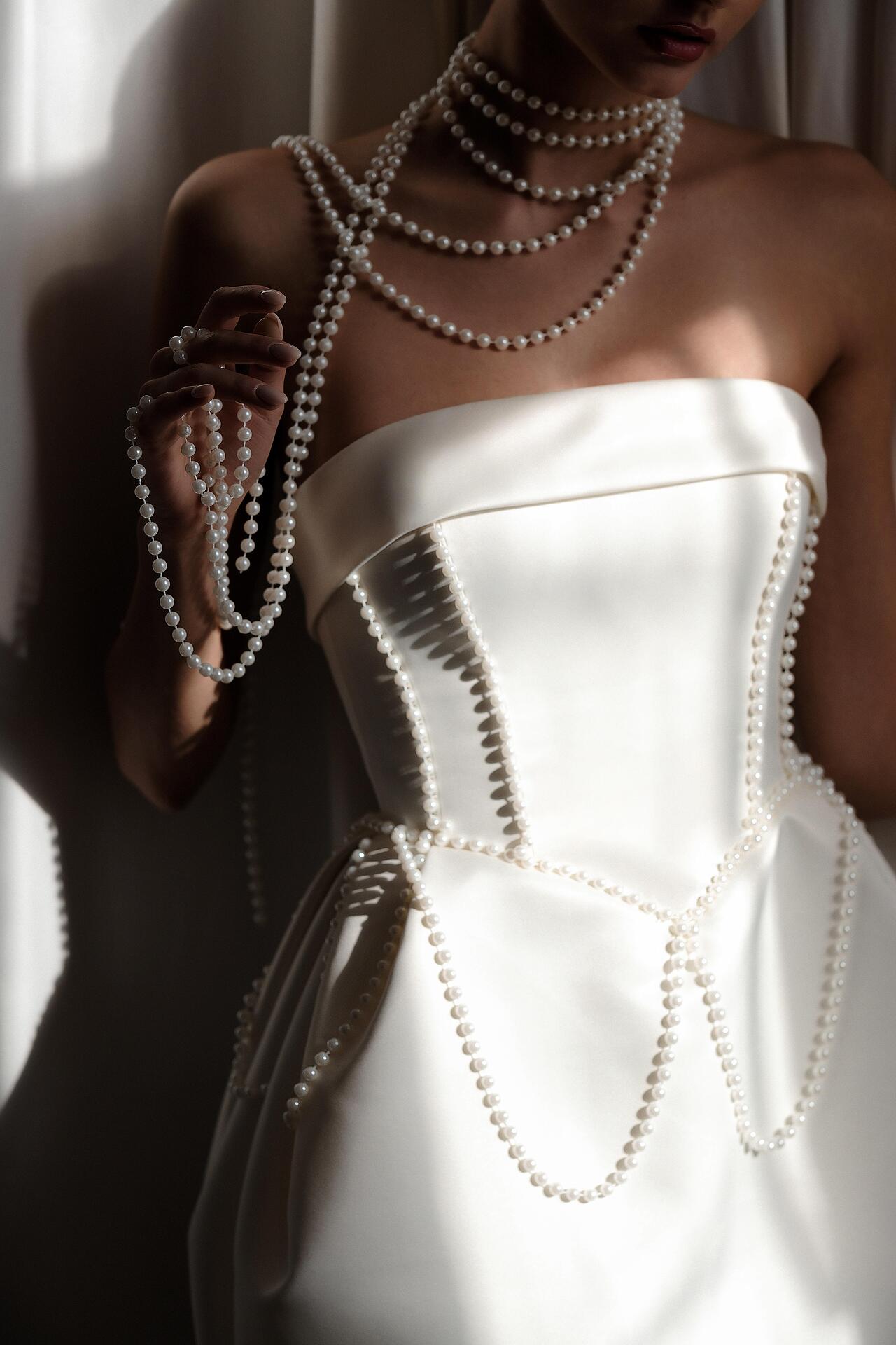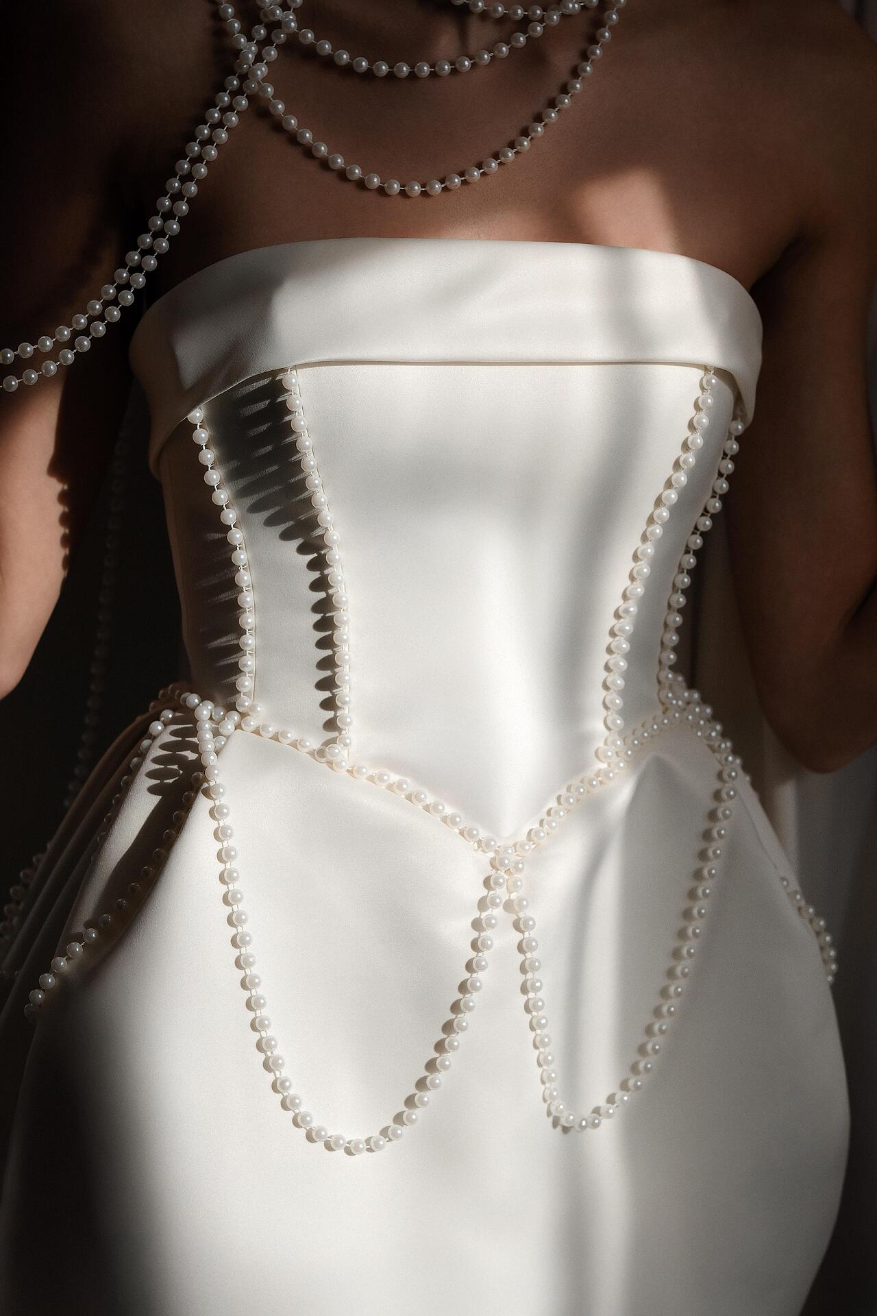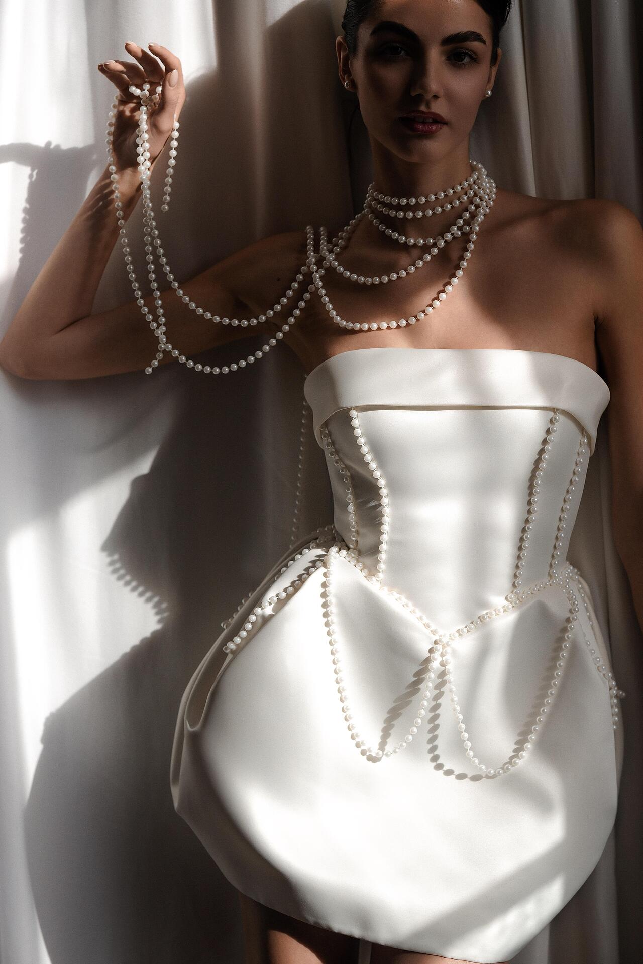 Luxurious, completely handmade short dress with delicate details of chain white pearls. The fabric is high-quality American thick satin, thanks to which the lower part holds its voluminous shape. The dress is strapless, with built-in cups. It fastens with laces at the back. It can be made according to the customer's measurements for an additional fee.
