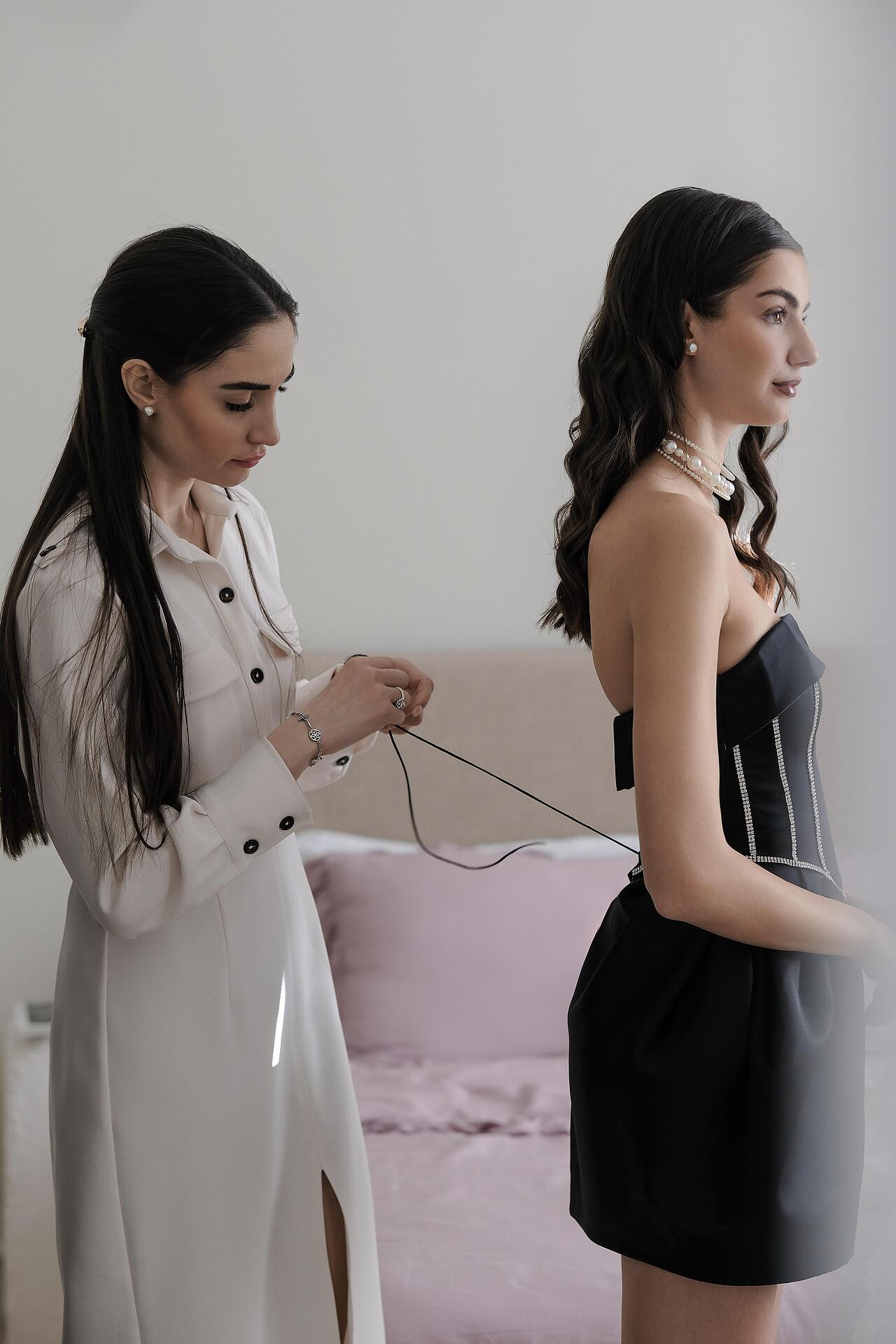Luxurious, completely handmade short dress with delicate details of a chain of sparkling zirconia crystals. The fabric is high-quality American thick satin, thanks to which the lower part holds its voluminous shape. The dress is strapless, with built-in cups. It fastens with laces at the back. It can be made according to the customer's measurements for an additional fee.