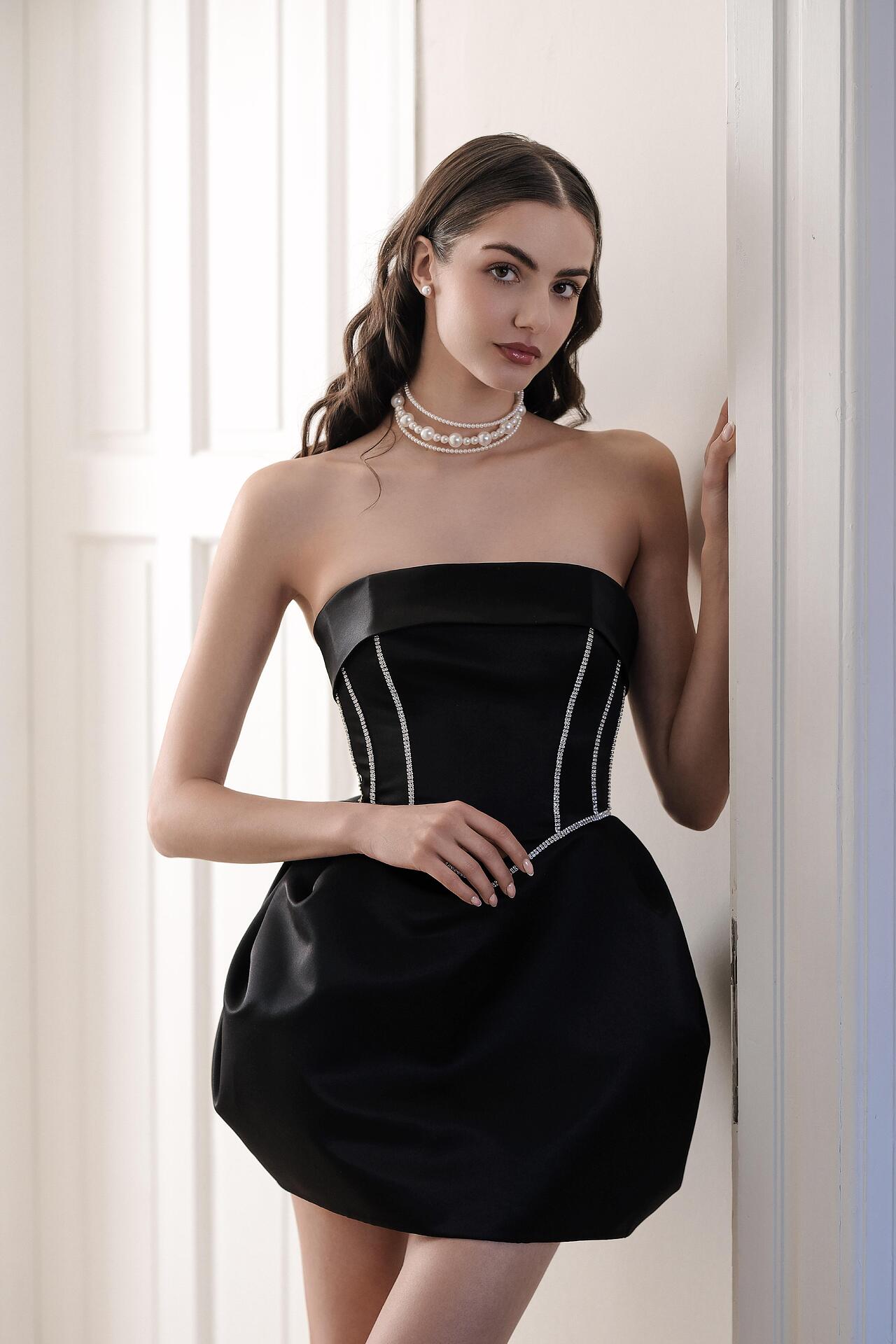 Short American satin dress in black: Sofia