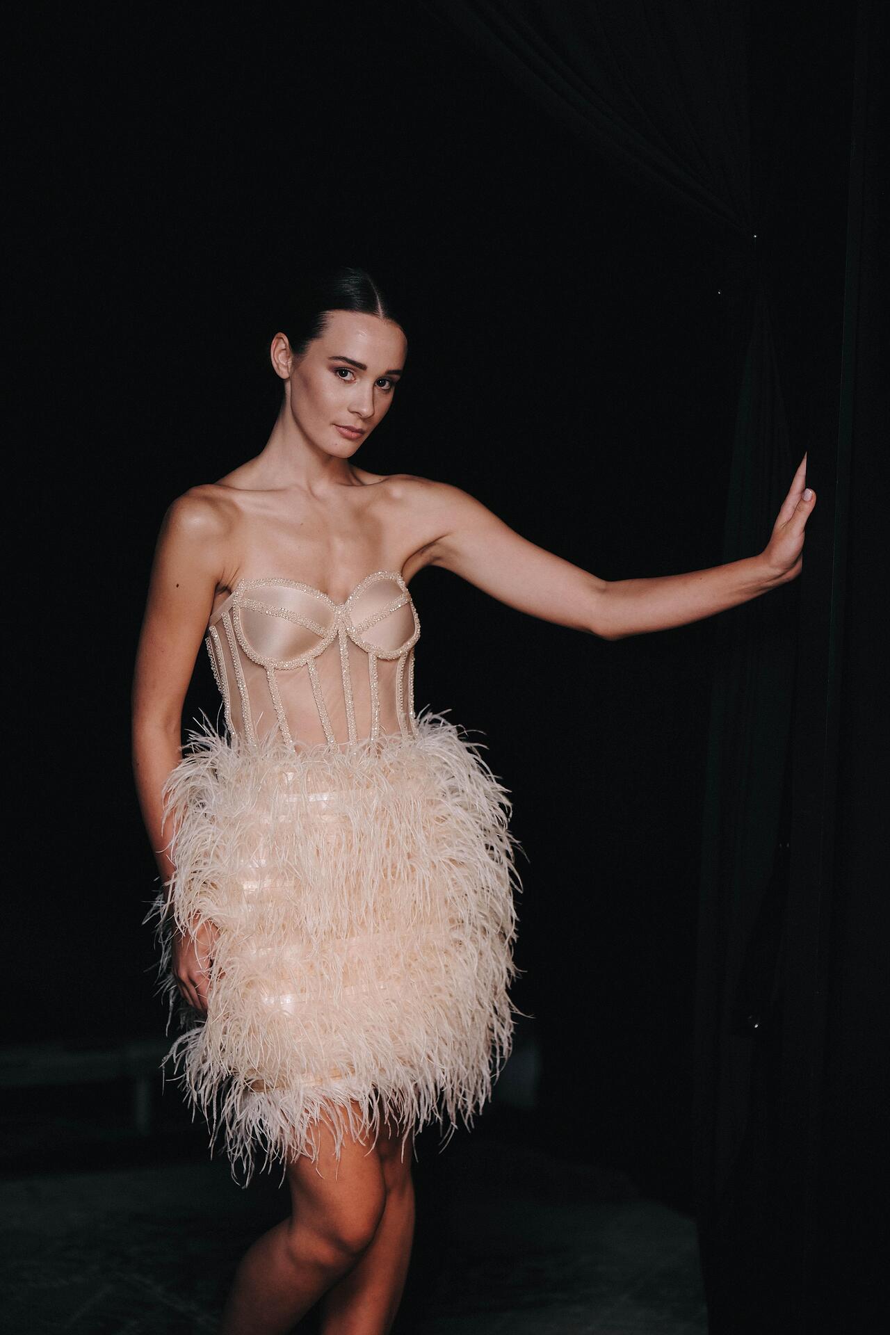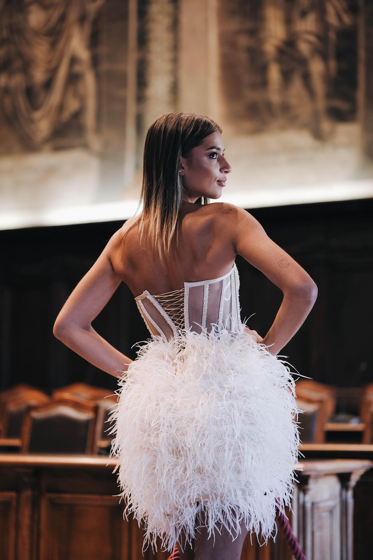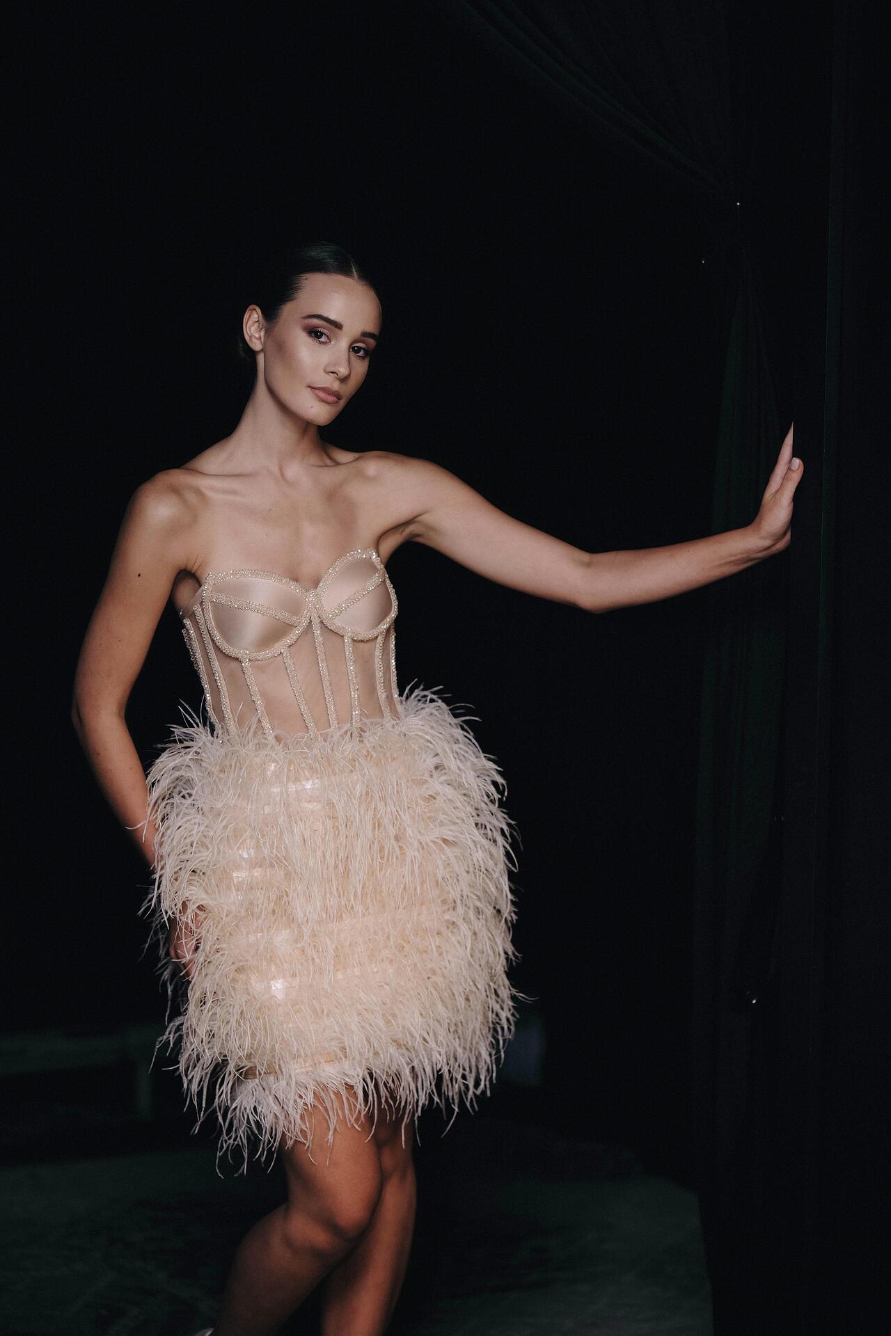 Handmade cocktail dress that creates an unforgettable look. The top of the dress is corseted and decorated with sewn-in sparkling crystals. The cups hold the bust very well, even when it is larger, thanks to their shape. The bottom part is a soft skirt with sewn-in feathers that creates a slight volume. It can be made according to your measurements.