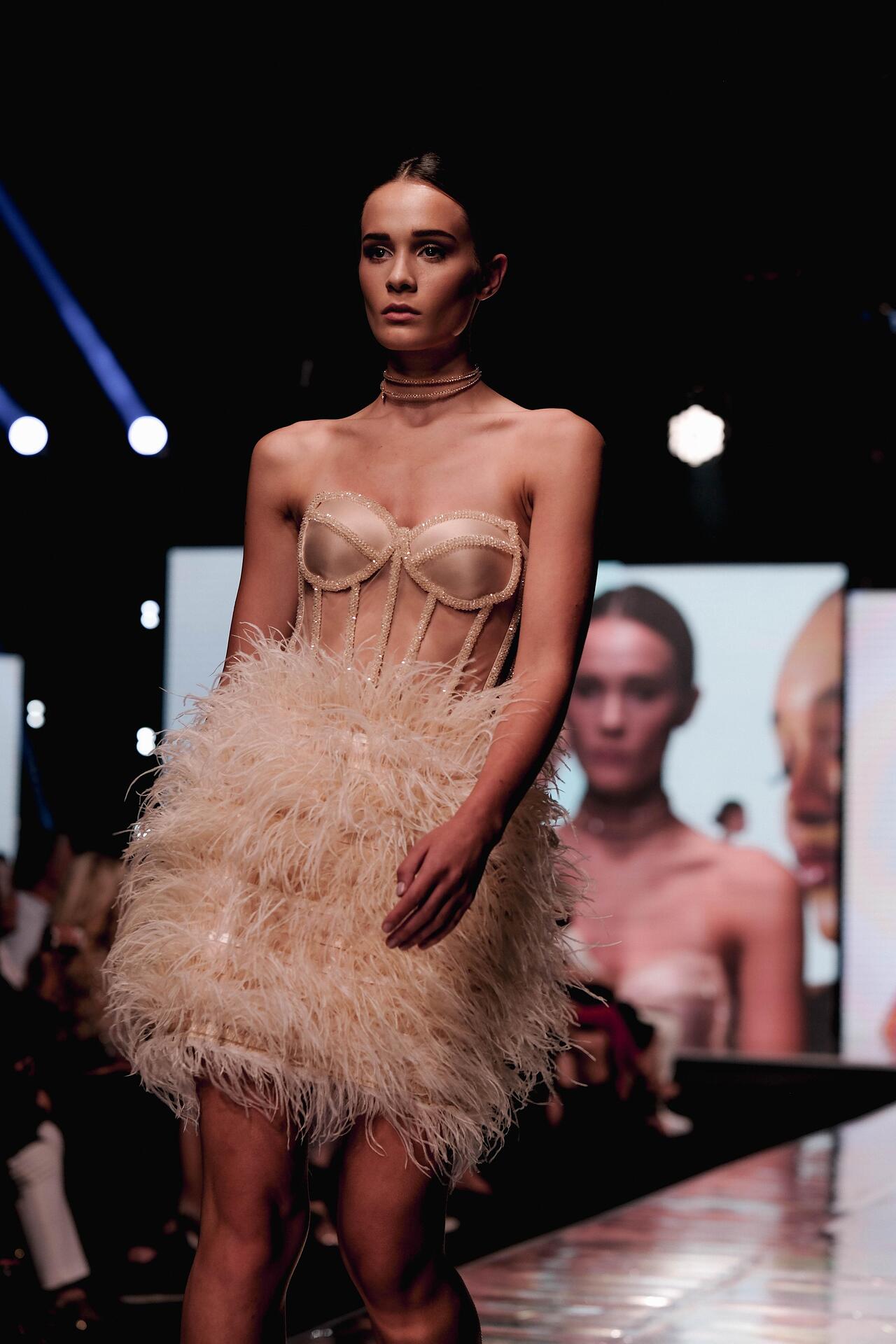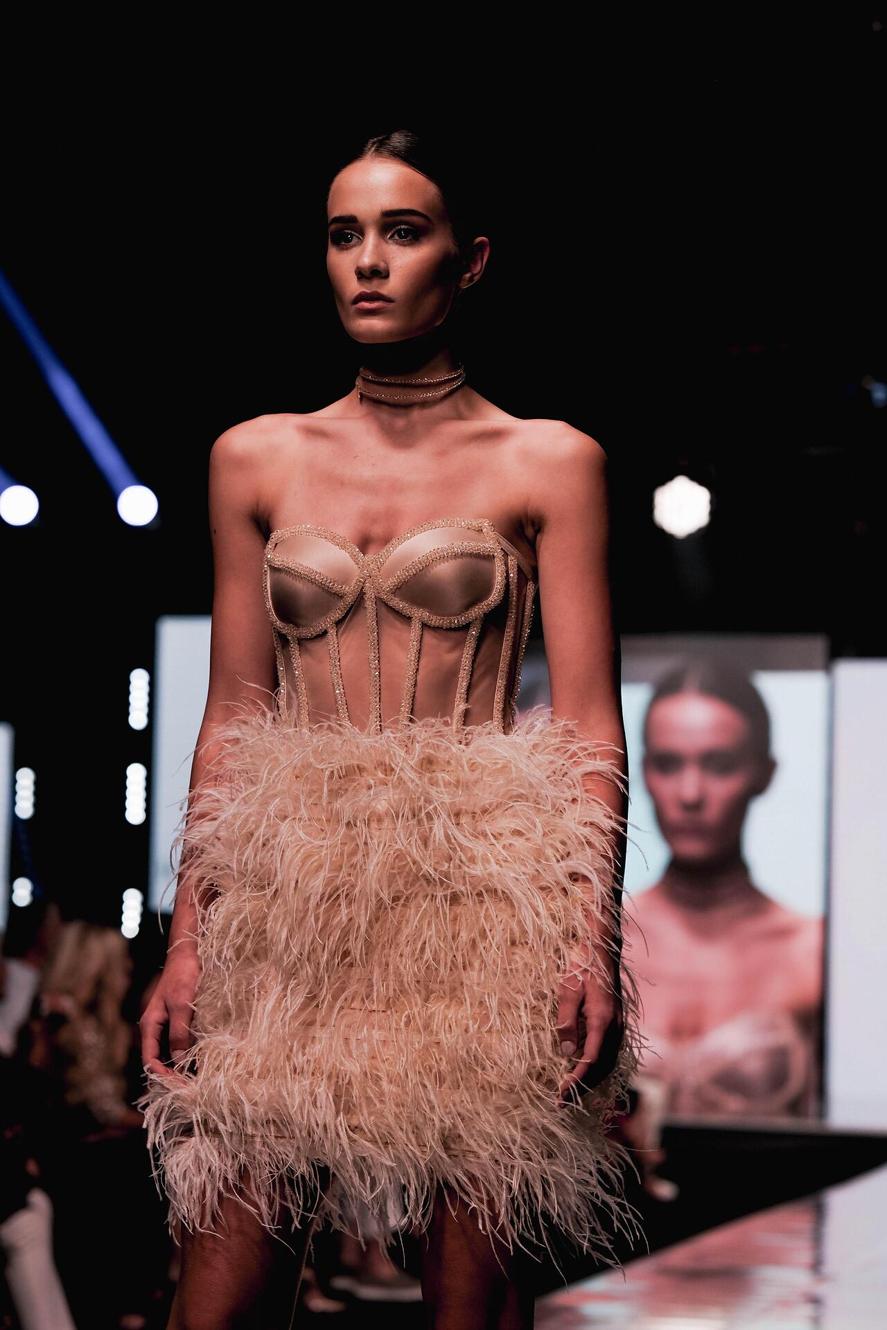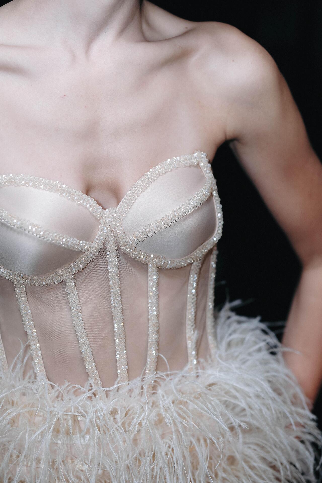 Handmade cocktail dress that creates an unforgettable look. The top of the dress is corseted and decorated with sewn-in sparkling crystals. The cups hold the bust very well, even when it is larger, thanks to their shape. The bottom part is a soft skirt with sewn-in feathers that creates a slight volume. It can be made according to your measurements.