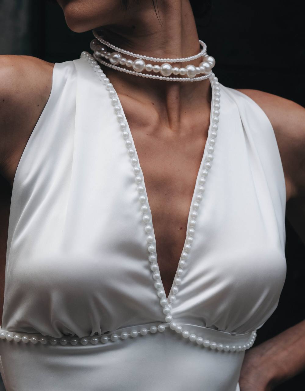 Luxurious dress, decorated with pearls all over, combines elegance and a contemporary look. With a V-neckline, flowing into thick straps, intertwined at the back. The clean cut ensures a comfortable fit and a stylish look. The dress is worn without a bra.