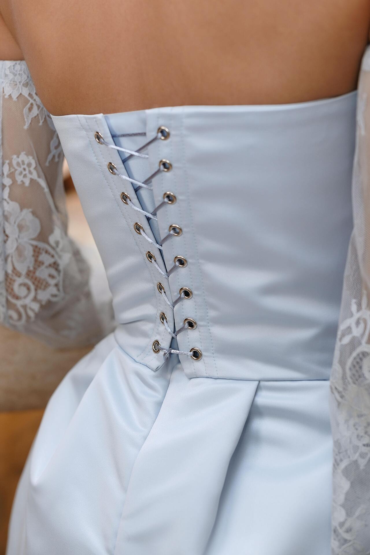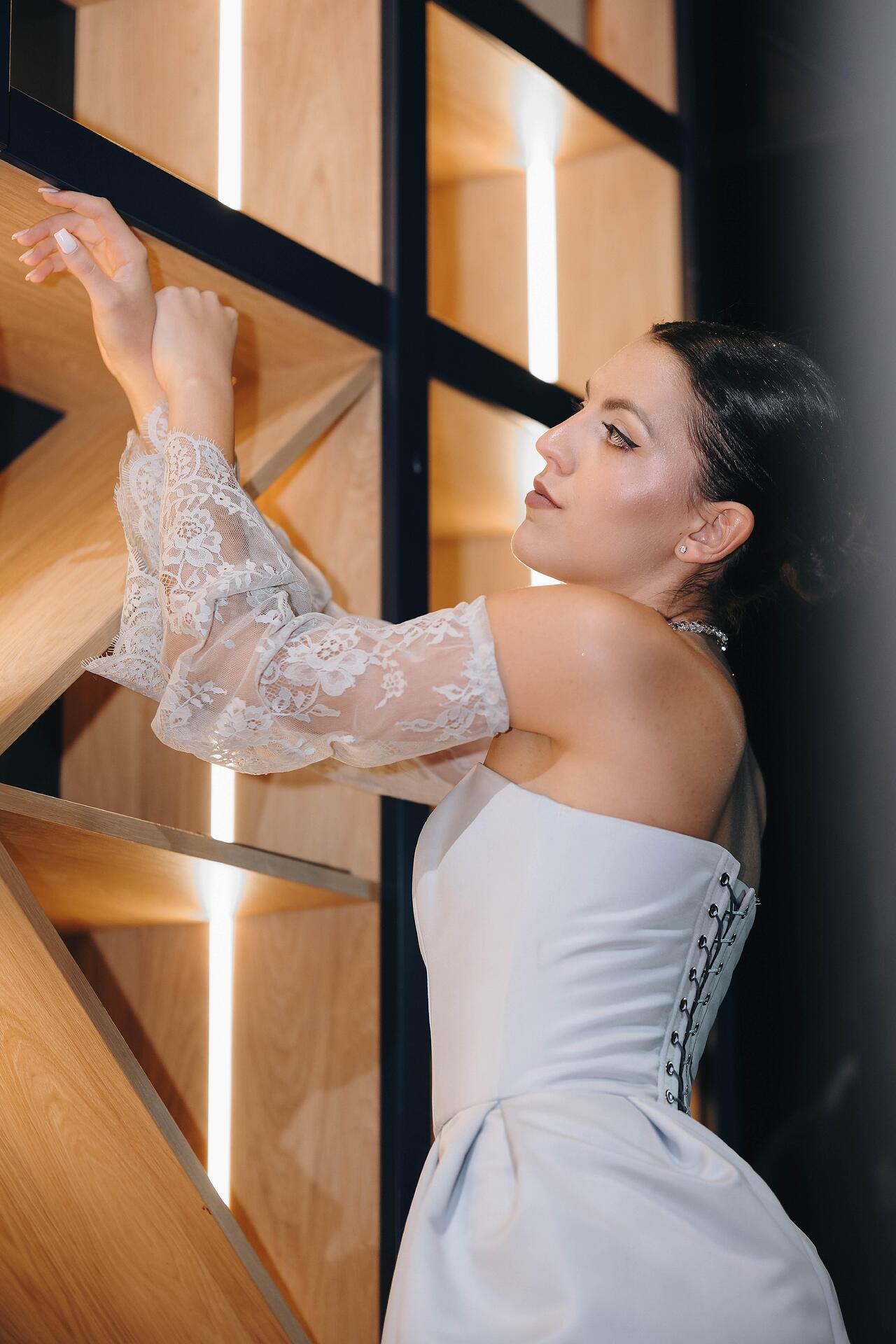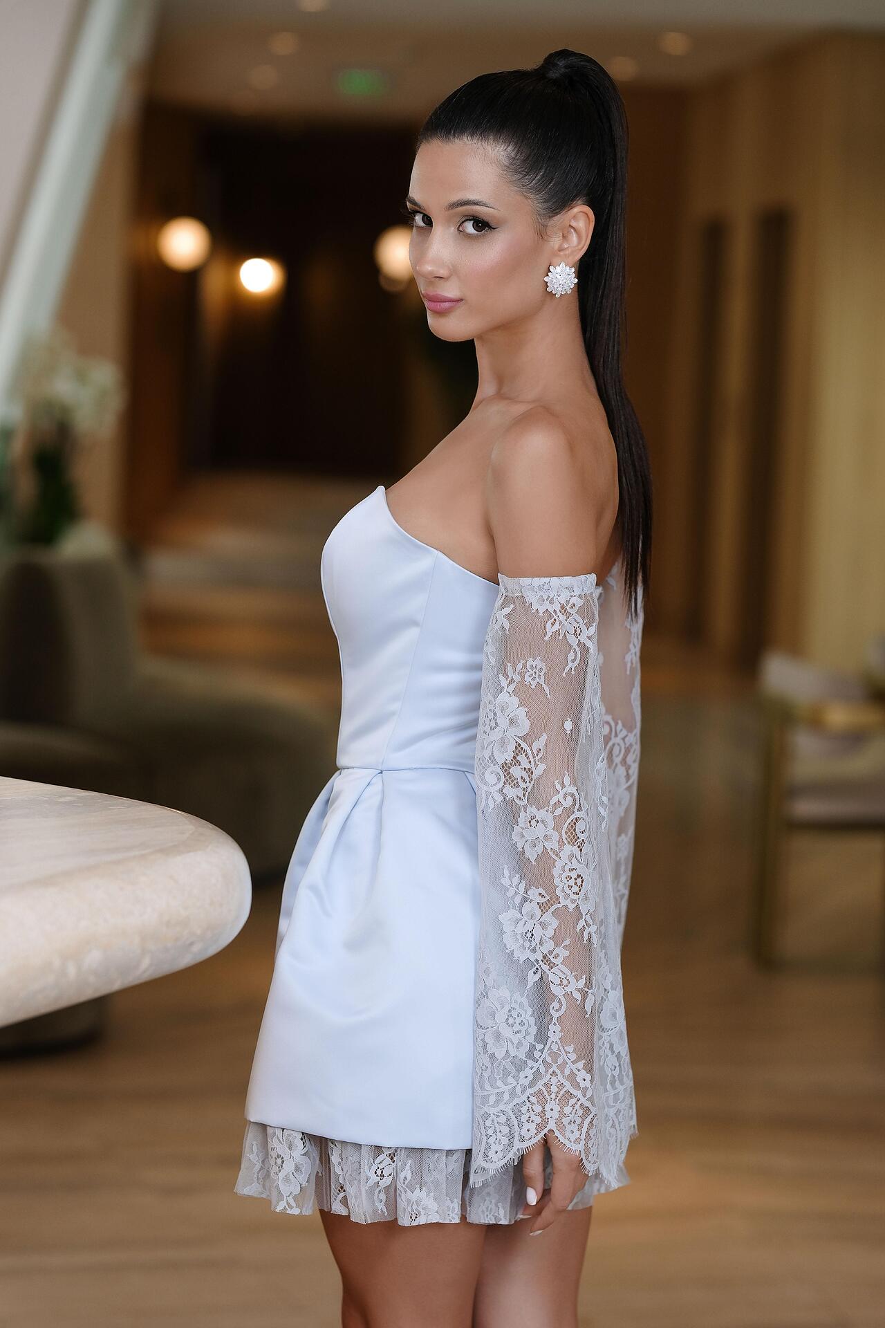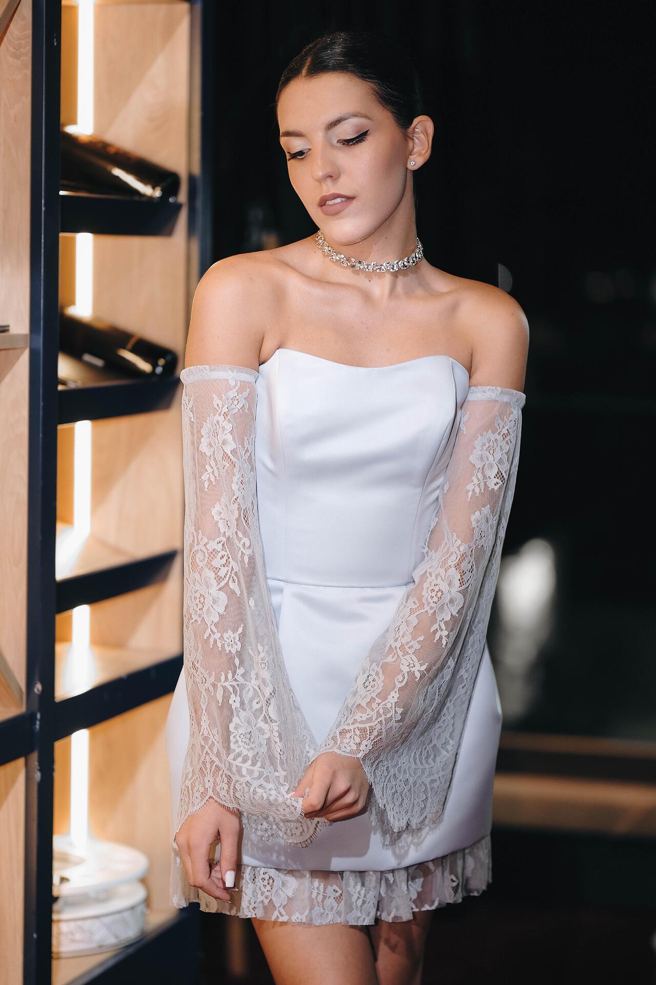 A minimalist dress that impresses with its clean design and elegant details. The dress is made of luxurious white satin that emphasizes the figure. The long lace sleeves with floral motifs add a romantic touch. The dress can be worn with or without sleeves. The skirt underneath is made of tulle that holds its shape. It ends with light lace at the bottom, which creates an airy and feminine look. It is fastened with laces at the back. It can be made according to your size.