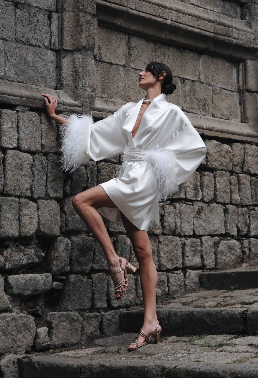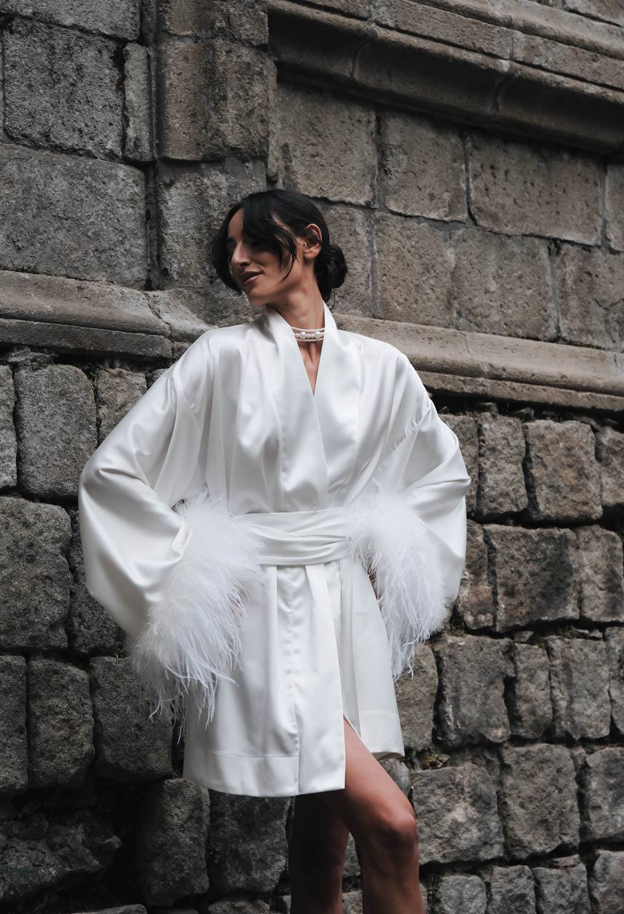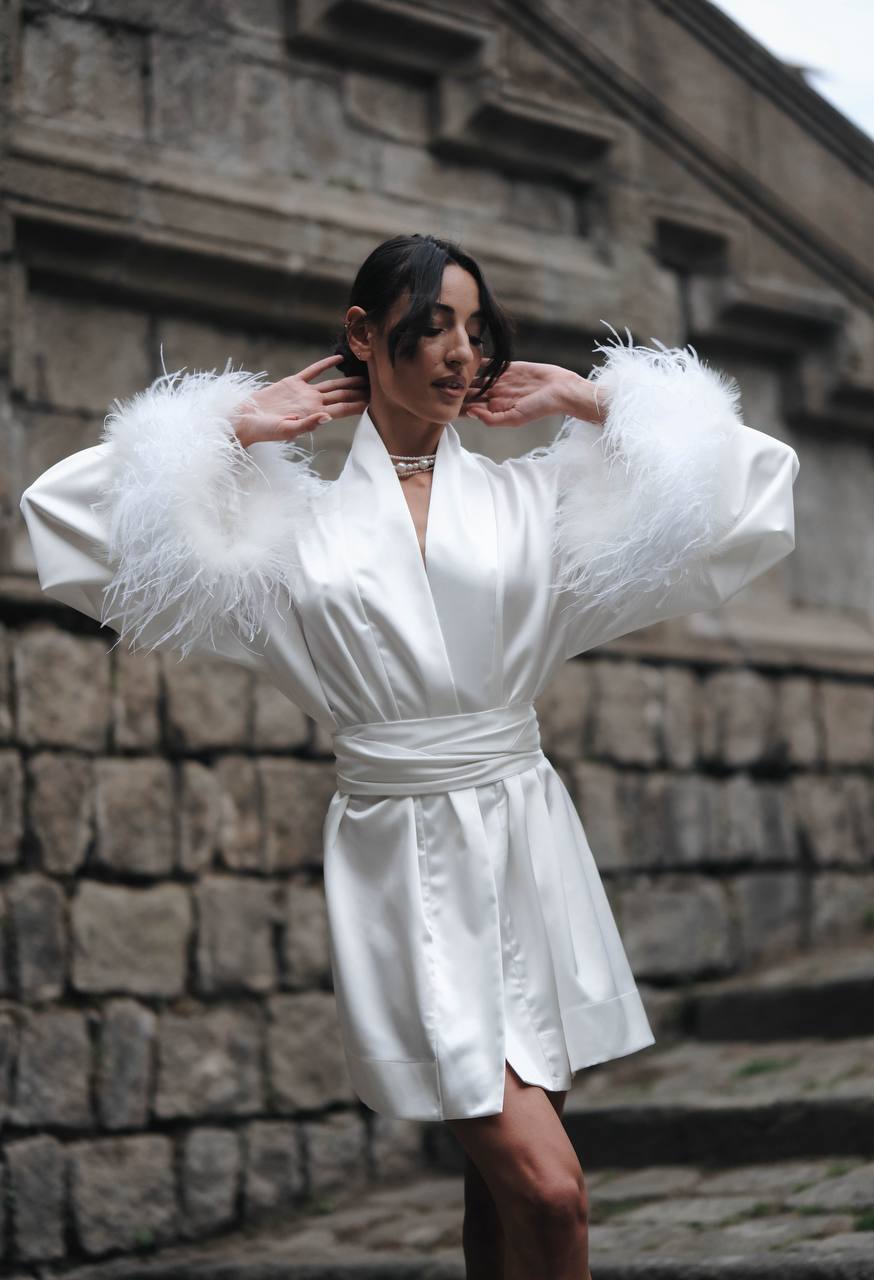 Elegant and luxurious kimono, made of high-quality satin. The long sleeves are decorated with delicate feathers, which add sophistication and style. The kimono has a tie at the waist, which allows for size adjustment and creates a silhouette-shaping effect. Perfect for special occasions or cozy evenings at home. Suitable to be worn as a dress.