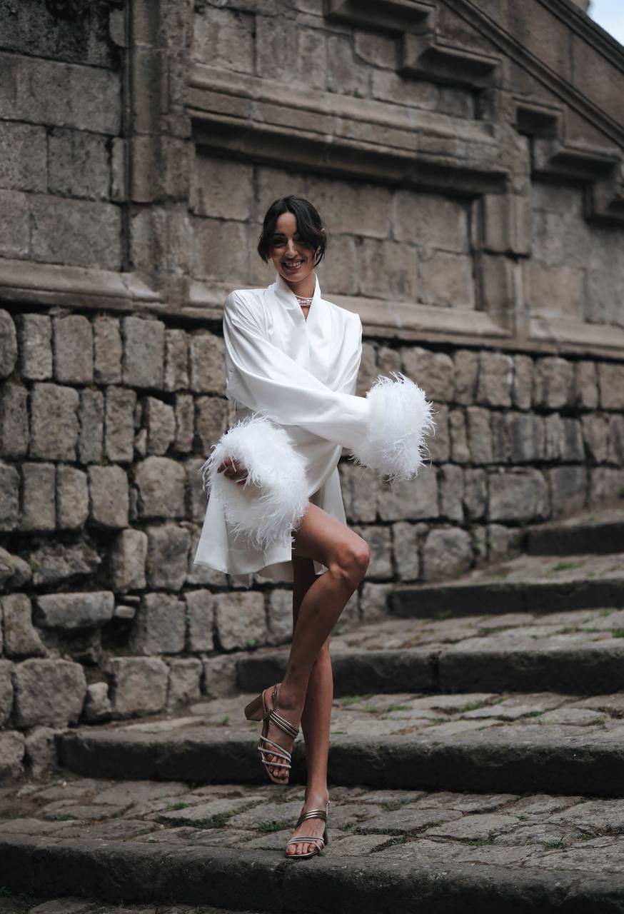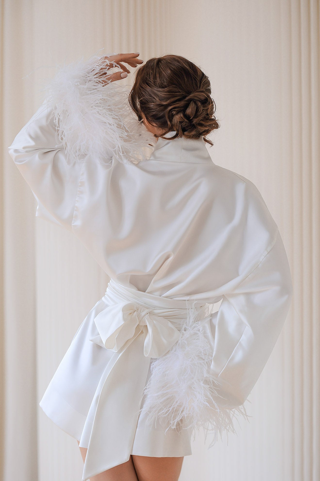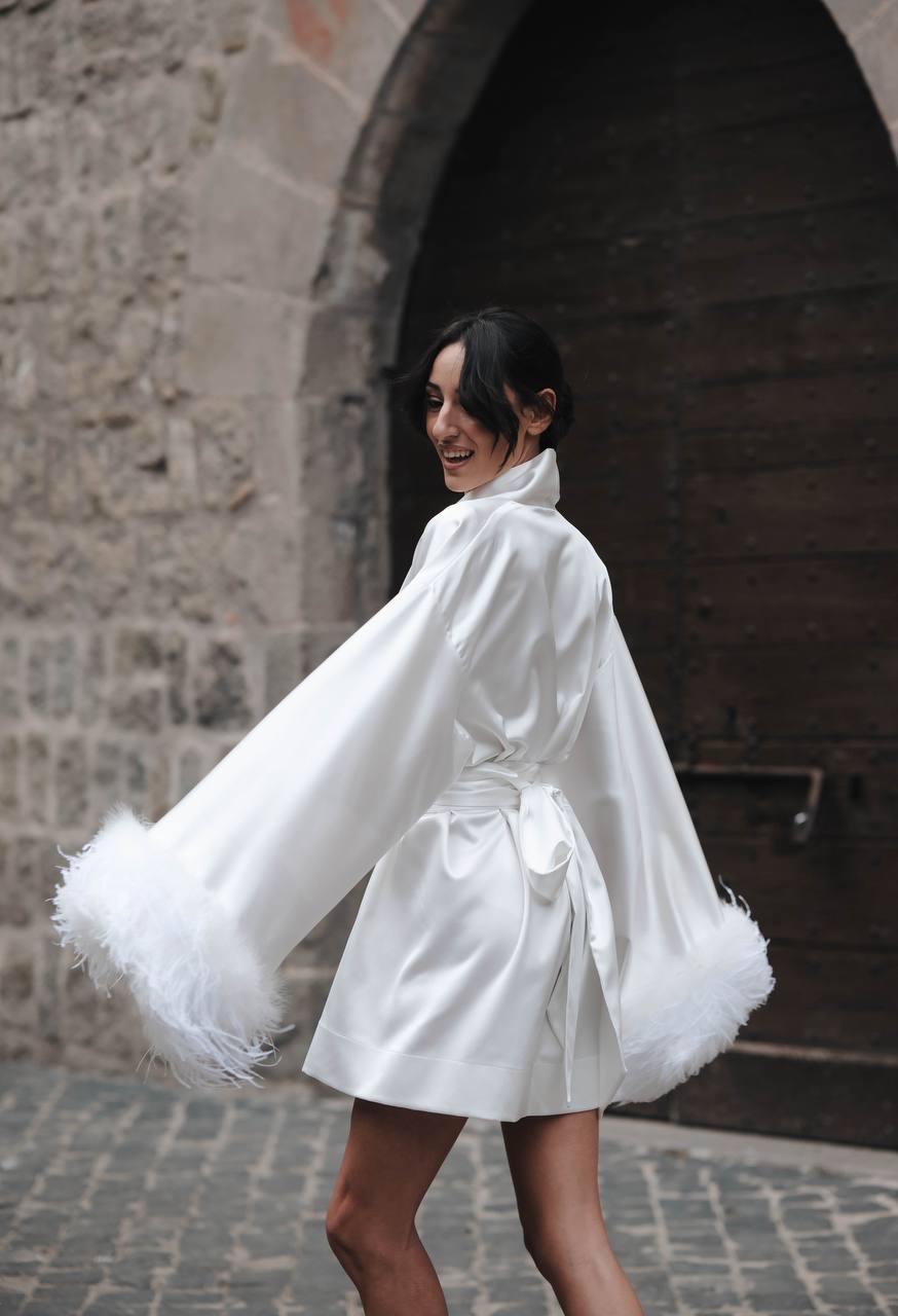 Elegant and luxurious kimono, made of high-quality satin. The long sleeves are decorated with delicate feathers, which add sophistication and style. The kimono has a tie at the waist, which allows for size adjustment and creates a silhouette-shaping effect. Perfect for special occasions or cozy evenings at home. Suitable to be worn as a dress.