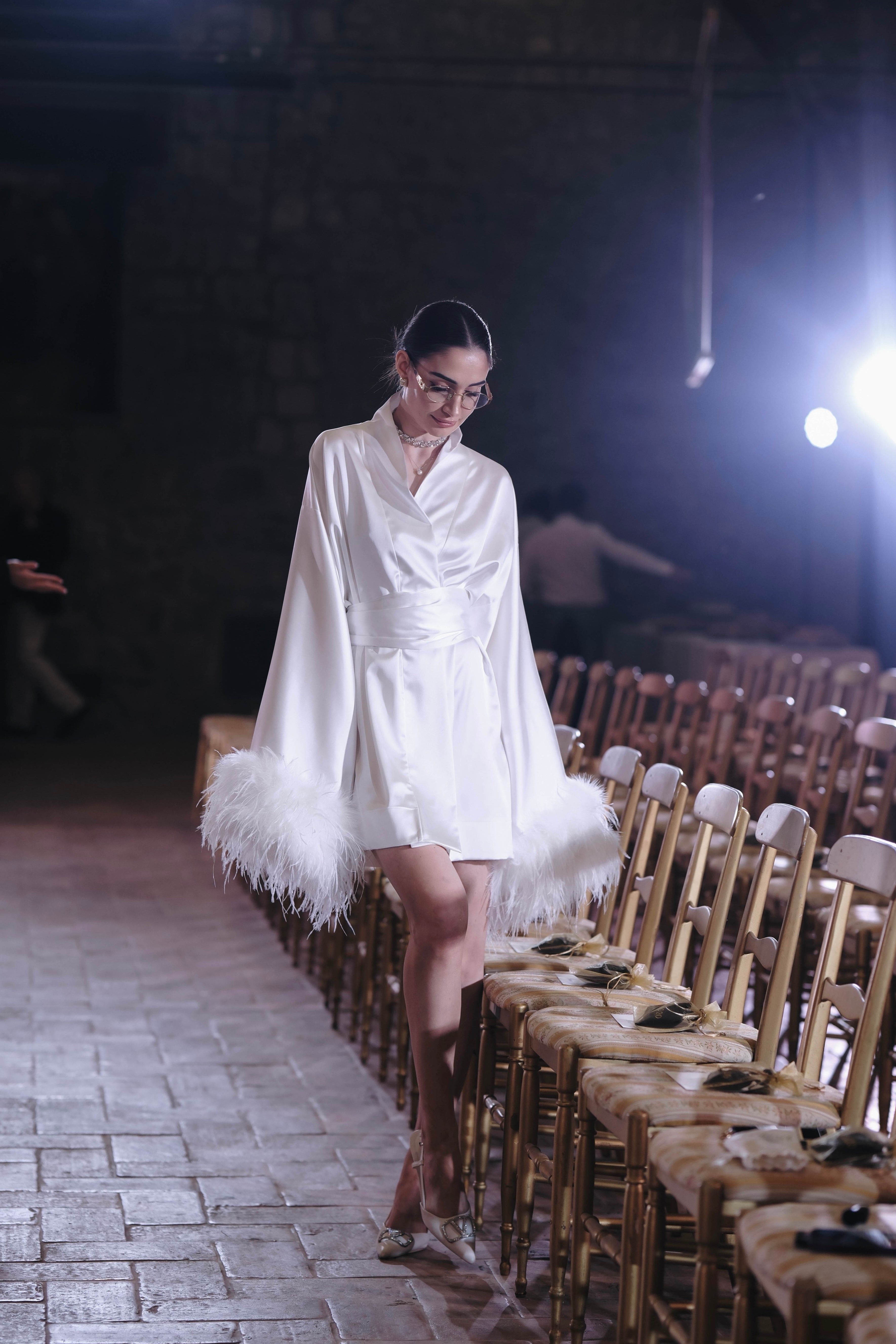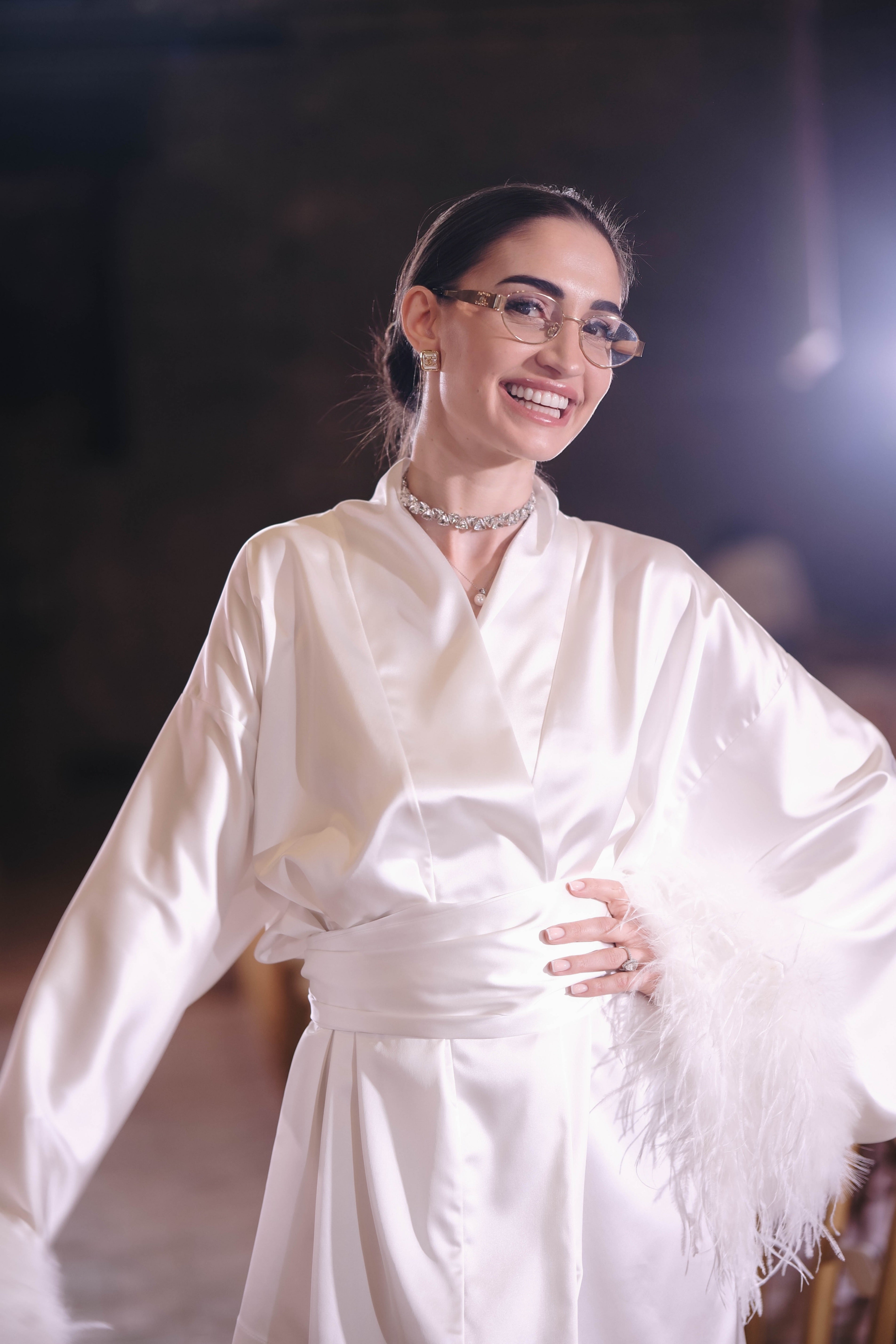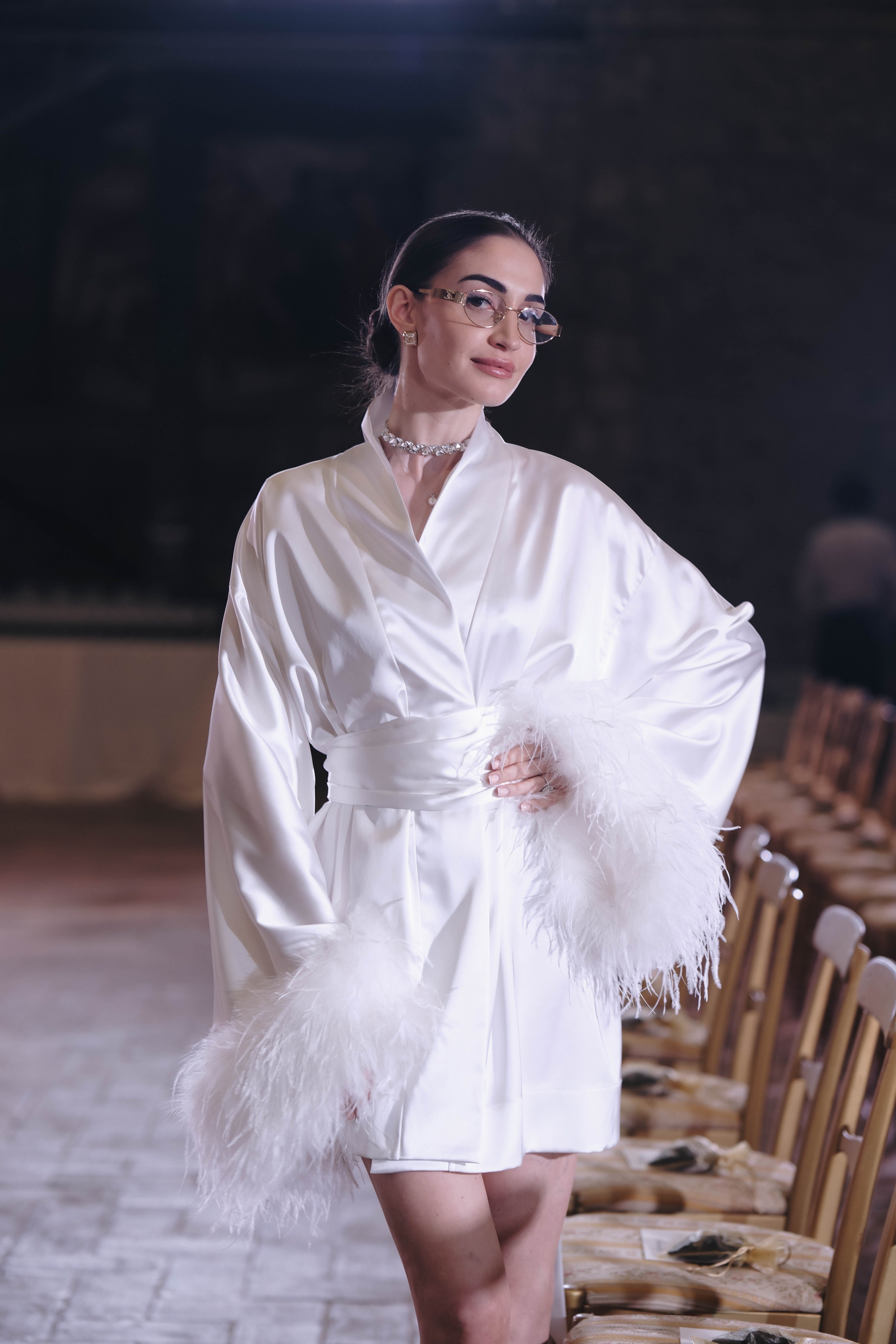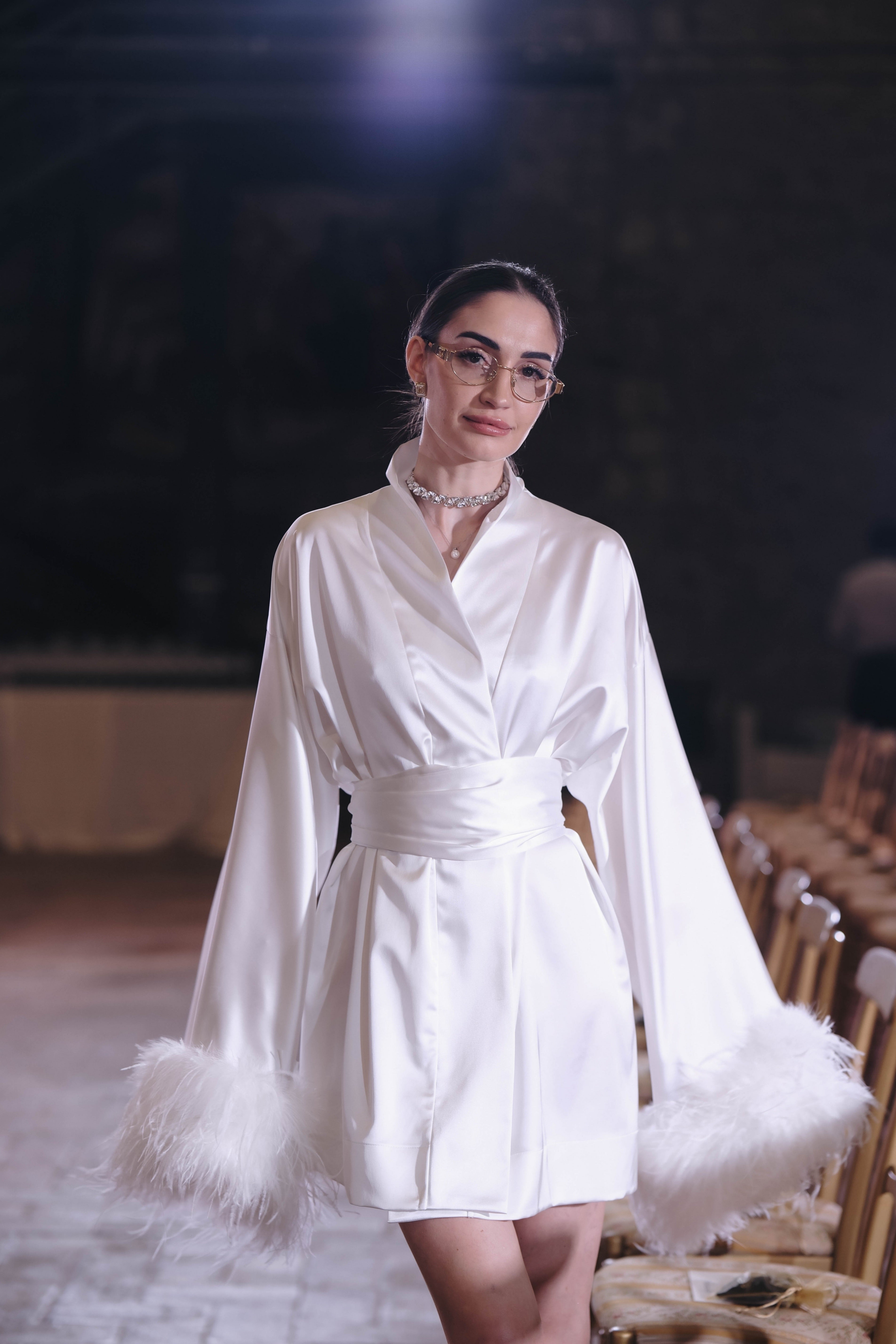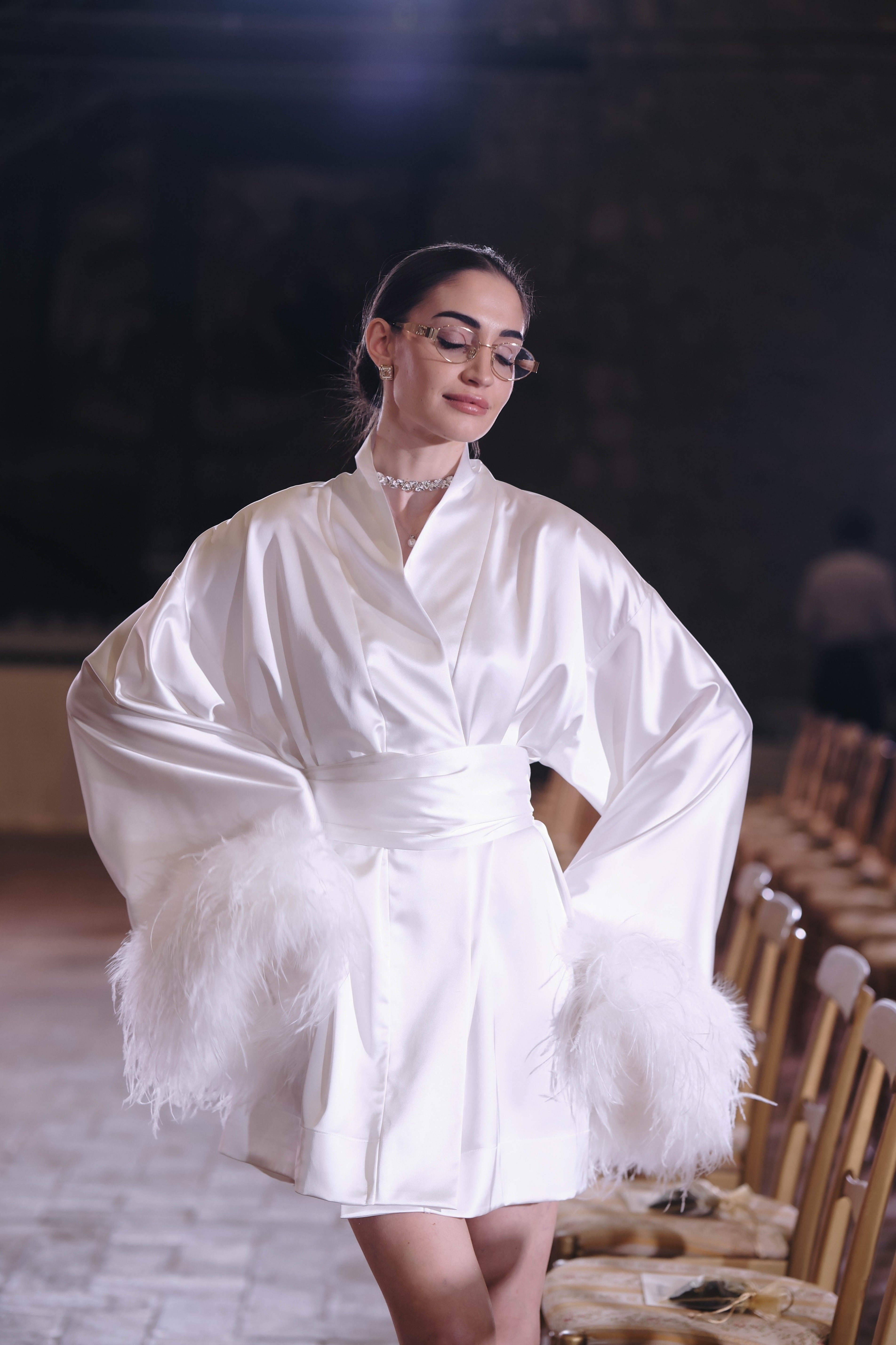 Luxurious kimono with feathers in white: Raya