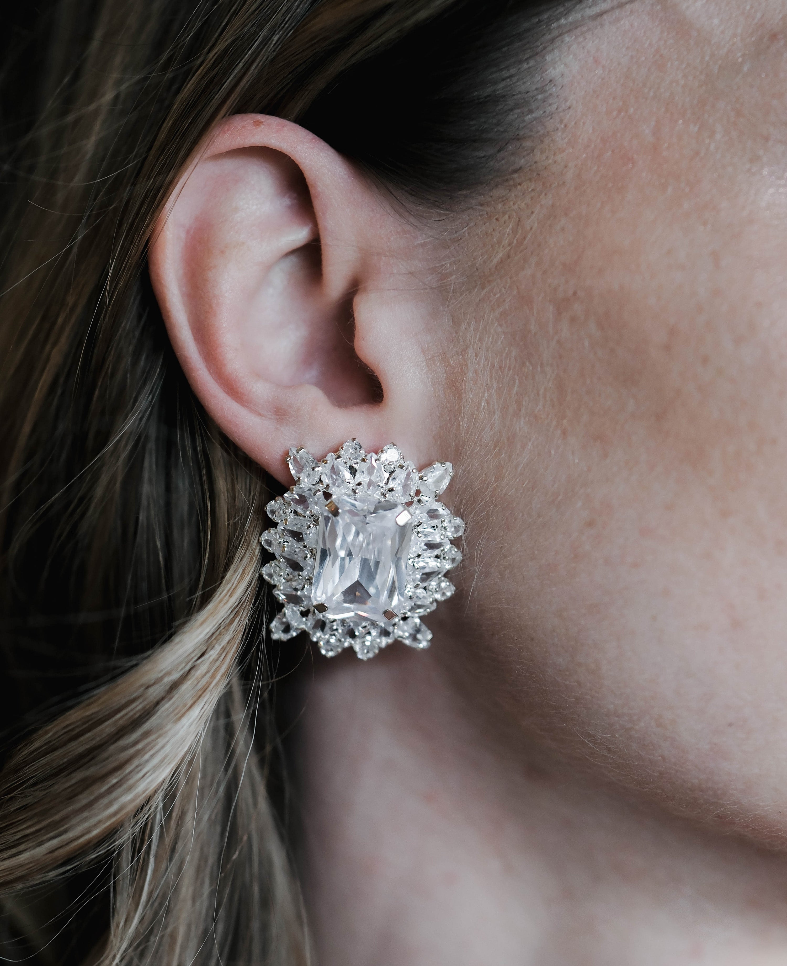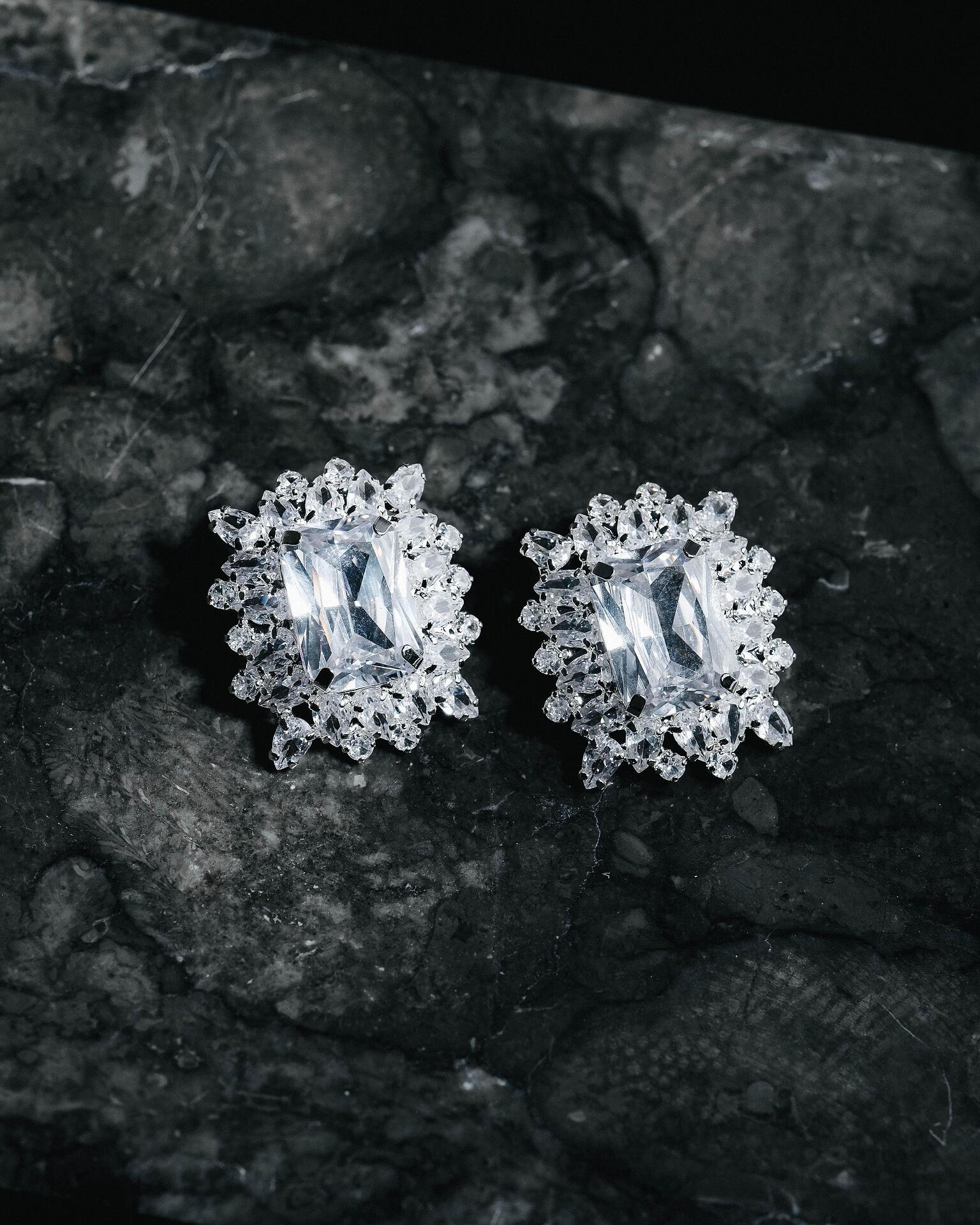 Exquisite earrings with rectangular crystals in the center, surrounded by numerous sparkling stones, which add captivating shine and elegance. These earrings are perfect for special occasions and will add unique elegance to any look.