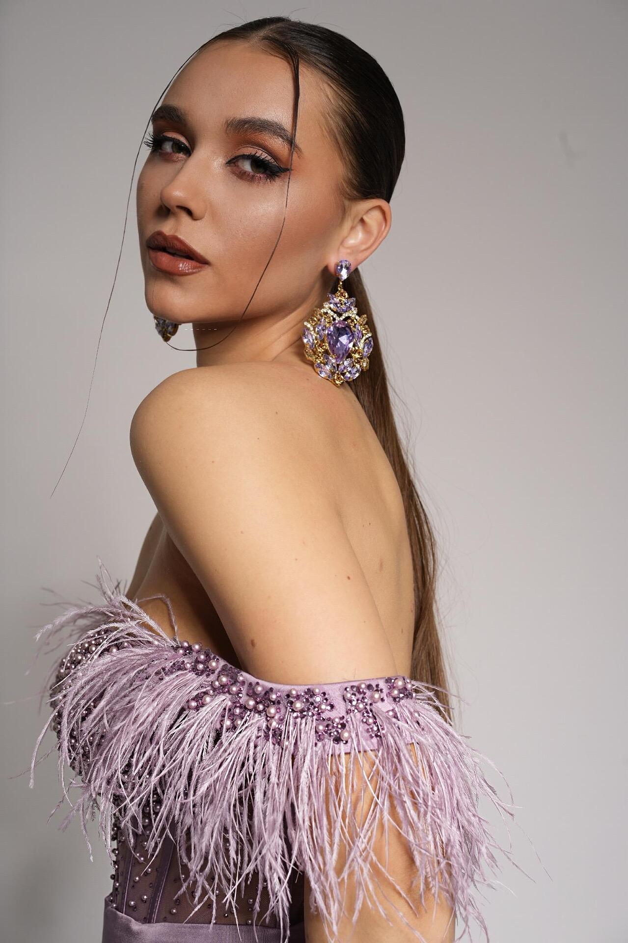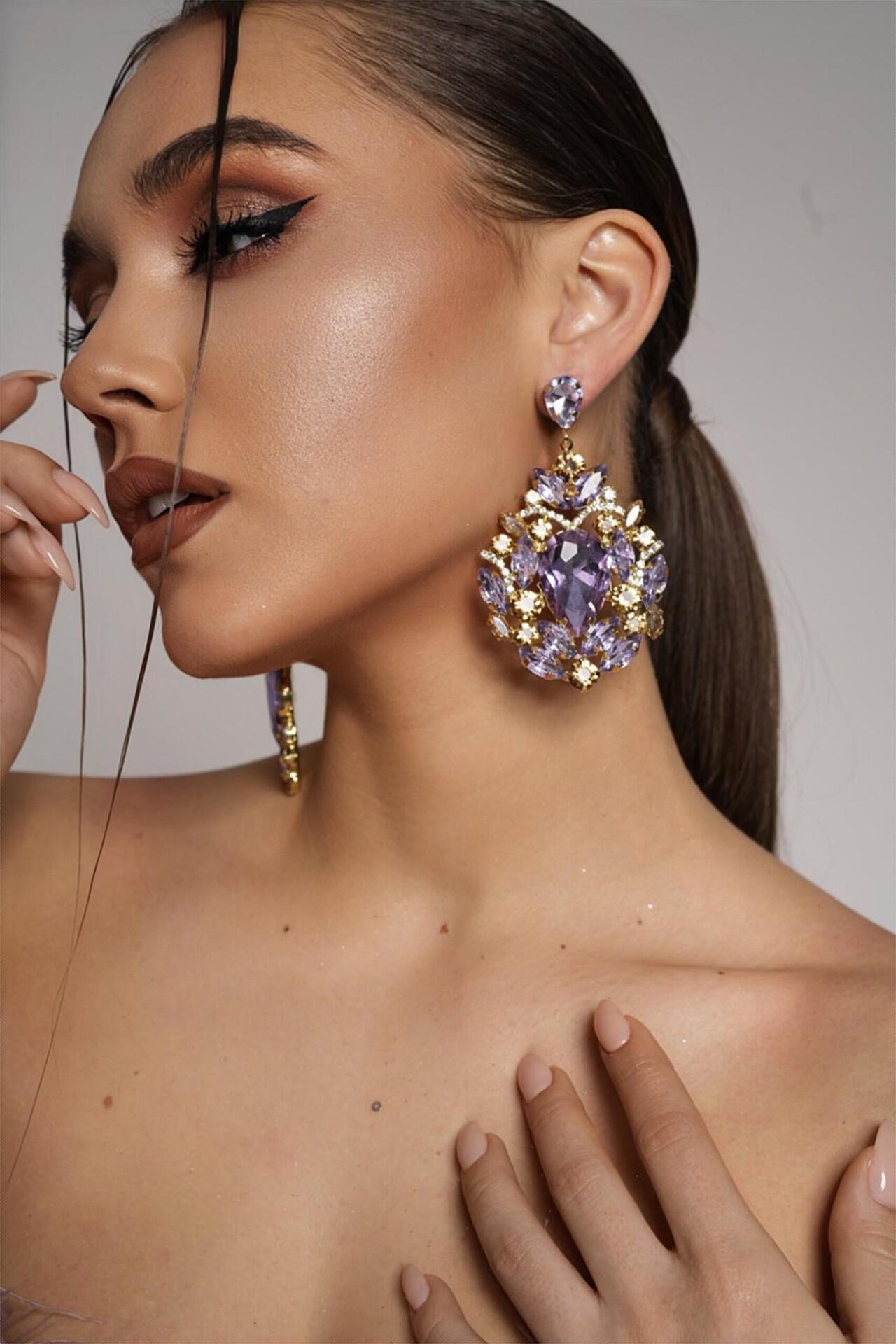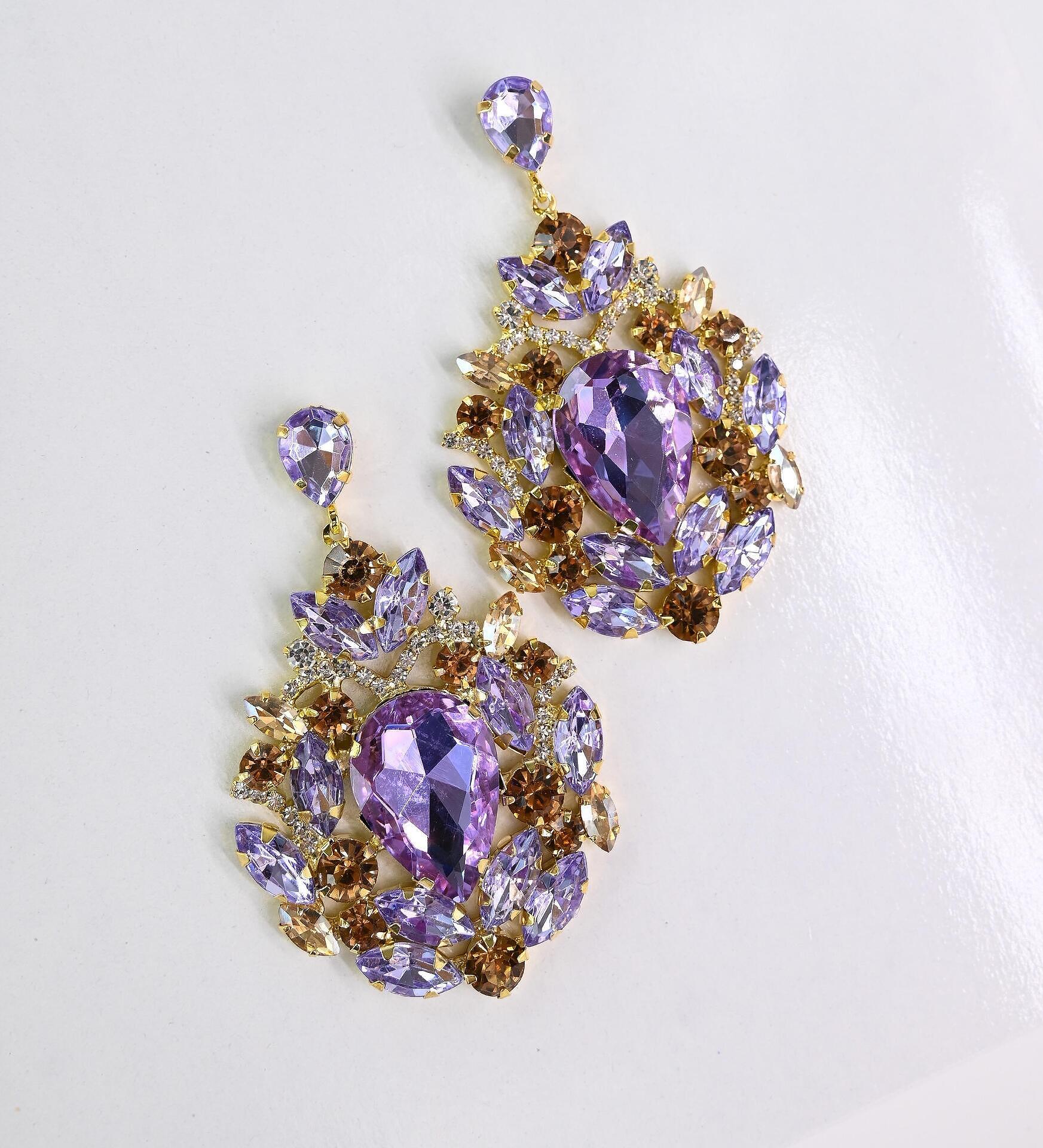Exclusive purple dangle earrings with crystals, suitable for your formal occasions. Handmade from high quality materials. Fastened with a screw.