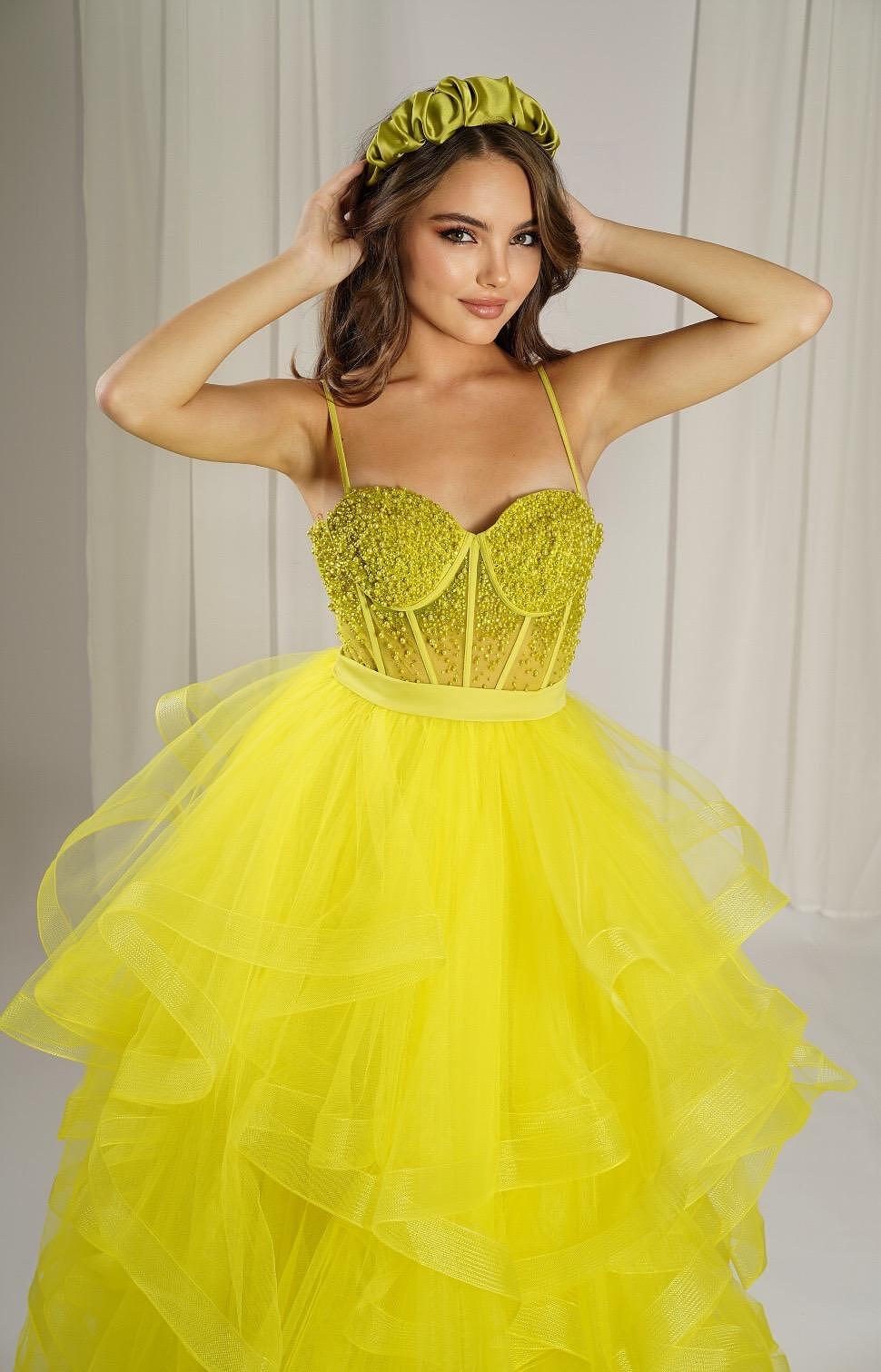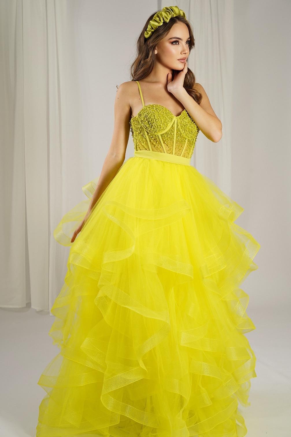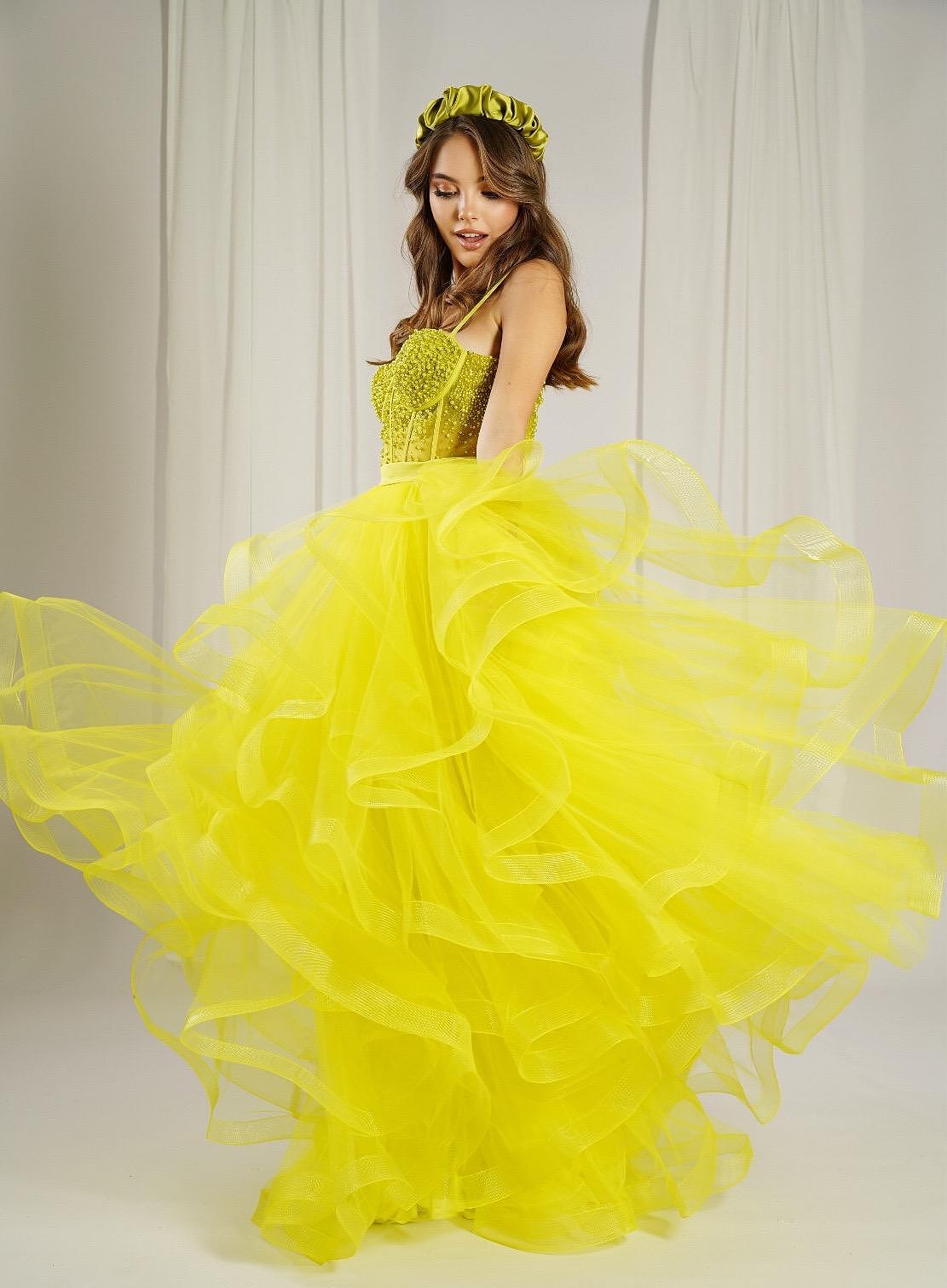 The dress is made of high quality materials. The neckline is heart-shaped, and beautiful details with crystals and pearls are sewn on it, which contribute to the elegant look of the dress. The dress has an incredible tulle underneath. It fastens with a zipper, which is located on the back. It is suitable for your special occasion.