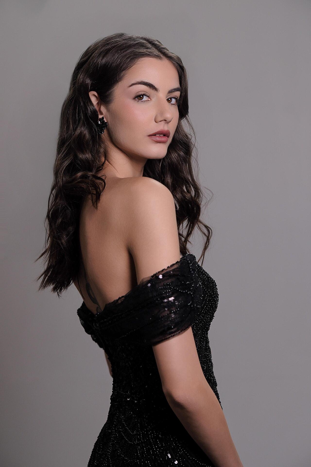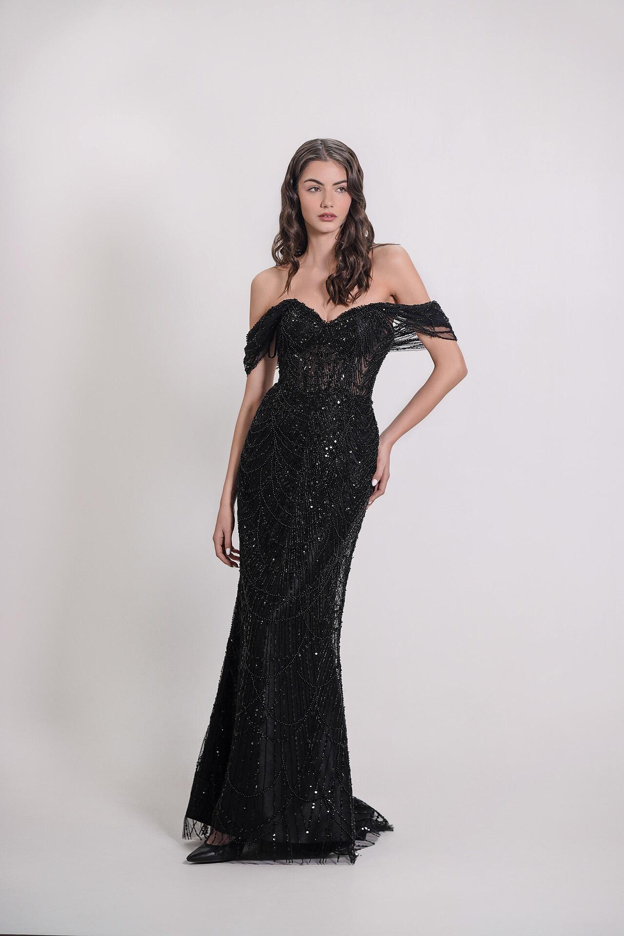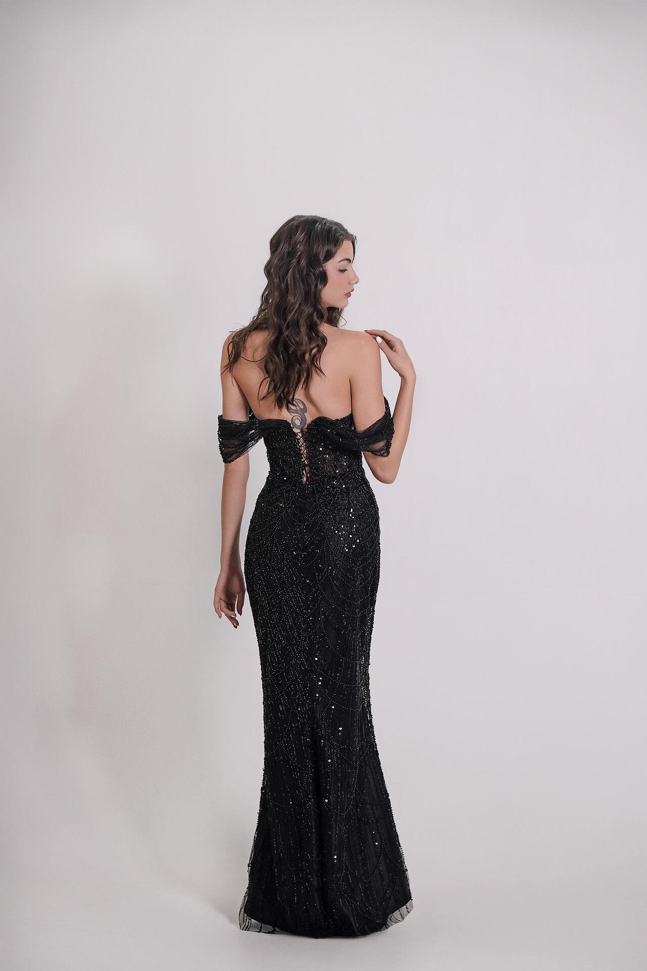 Handmade corset dress, entirely sewn with glittering beads and sequins, which create a dazzling effect when moving. It has an elegant silhouette that emphasizes the figure, and delicate falling sleeves, giving femininity and sophistication. The corset top provides perfect support, shaping the body. There is a soft lining underneath.
