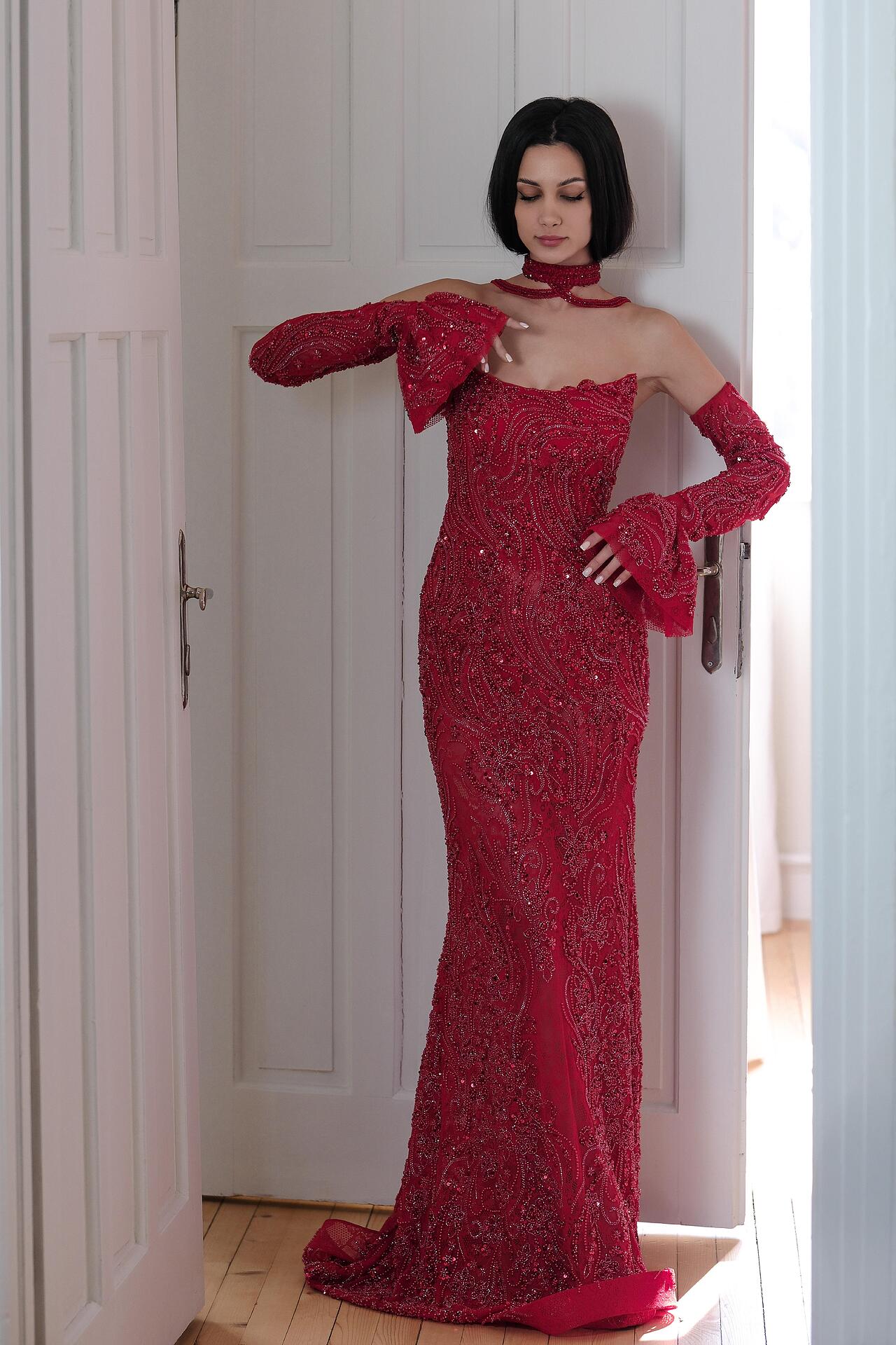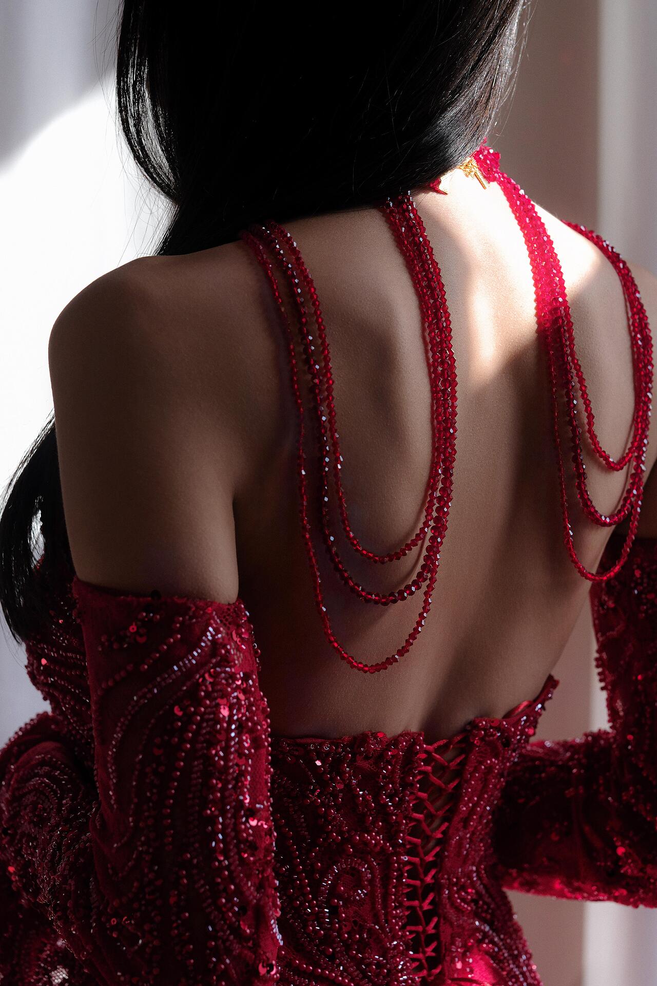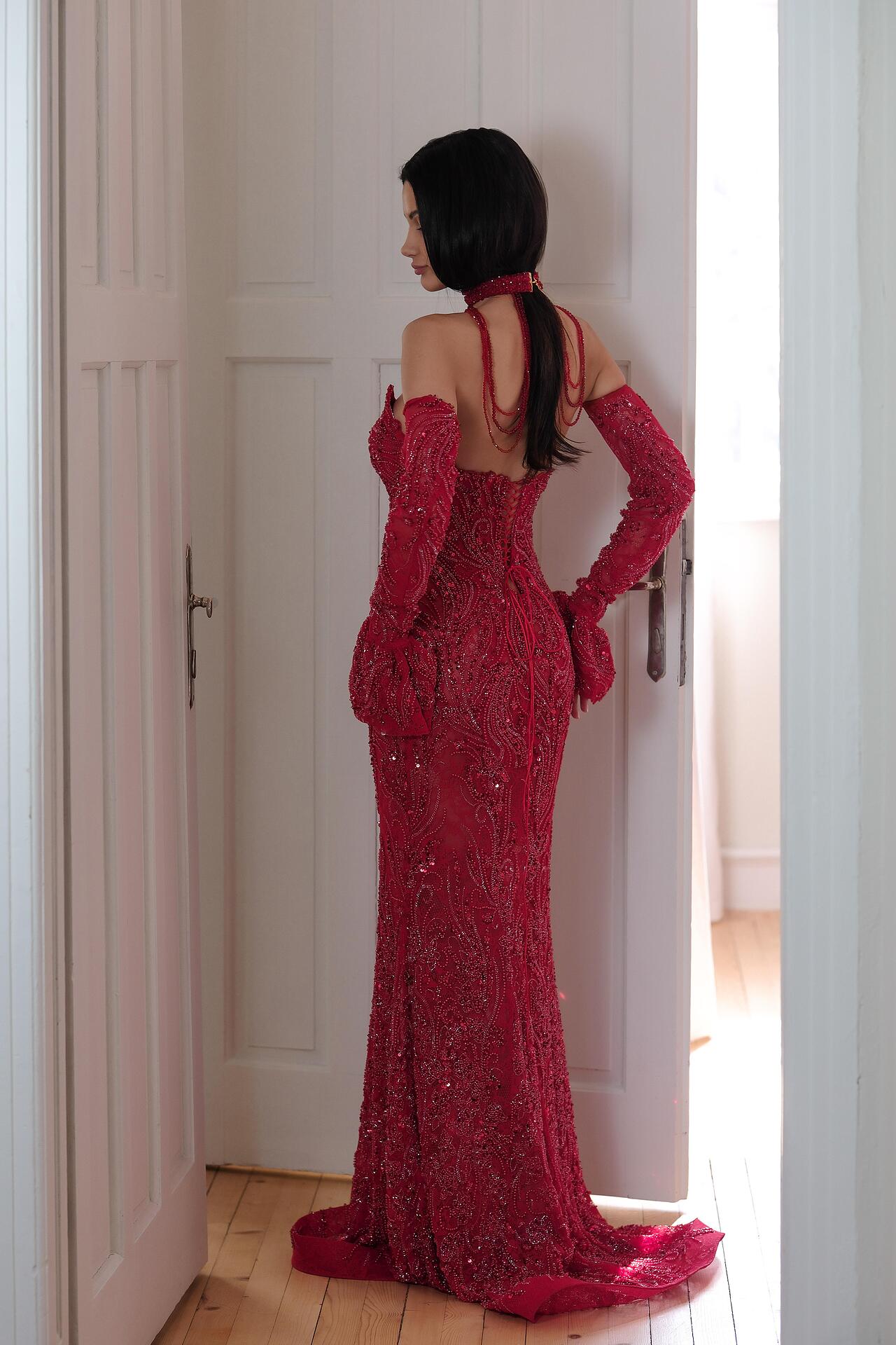 Evening dress with a mermaid silhouette that fits the body and creates a sophisticated, feminine look. The corset top is covered with thousands of beads and sequins that reflect the light with every movement. The back is shaped with a corset tie, which ensures a perfect fit for different figures, and the long skirt with a slight train line gives a sophisticated finish. The sleeves are removable with a wide finish. The set also includes a choker, which is an indispensable accessory with its visible strands of beads.