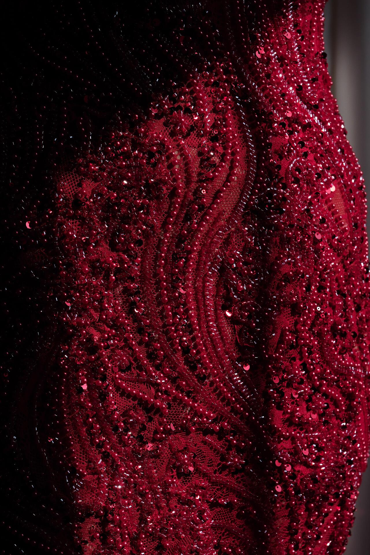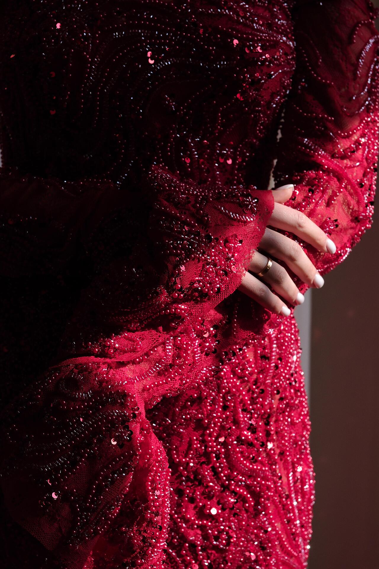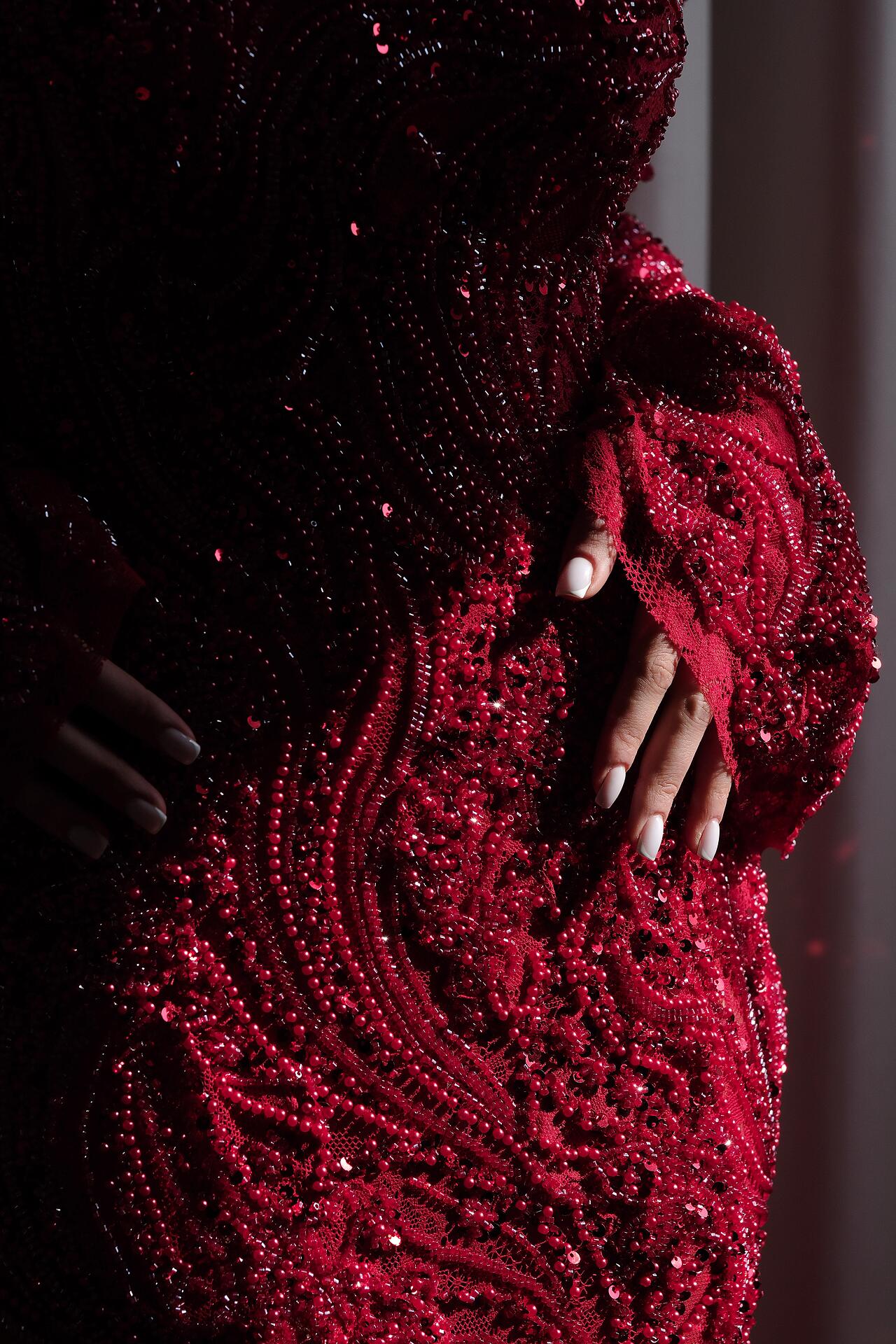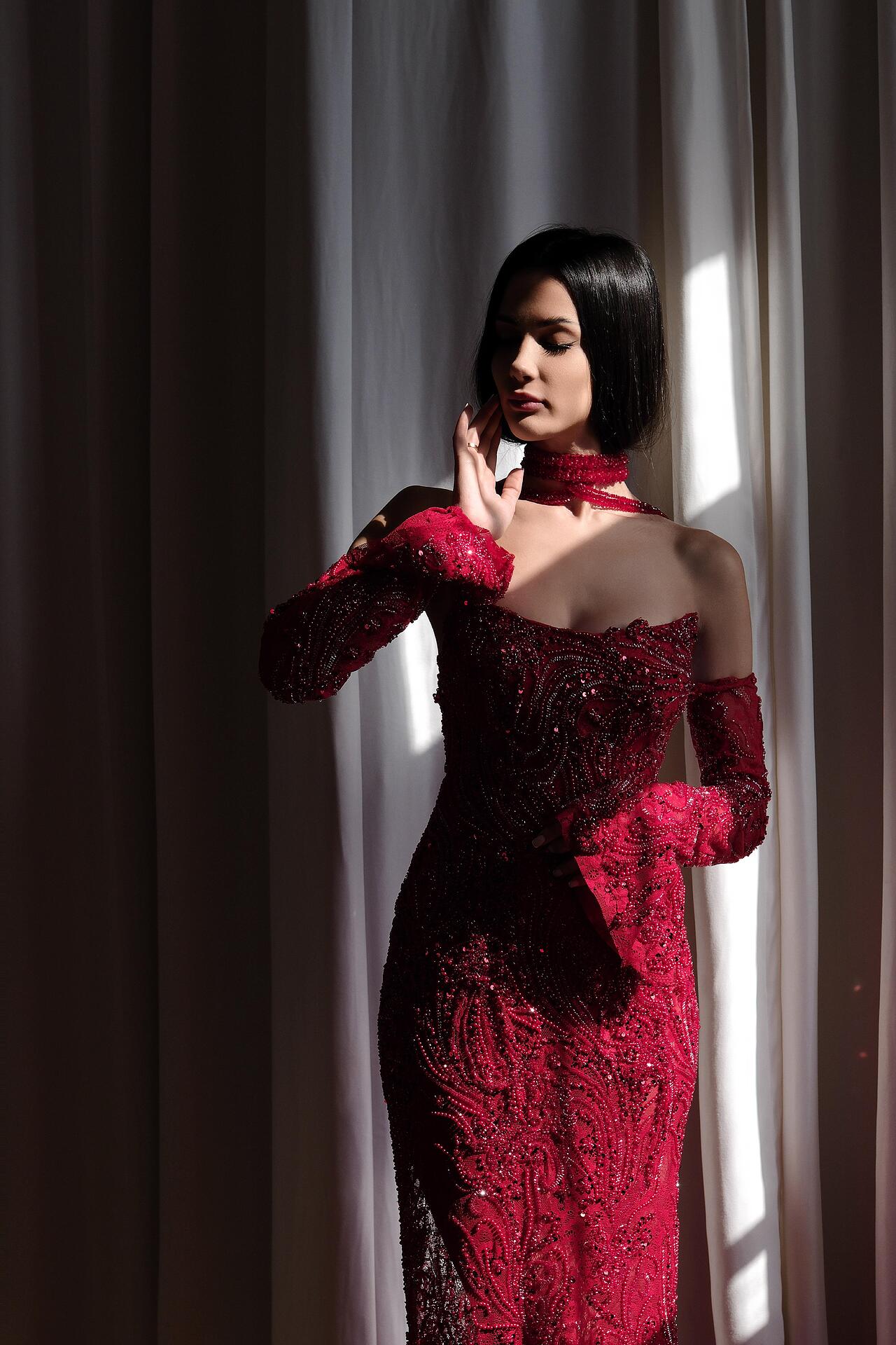 Evening dress with a mermaid silhouette that fits the body and creates a sophisticated, feminine look. The corset top is covered with thousands of beads and sequins that reflect the light with every movement. The back is shaped with a corset tie, which ensures a perfect fit for different figures, and the long skirt with a slight train line gives a sophisticated finish. The sleeves are removable with a wide finish. The set also includes a choker, which is an indispensable accessory with its visible strands of beads.