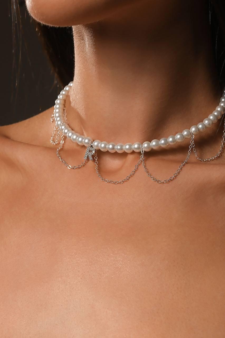 An elegant choker, combining the classic beauty of white pearls with a contemporary design, highlighted by delicate silver chains. The choker also includes a letter pendant. The dangling elements create a smooth and sophisticated effect that attracts attention. The adjustable fastening provides comfort and flexibility, allowing a perfect fit to any neck shape.
