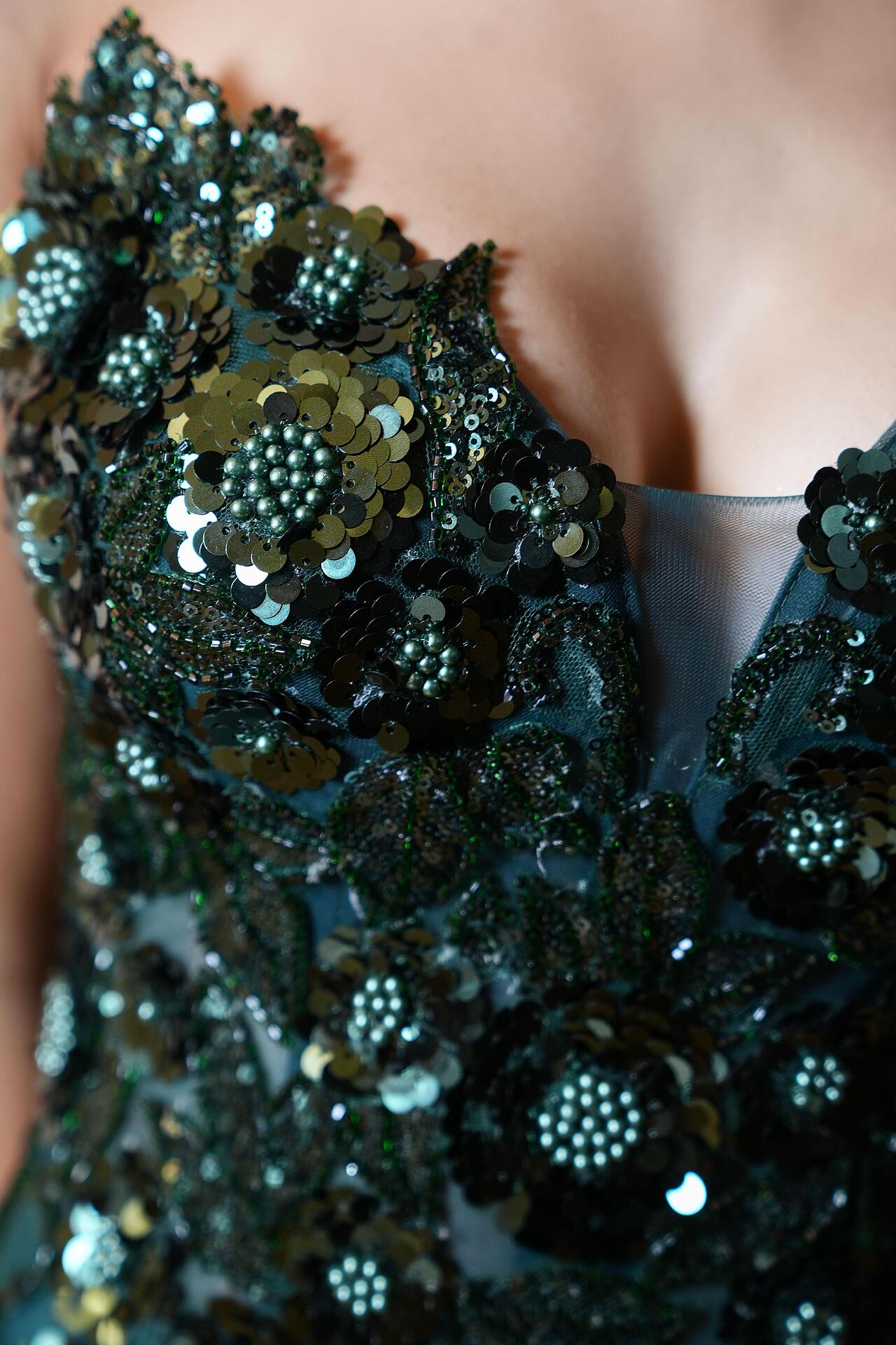 A seductive corset that is richly decorated with emerald-colored sequins, creating an impressive shine. The strapless sweetheart neckline emphasizes femininity. It has built-in cups. It can also be made to your measurements for a surcharge of 10%.