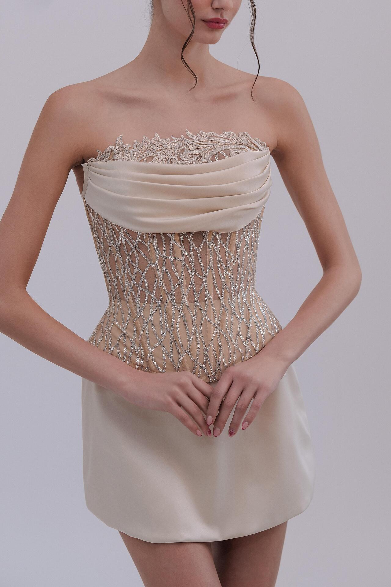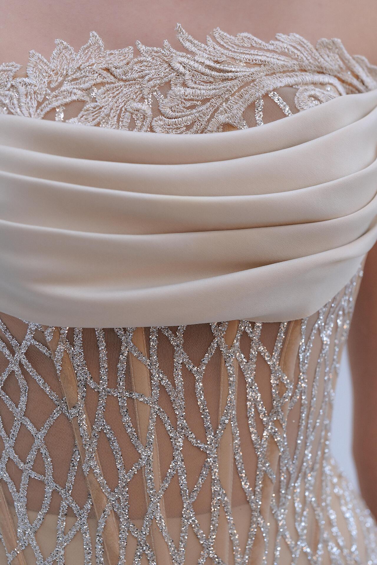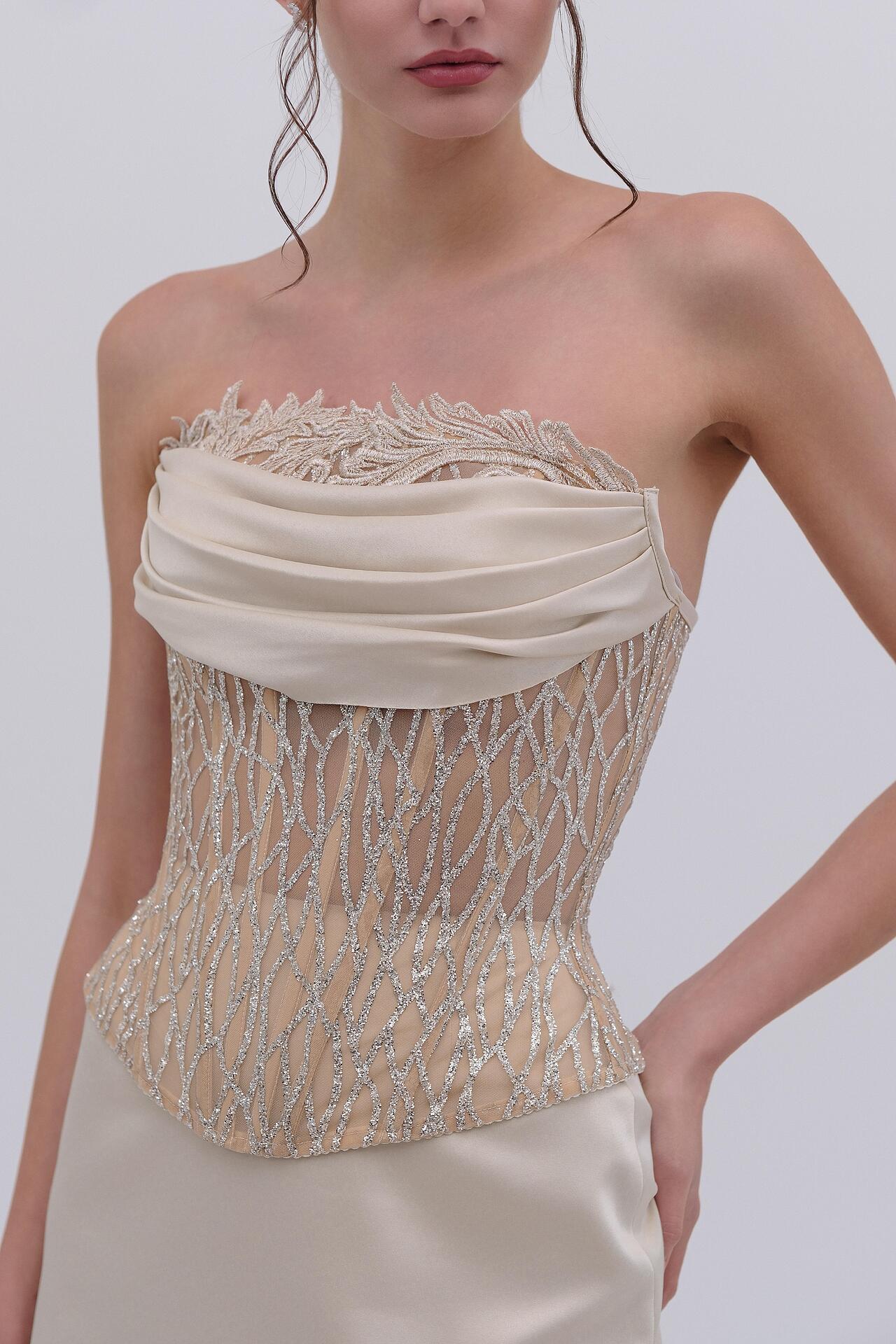 The corset impresses with a unique combination of airy mesh and shiny decorative motifs that resemble the curves of branches. The light drapery at the top adds sophistication. Created for special events, it emphasizes the waist and provides a perfect shape. It is handmade and can be adapted to your individual measurements for an additional fee of 15% of the price.