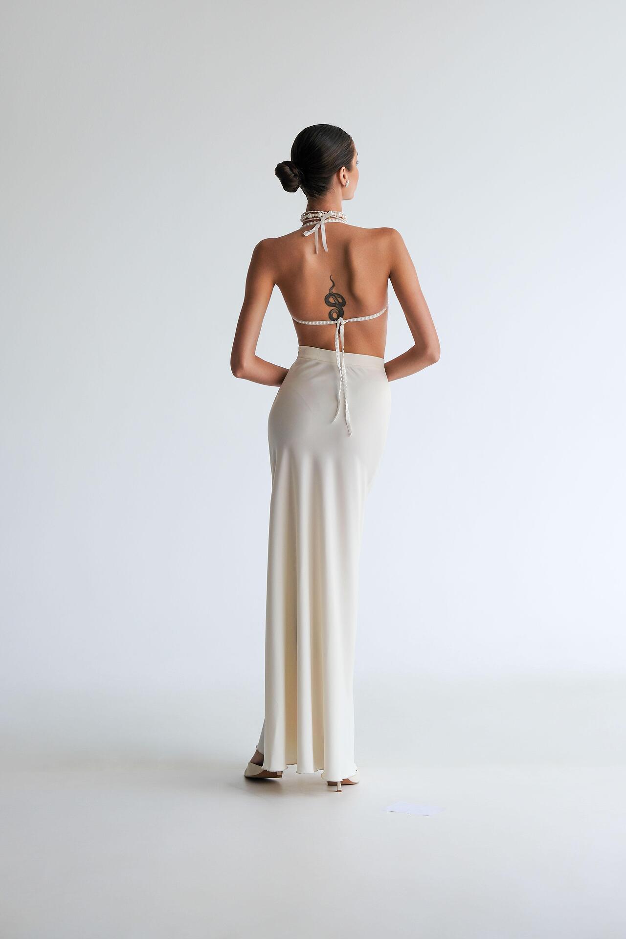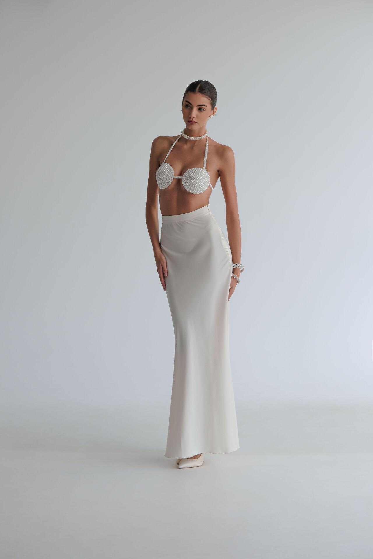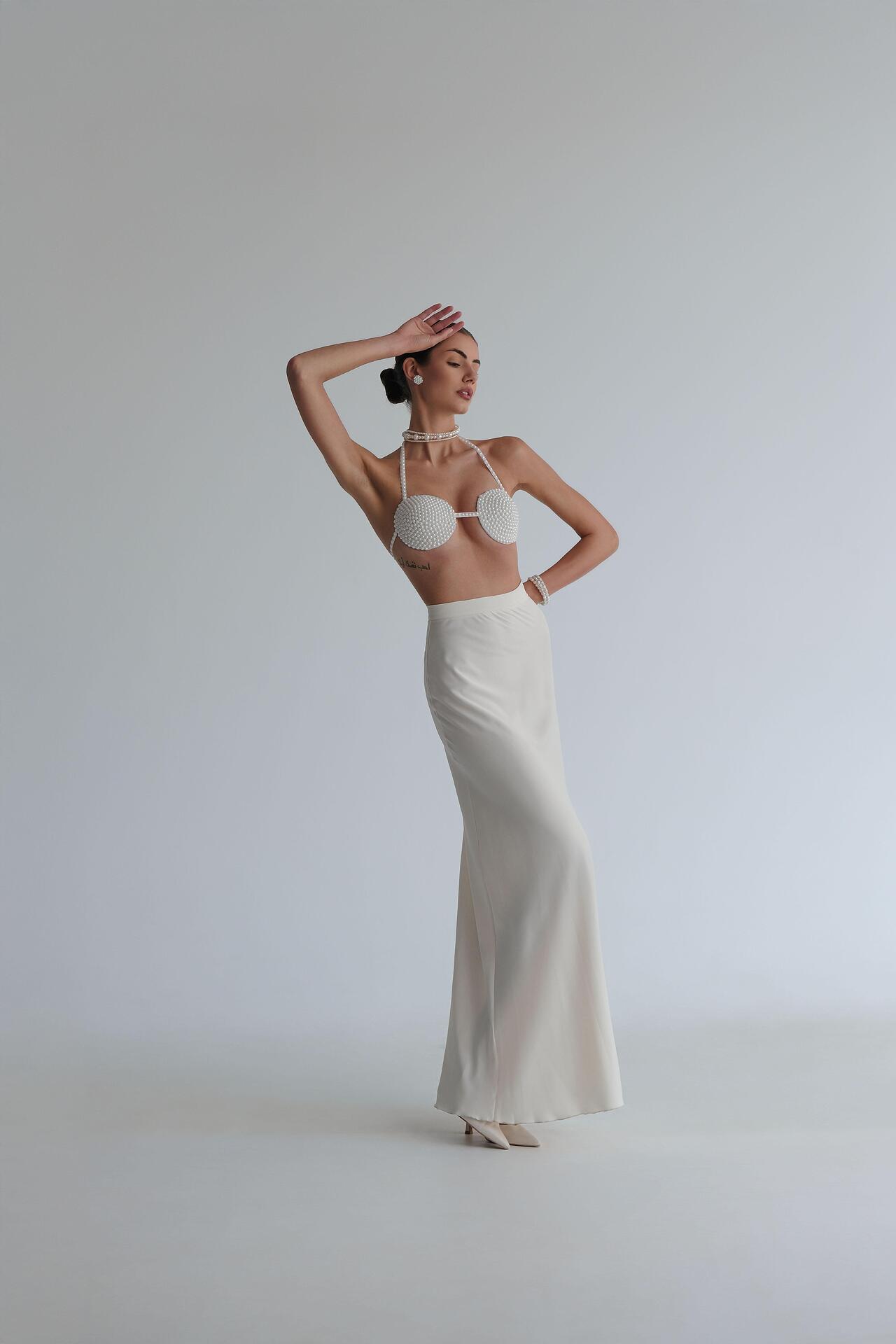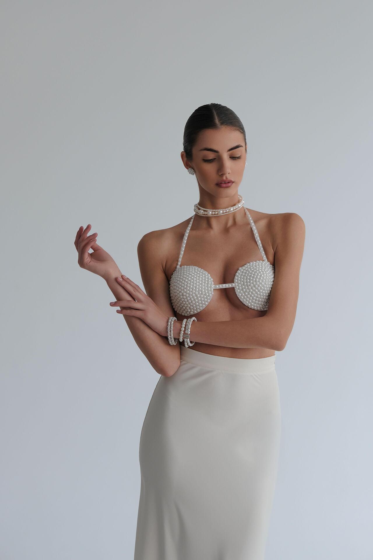 Bold and elegant, this pearl top adds an unforgettable accent to your look. With exquisitely crafted pearl details, it is a perfect choice for those who like to make bold fashion decisions. It can be combined with various bottoms, such as a skirt, for a sophisticated yet bold style.