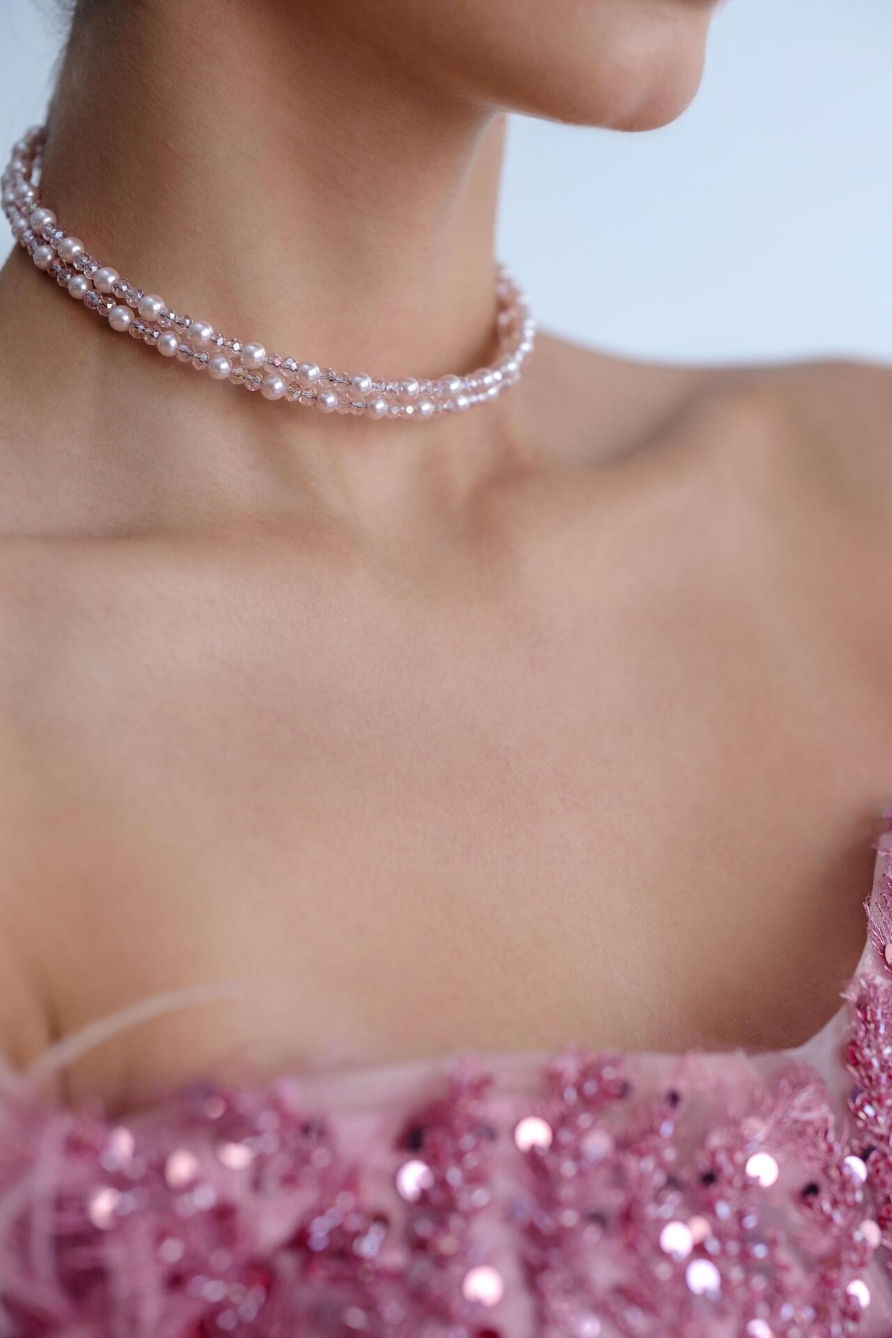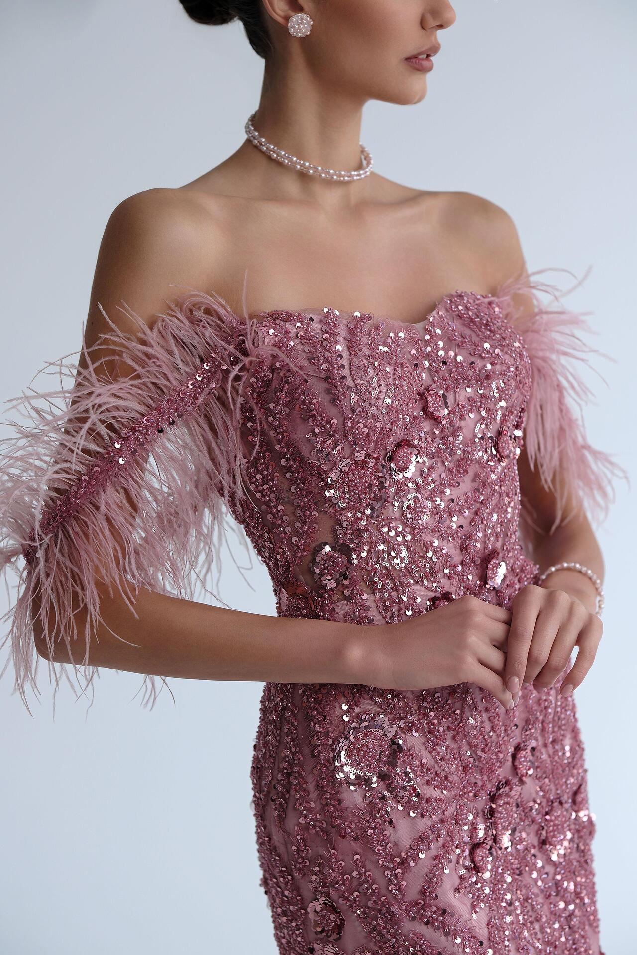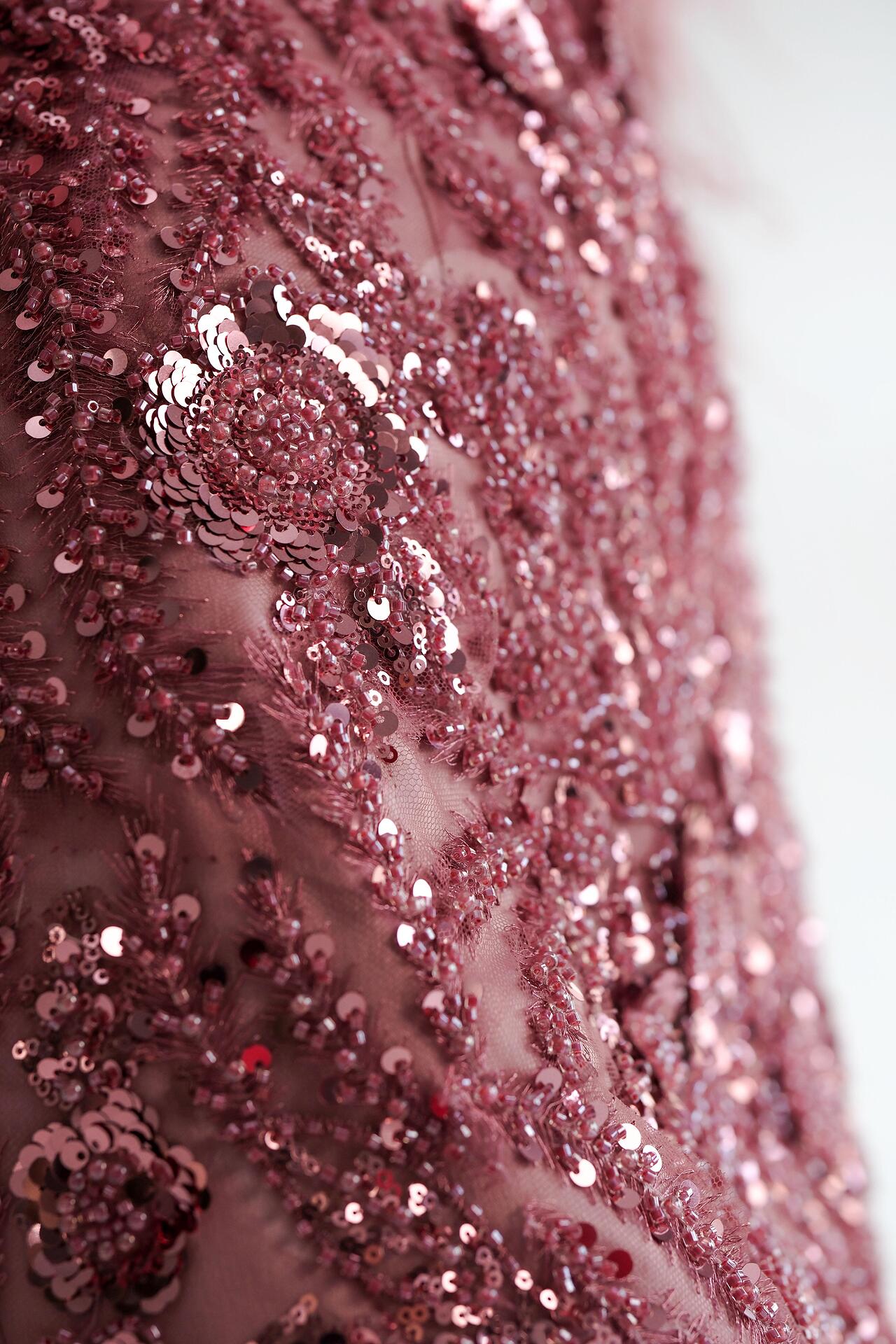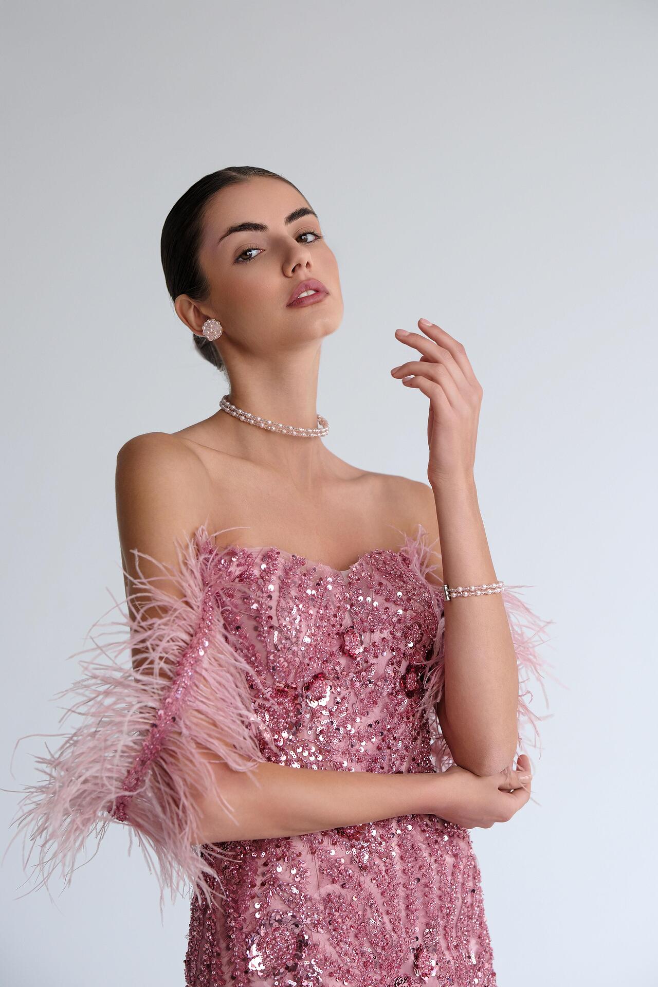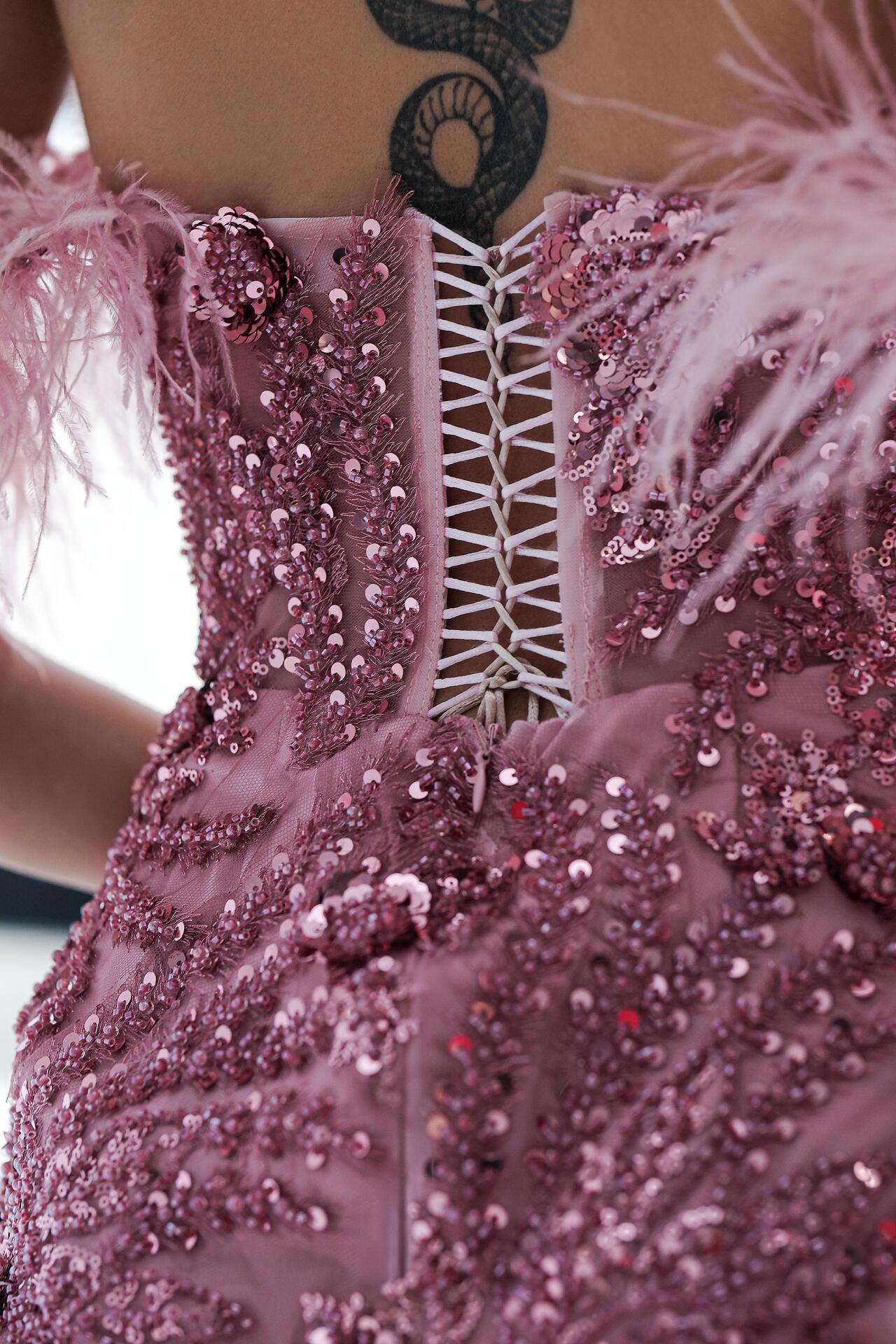 This dress is the choice of the woman who wants to be the center of attention and exude genuine elegance. The base of the dress is corseted, has built-in cups, is fastened with laces. It has a soft lining, and on top it is hand-decorated with sequins and beads. It can be made according to the client's measurements, as well as in another color.