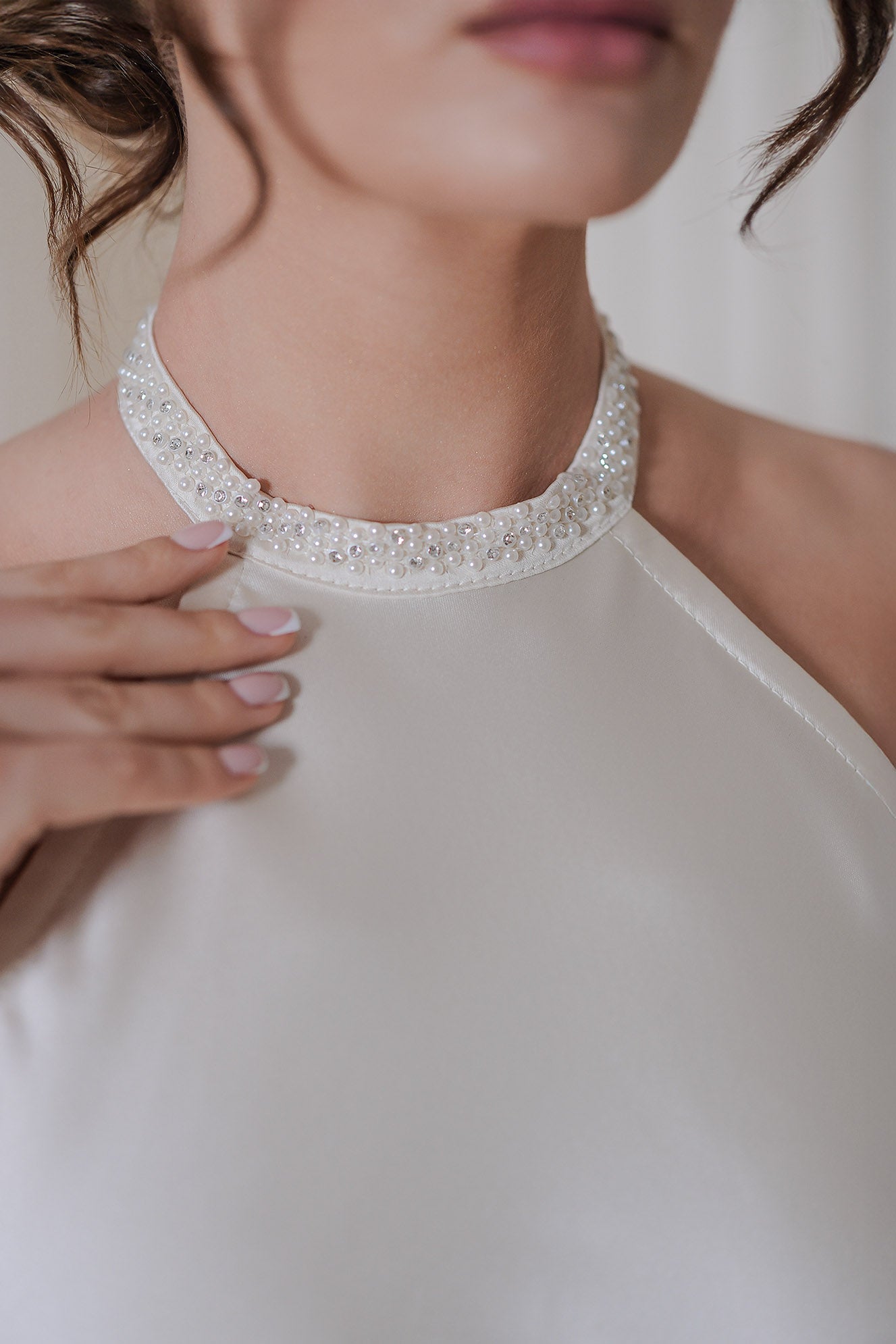 Delicate, feminine dress, made of light ivory satin. Long, freely falling down. With an open back. The straps are covered with crystals and merge at the back. Can be made in another color or according to the individual measurements of the client for an additional payment of 15% of the price.