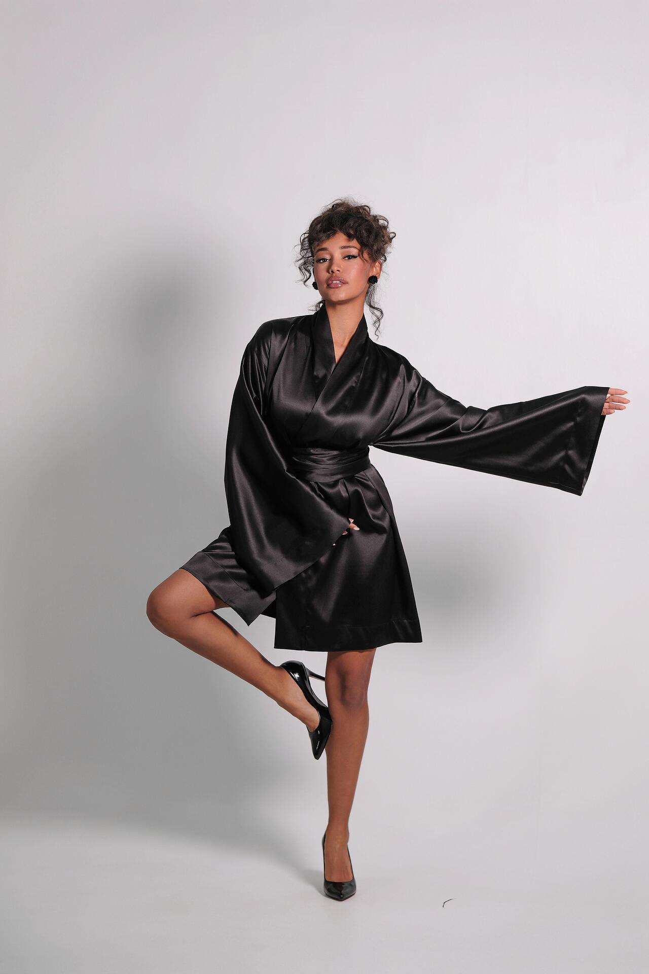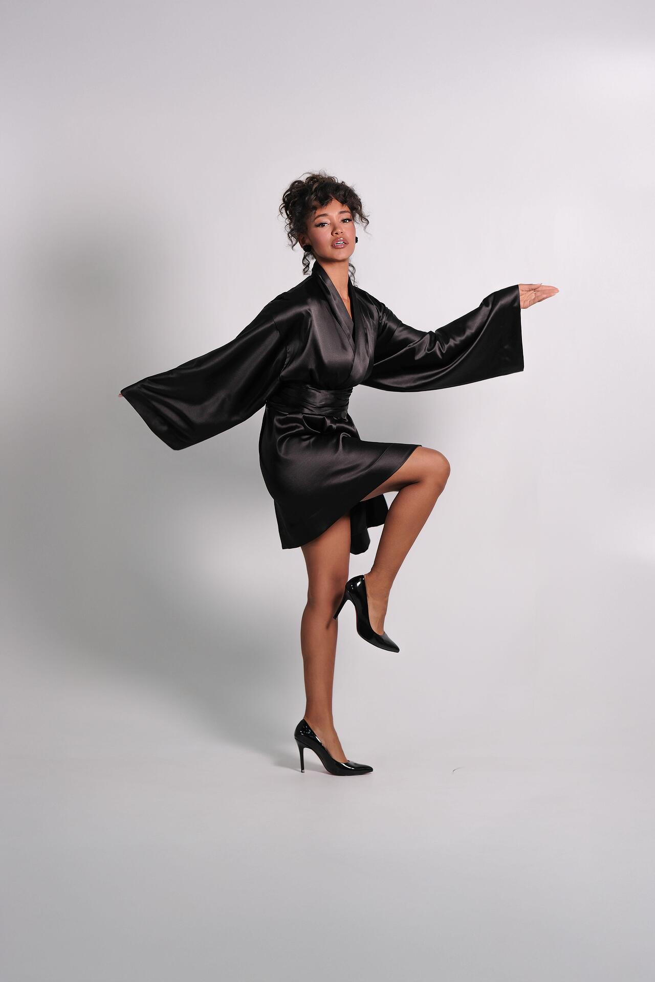 For lovers of comfort, but also stylish clothes, the Kiko dress is ideal. Made of soft and thick Russian satin, it caresses the skin and allows it to breathe. With loose sleeves and a belt to tie according to your preferences.