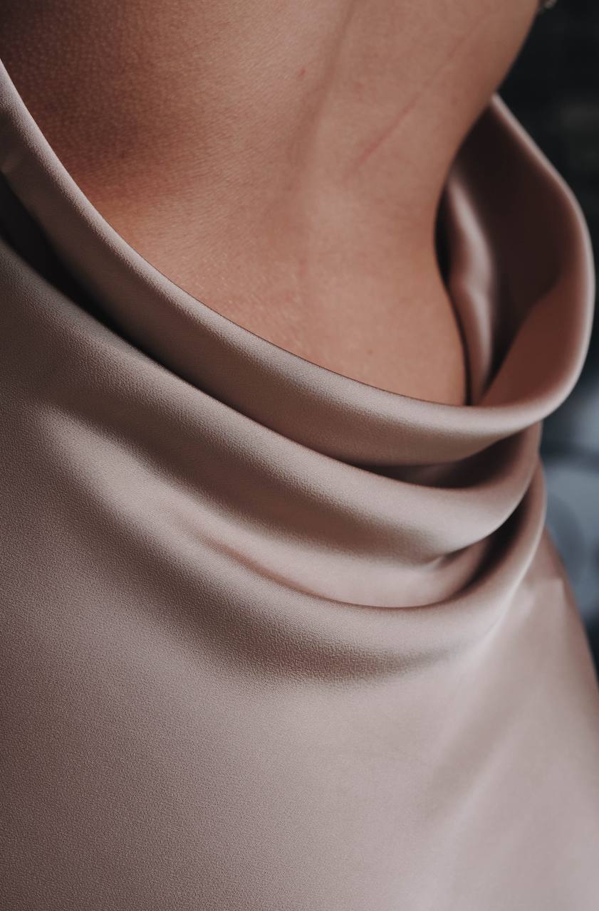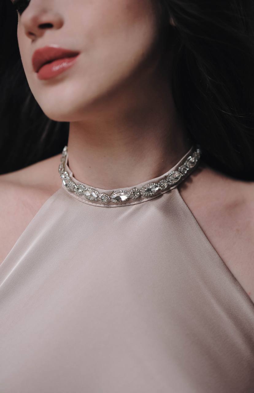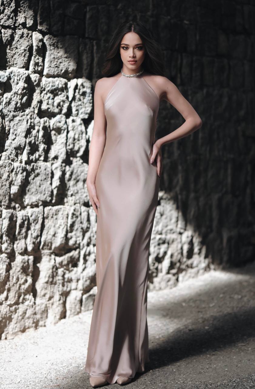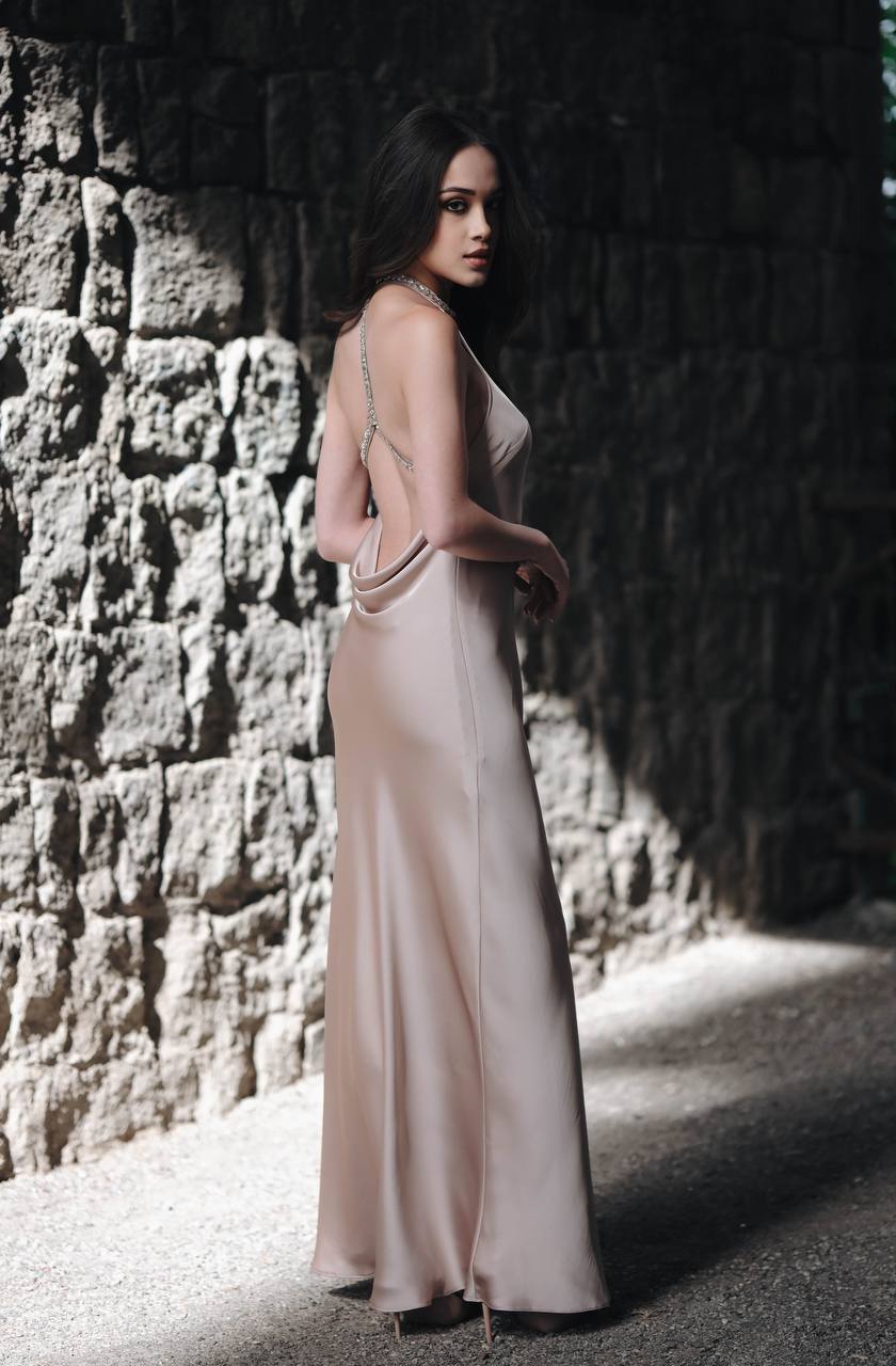 Delicate, feminine dress made of light satin. Long, freely falling down. With an open back. The straps are covered with crystals and merge at the back. The size is one - universal - XS-M.