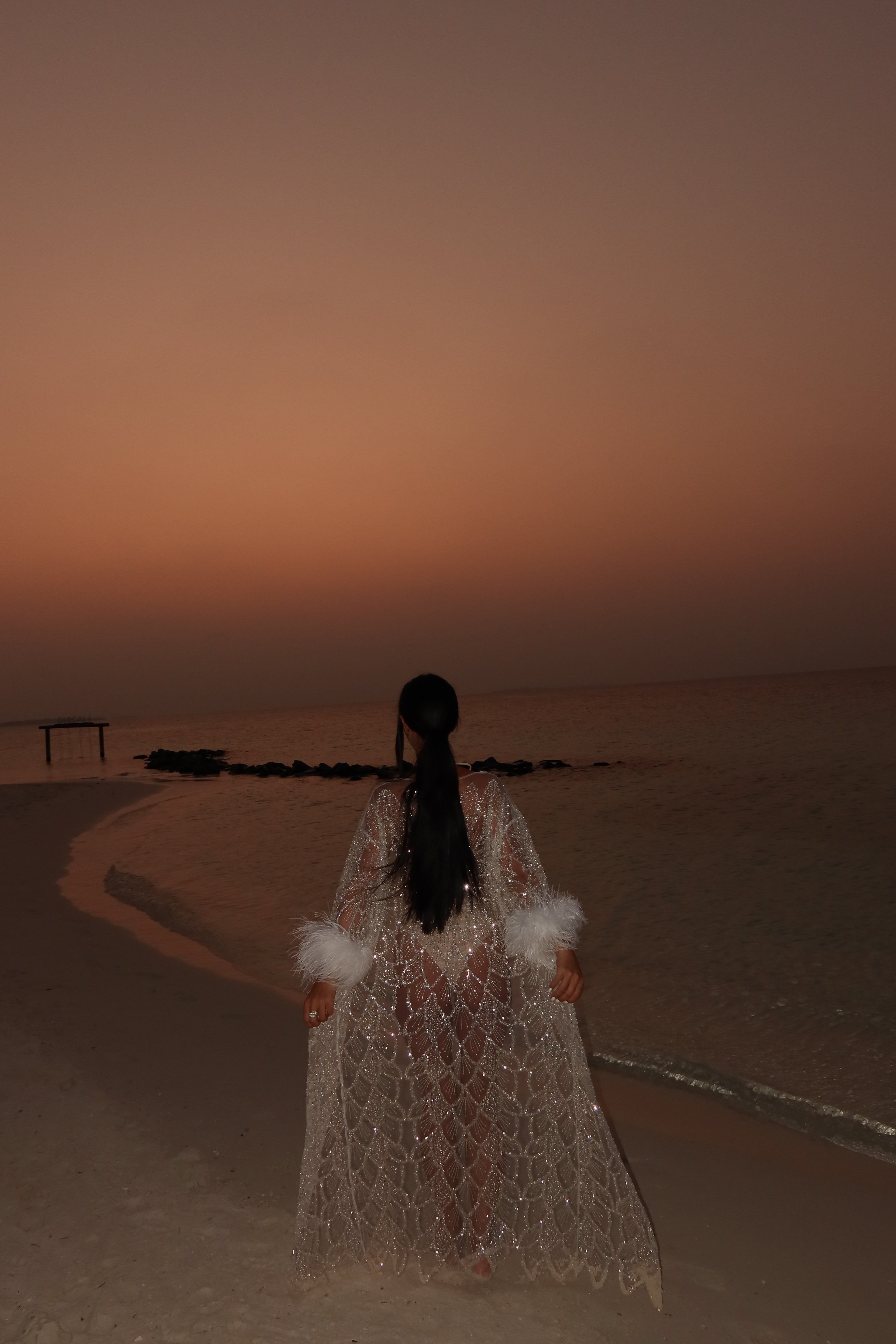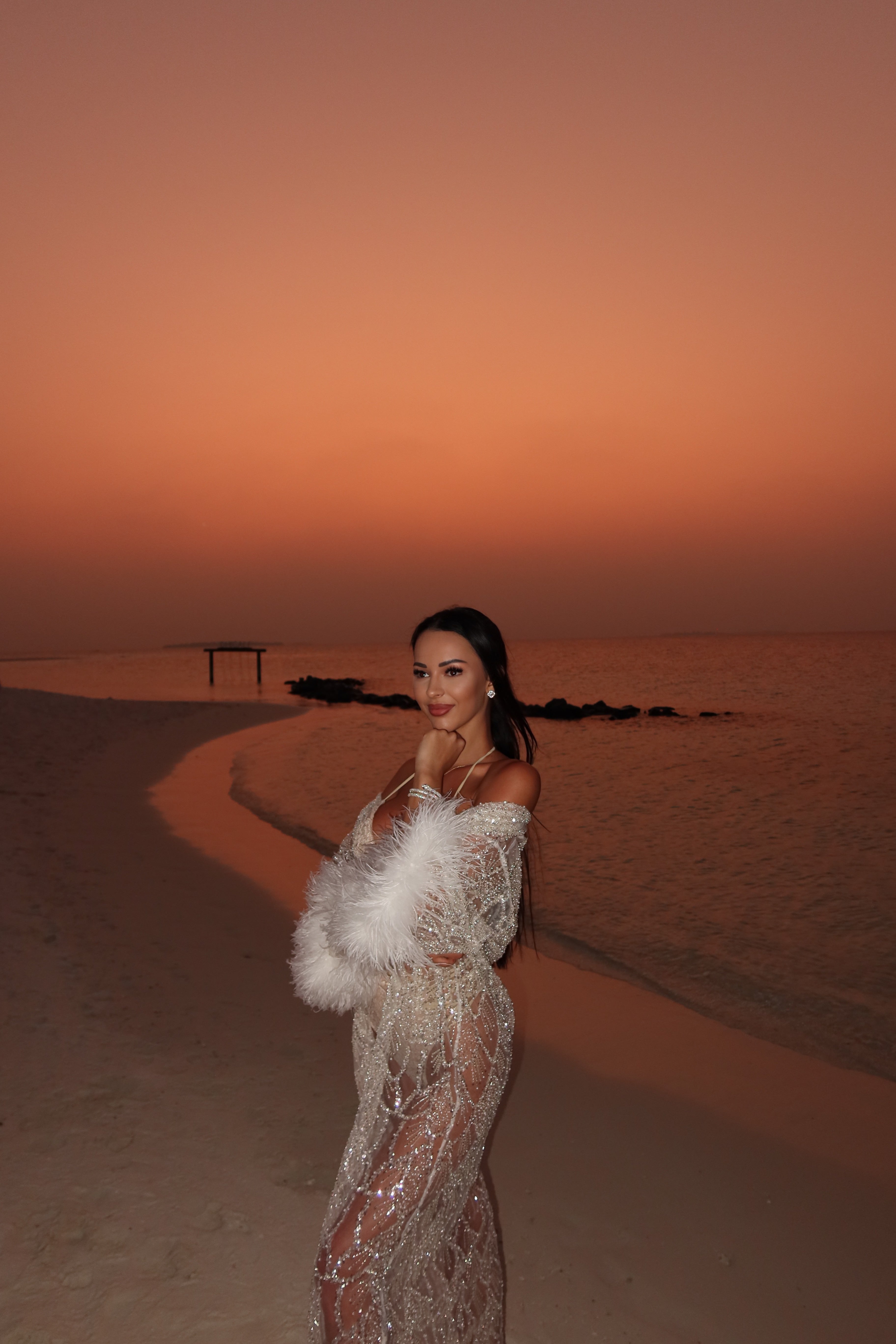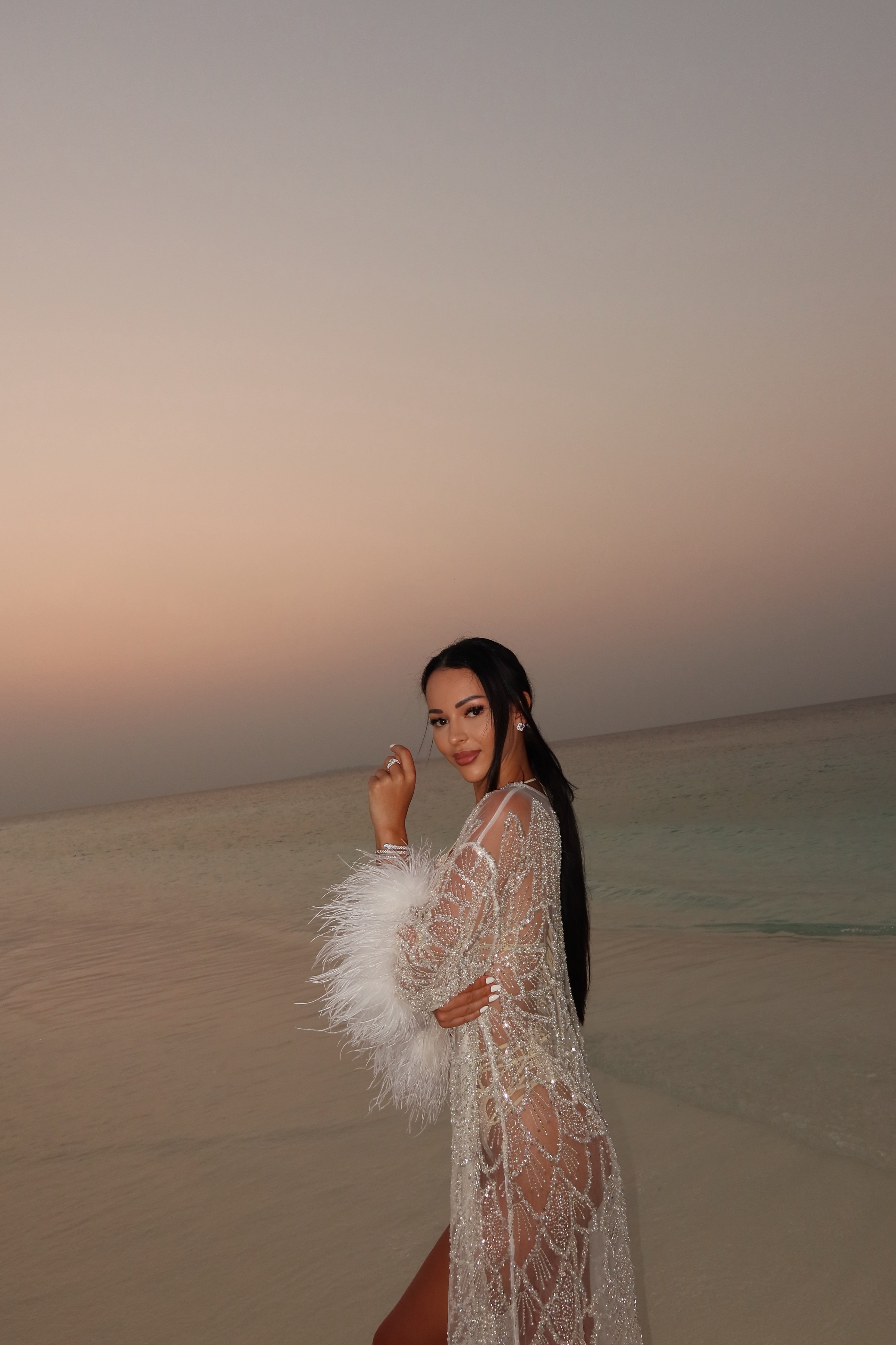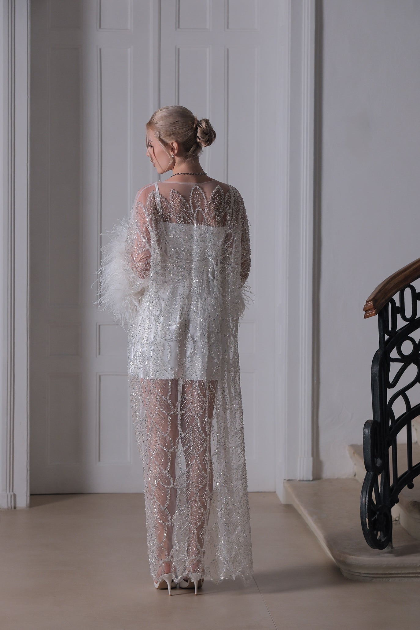 Изискана жилетка, особено подходяща за луксозни вечерни събития. Изцяло ръчна изработка. Жилетката е със свободна кройка, от мрежеста полупрозрачна материя, изцяло обсипана с блестящи кристали и нежни пера по ръбовете на ръкавите.