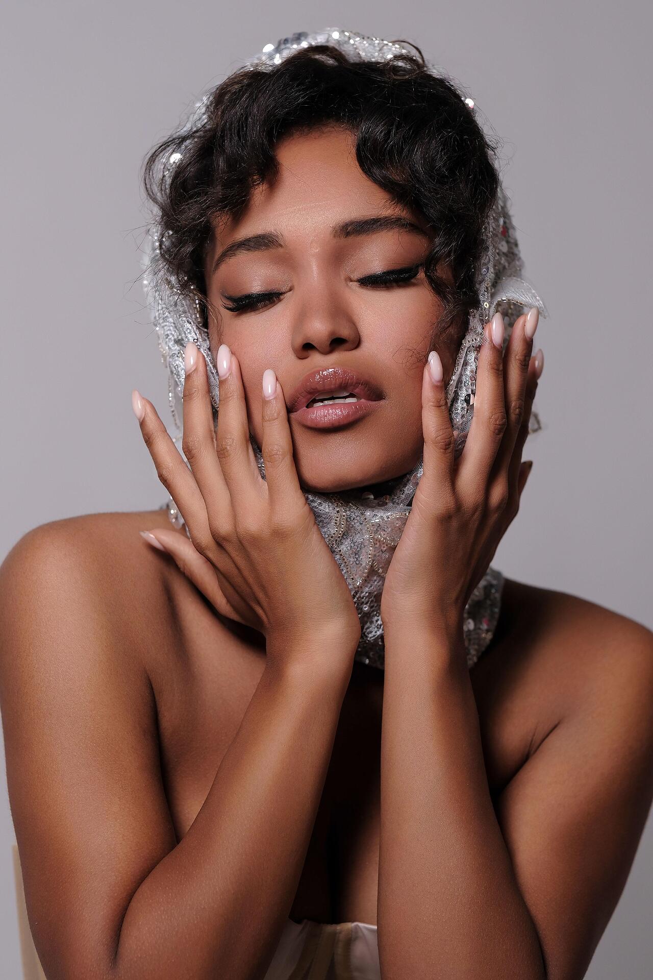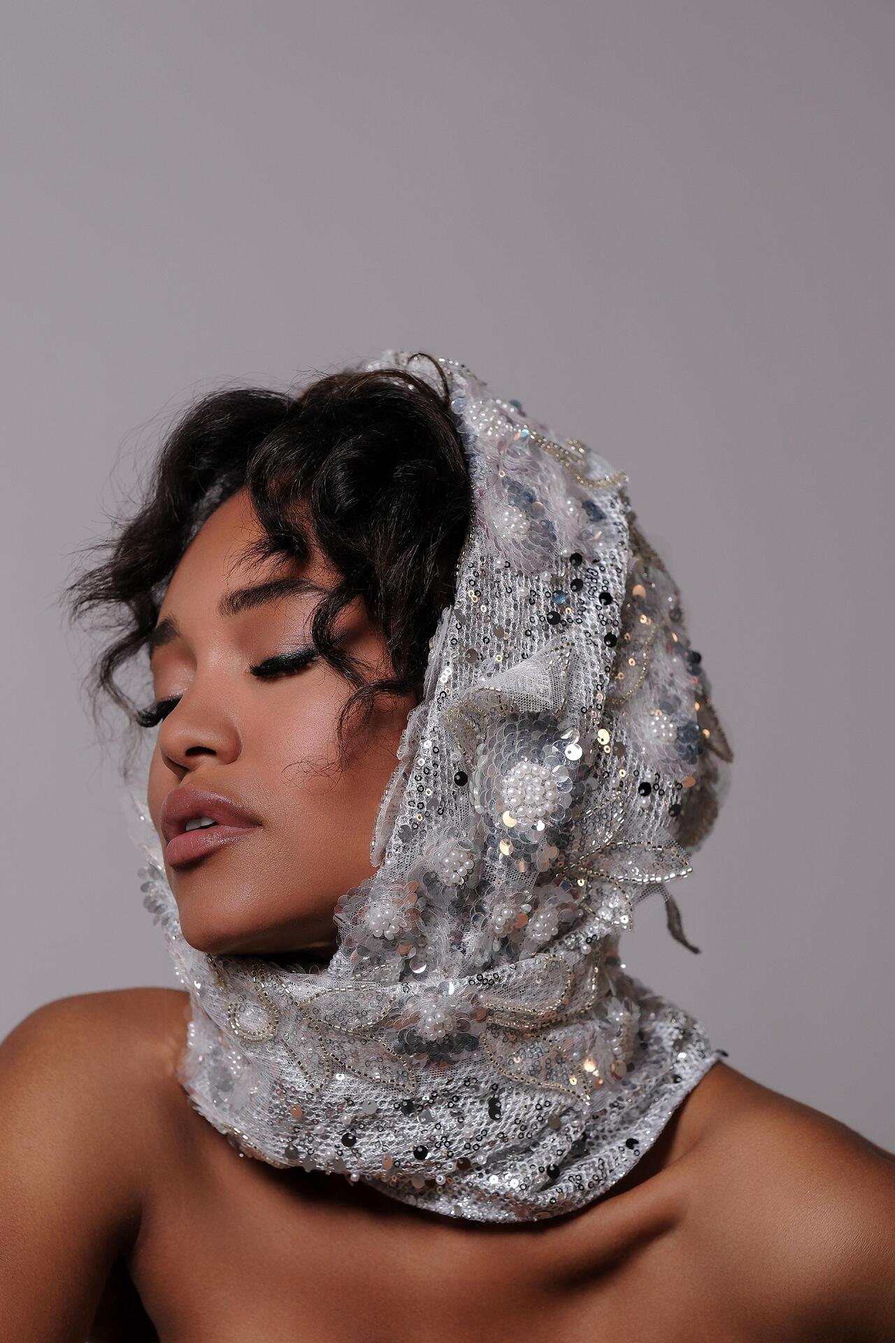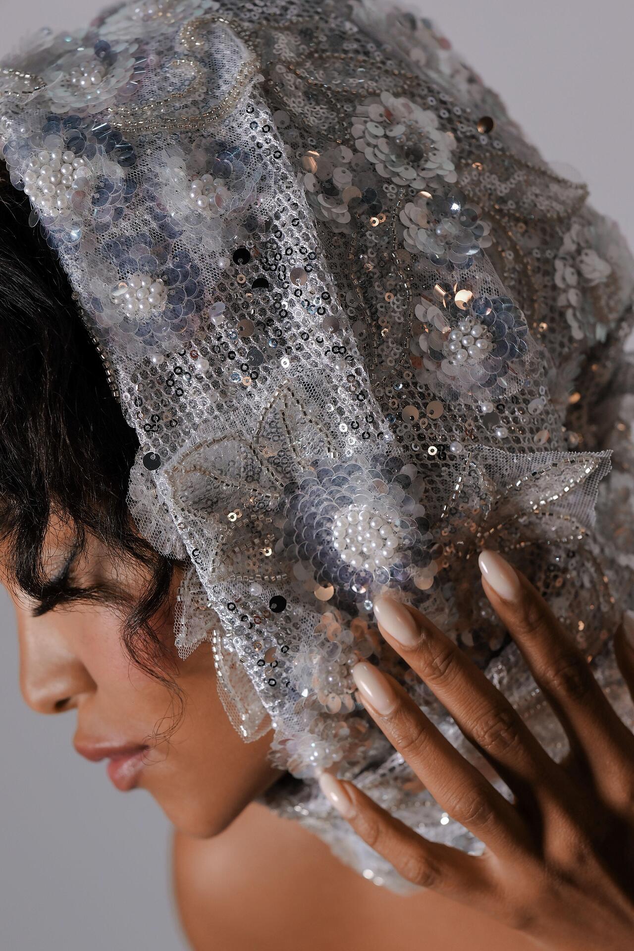 The accessory that is practical and stylish - a handmade head scarf with sewn-on sequin and bead details. Use its various applications and be stylish every day.