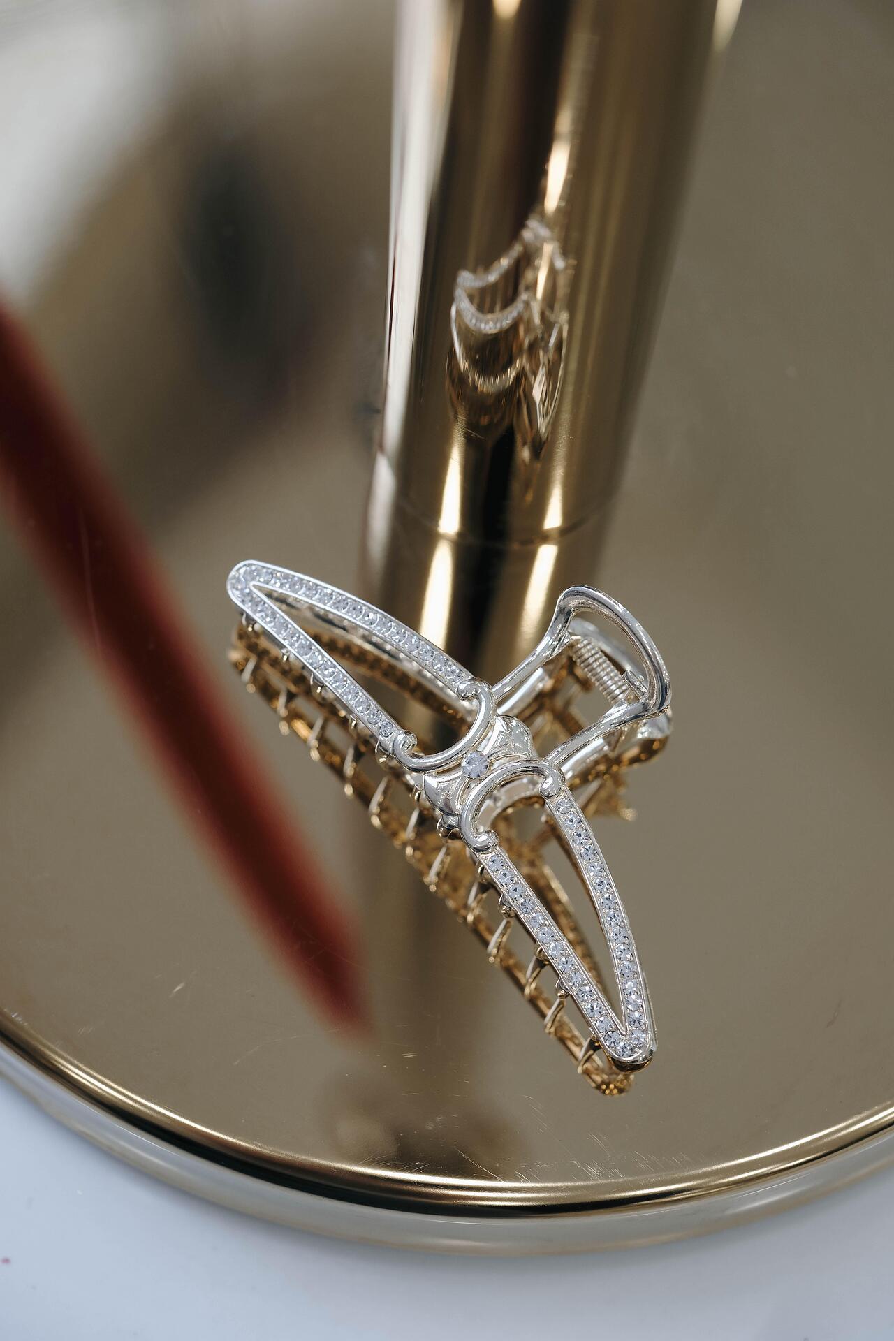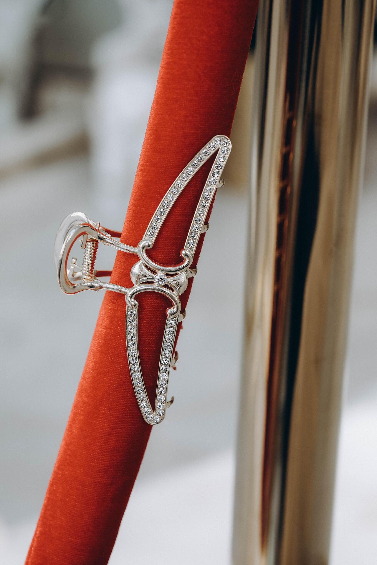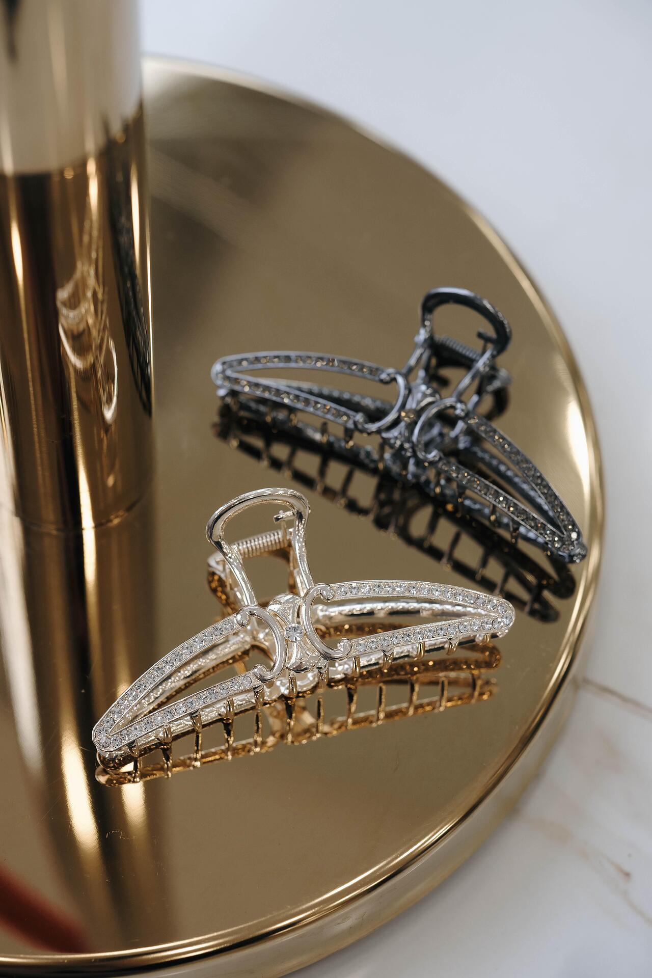 Stylish and elegant hair clip, made of silver metal and decorated with sparkling crystals. The design of the clip adds sophistication and shine to any hairstyle. The clip provides a strong and stable grip on the hair, while adding a visual accent.