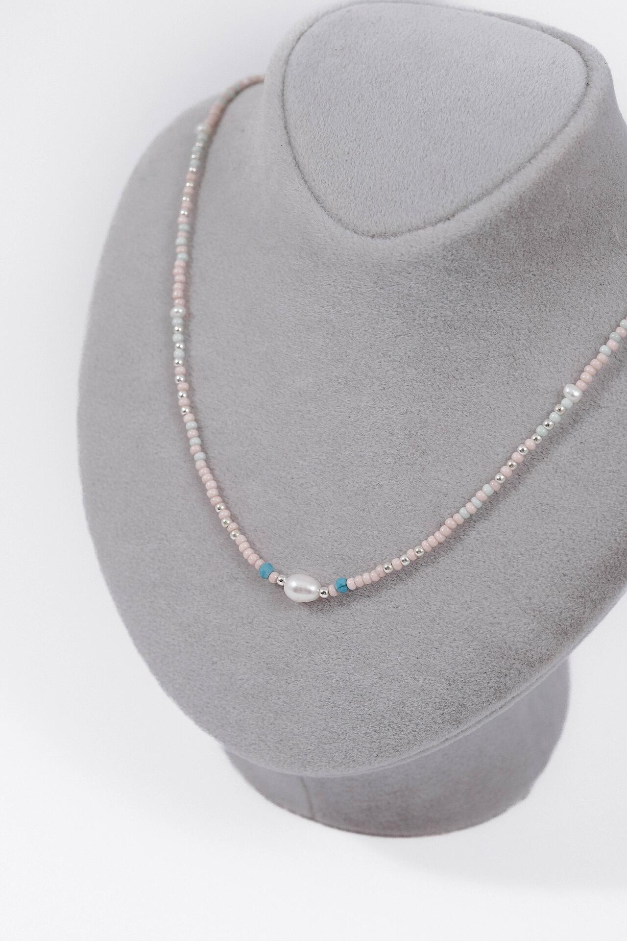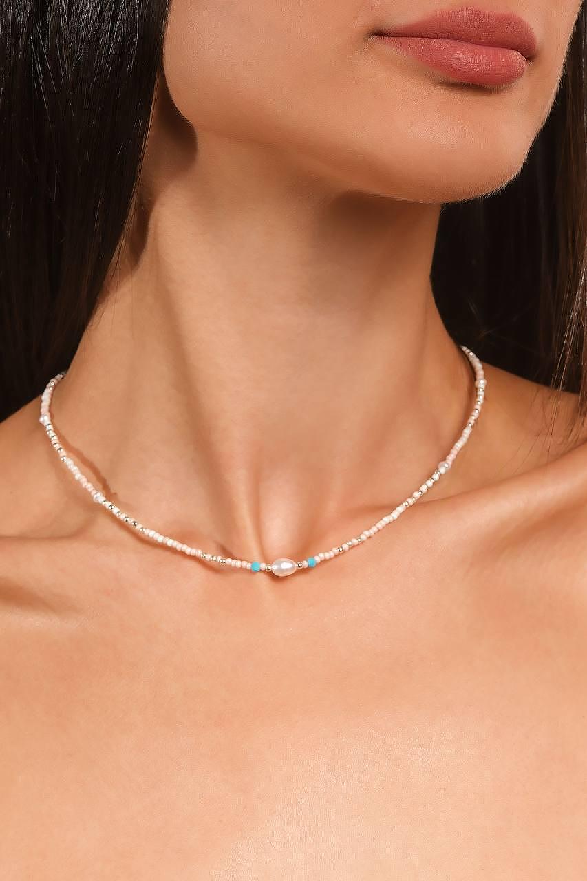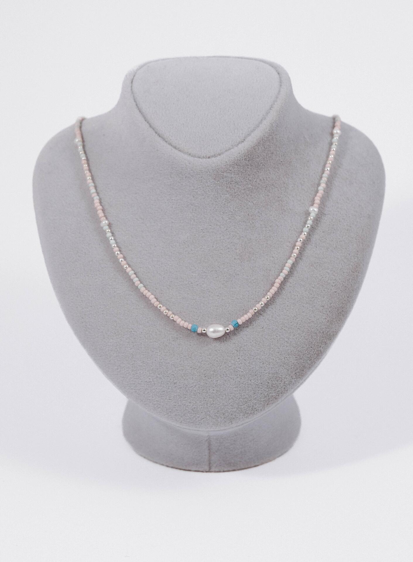 A necklace of delicate pink, white, turquoise and silver beads creates a feeling of delicacy and elegance. Suitable for both everyday use and special occasions. The necklace is made of high-quality materials that ensure durability and comfort when wearing. Its light weight and convenient clasp make it easy to put on and take off.