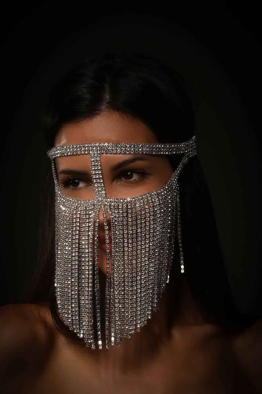 An impressive mask made of silver ribbons with numerous sparkling crystals. The mask has fringes that gently fall on the face, adding a dramatic and mysterious effect. The design is suitable for special events such as balls, theme parties or photo shoots, attracting all eyes and creating a feeling of luxury and elegance. The mask has an adjustable fastening, which allows for a comfortable and stable wear.