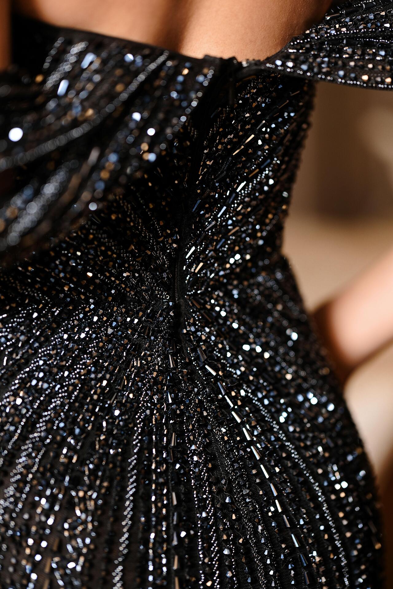 This exclusive evening dress is made of elegant black fabric, richly decorated with sparkling crystals and sequins, which create unique wavy patterns. With its sophisticated and fitted design, it emphasizes feminine shapes. The deep V-neckline and spectacular dropped sleeves give the dress additional grace. It has a high slit and built-in cups, and it fastens with a zipper at the back.