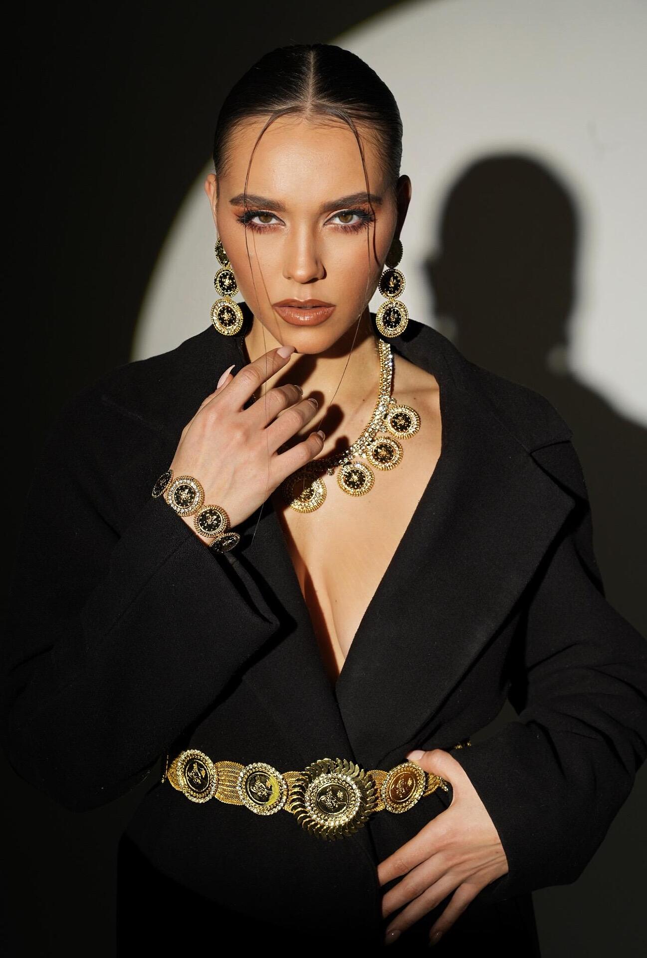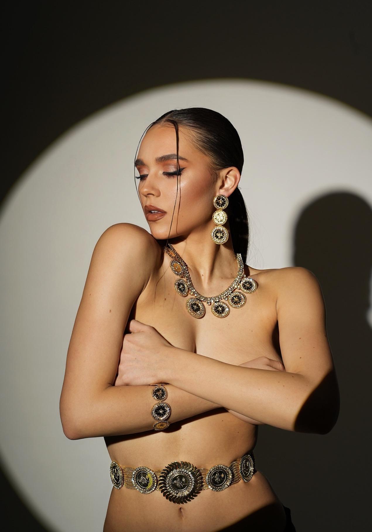 A golden set of earrings, a necklace, a bracelet and a belt with crystals and ornaments. The necklace and the belt are adjustable to your desired size. Suitable for different types of occasions. They can be worn both separately and as a set.