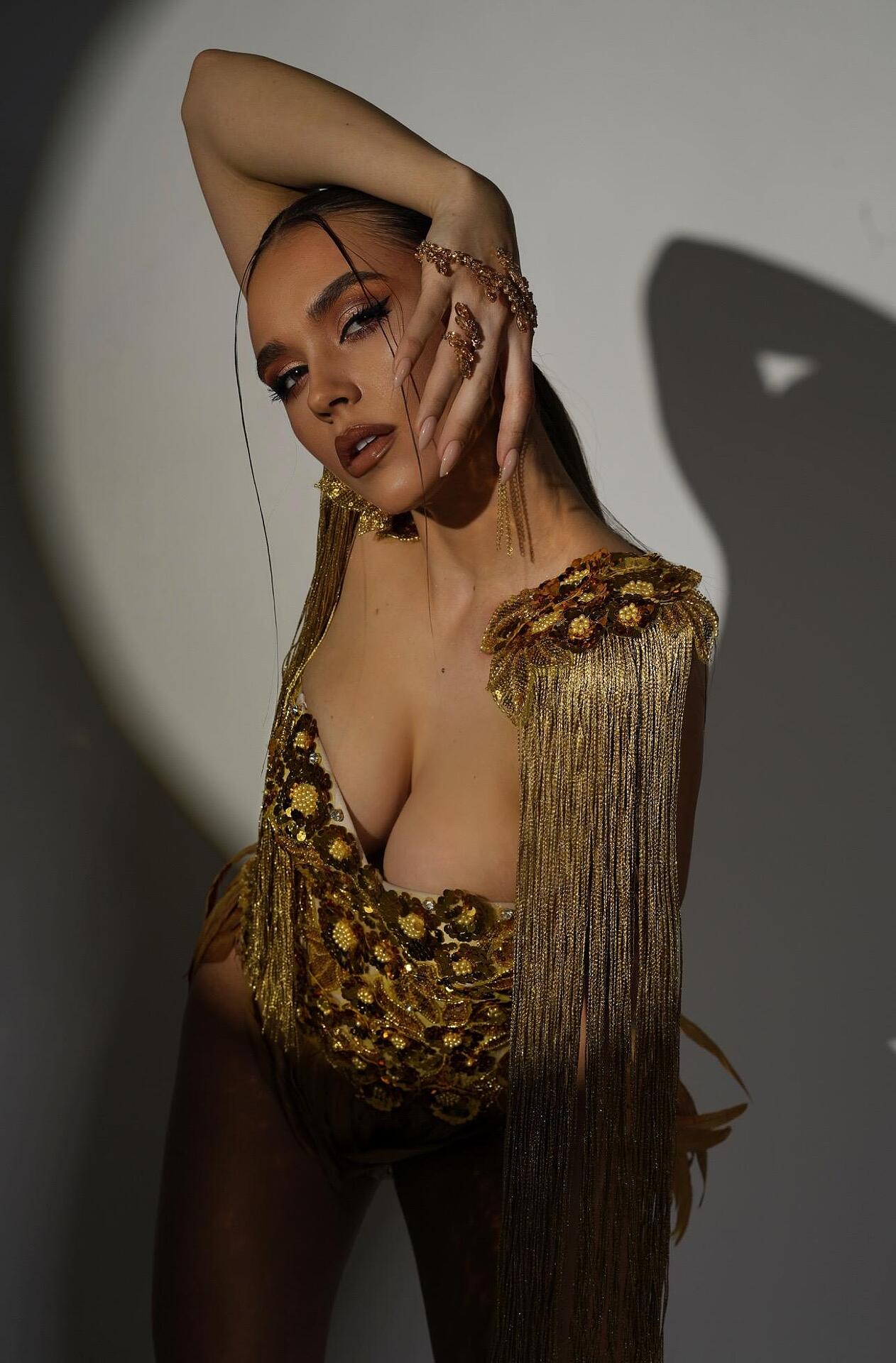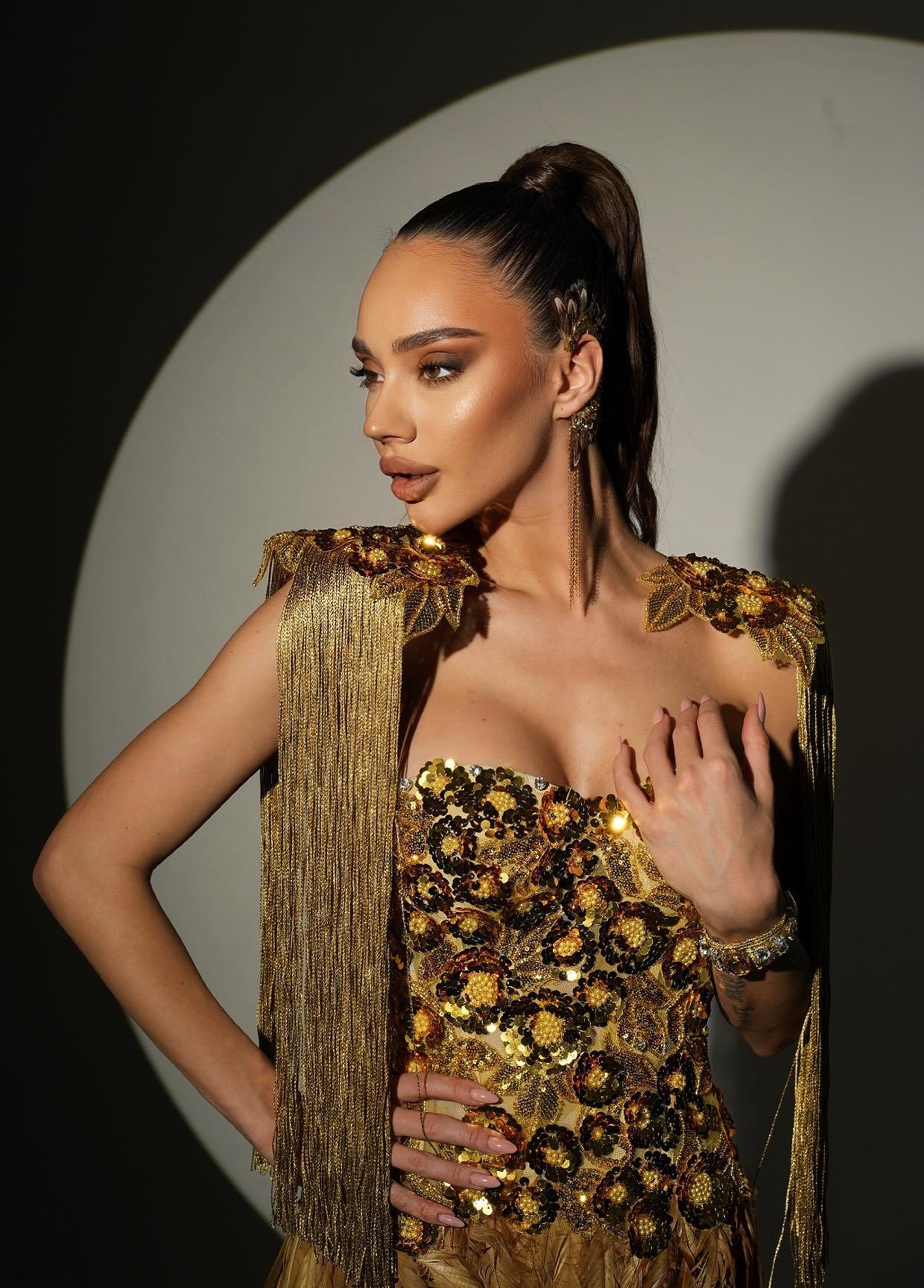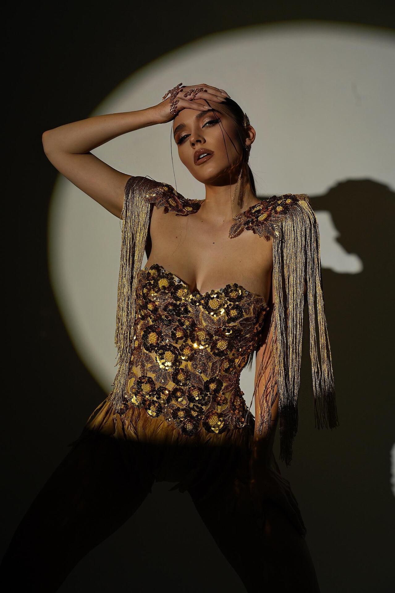 Unique designer dress in 3 parts, corset, shoulder accessory and skirt. Hand-sewn corset with gold beads, sequins and crystals, the corset has hard cups. Shoulder accessories with gold sequin embroidery and long hanging textile threads. The skirt has natural golden feathers. Made of high quality materials.